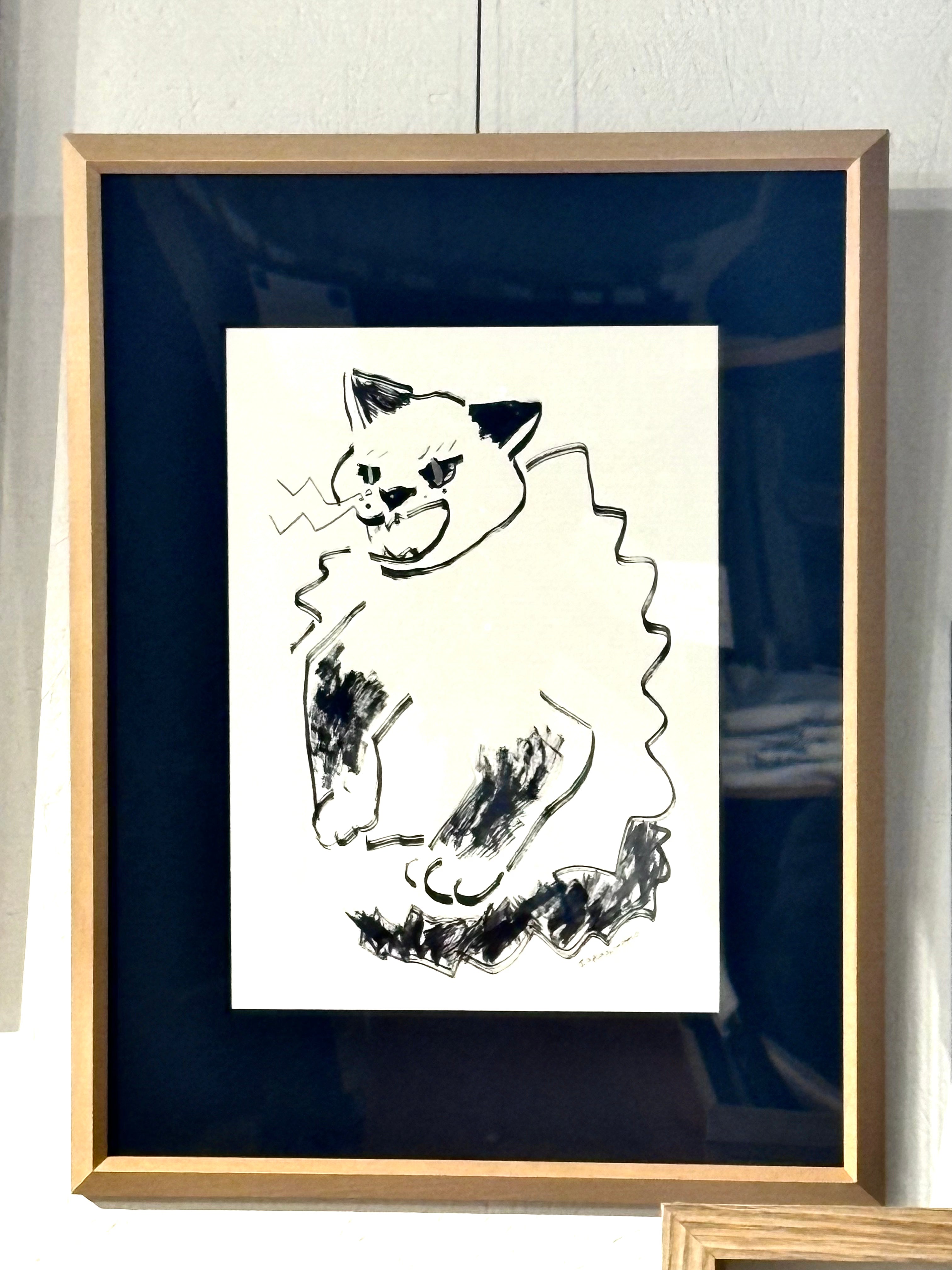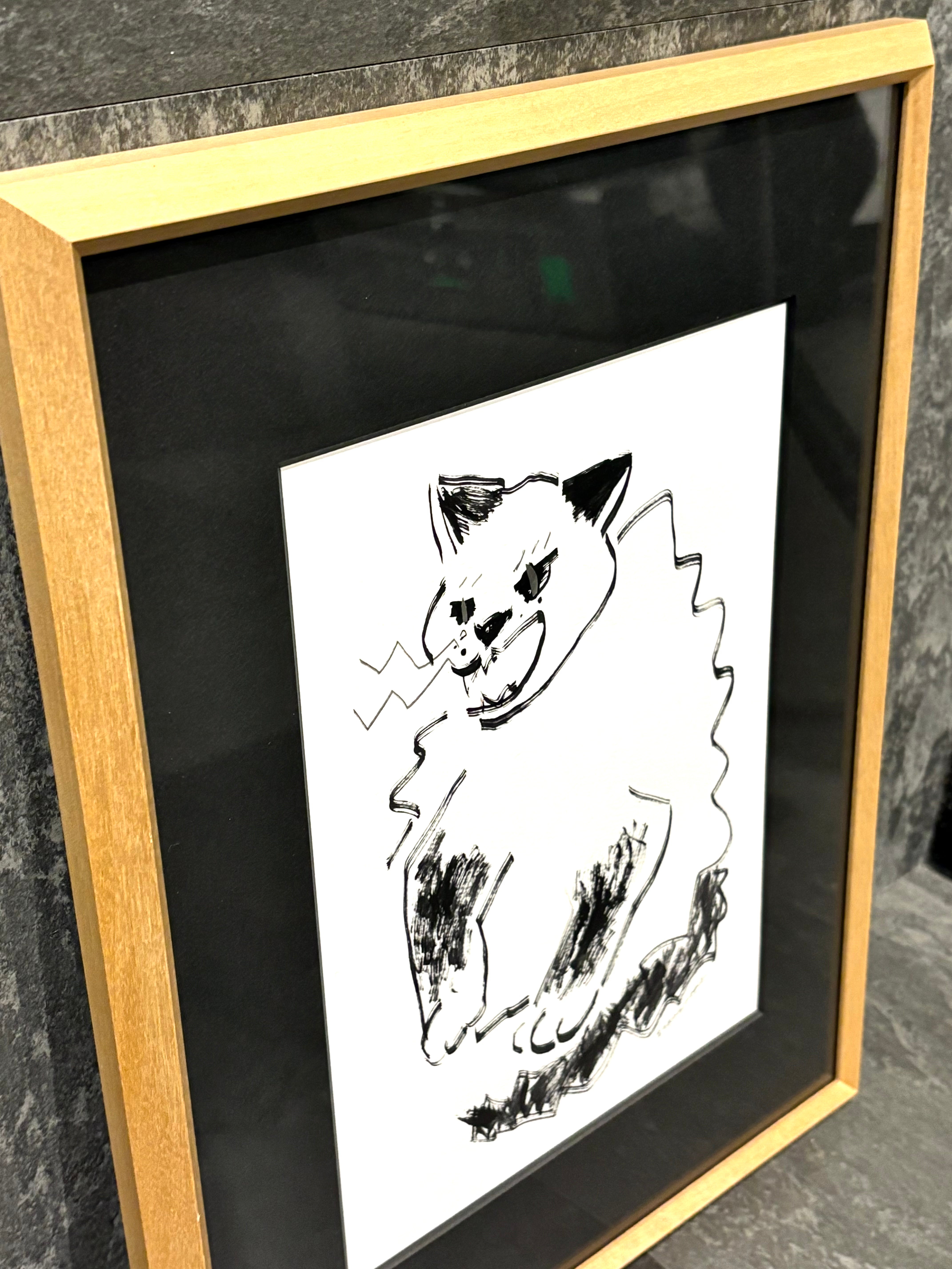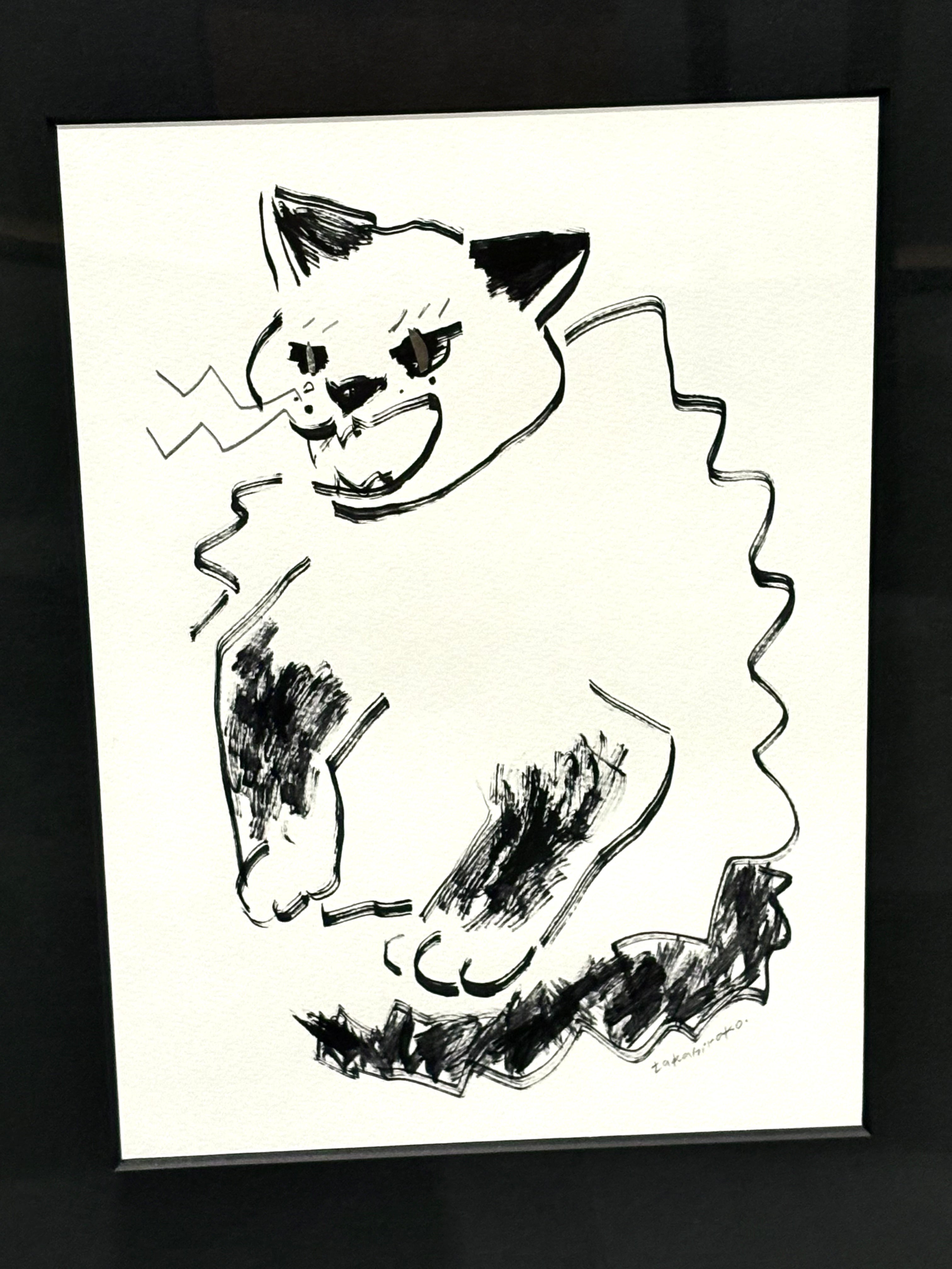 ピリピリとした雰囲気を感じさせる猫の表情や描かれたジグザグの線が、怒りの感情を巧みに表現しています。