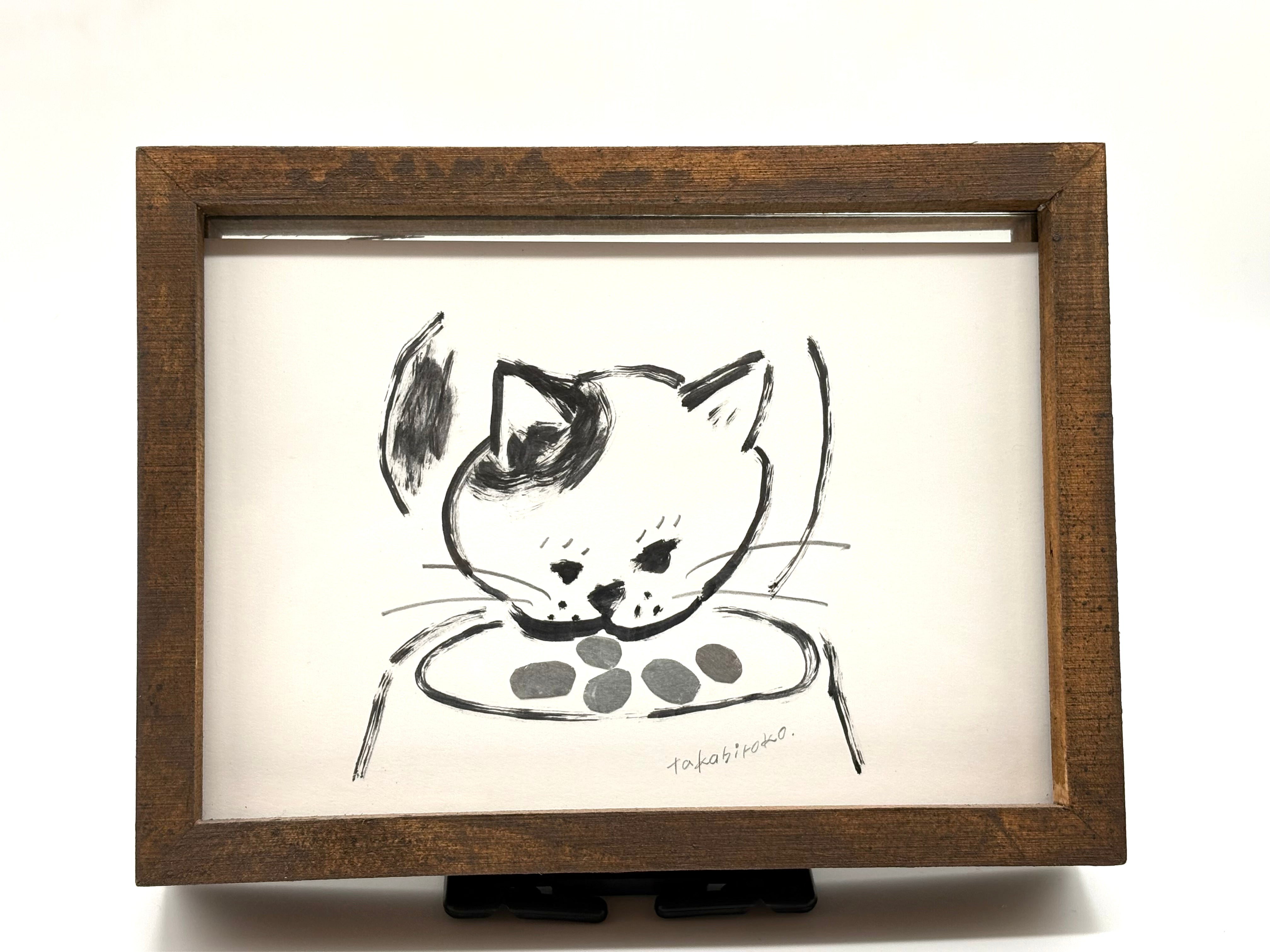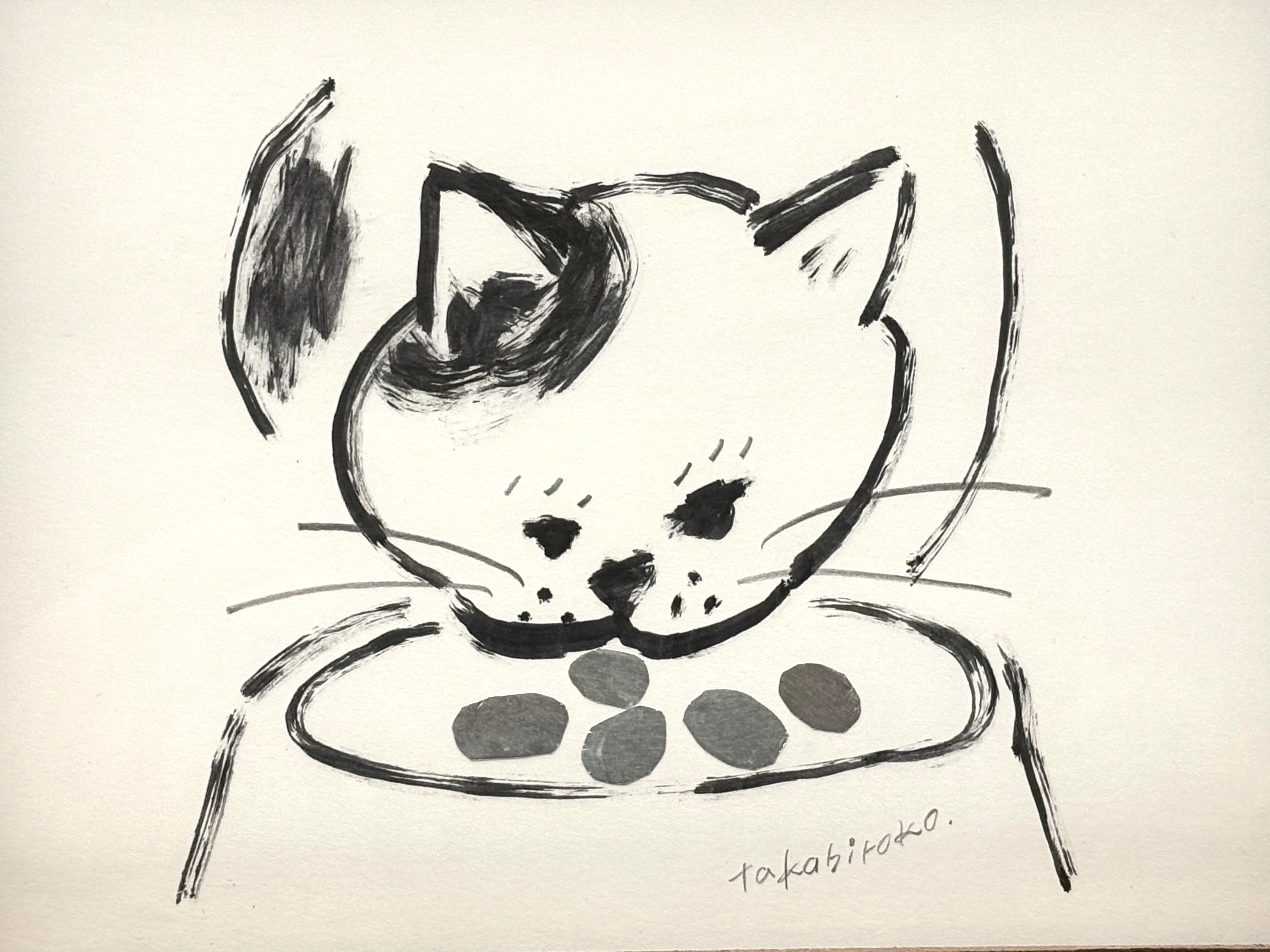 片面には、ごはんを食べる猫の集中した表情が、もう片面には、満腹で眠りについた猫の穏やかな姿が描かれています。