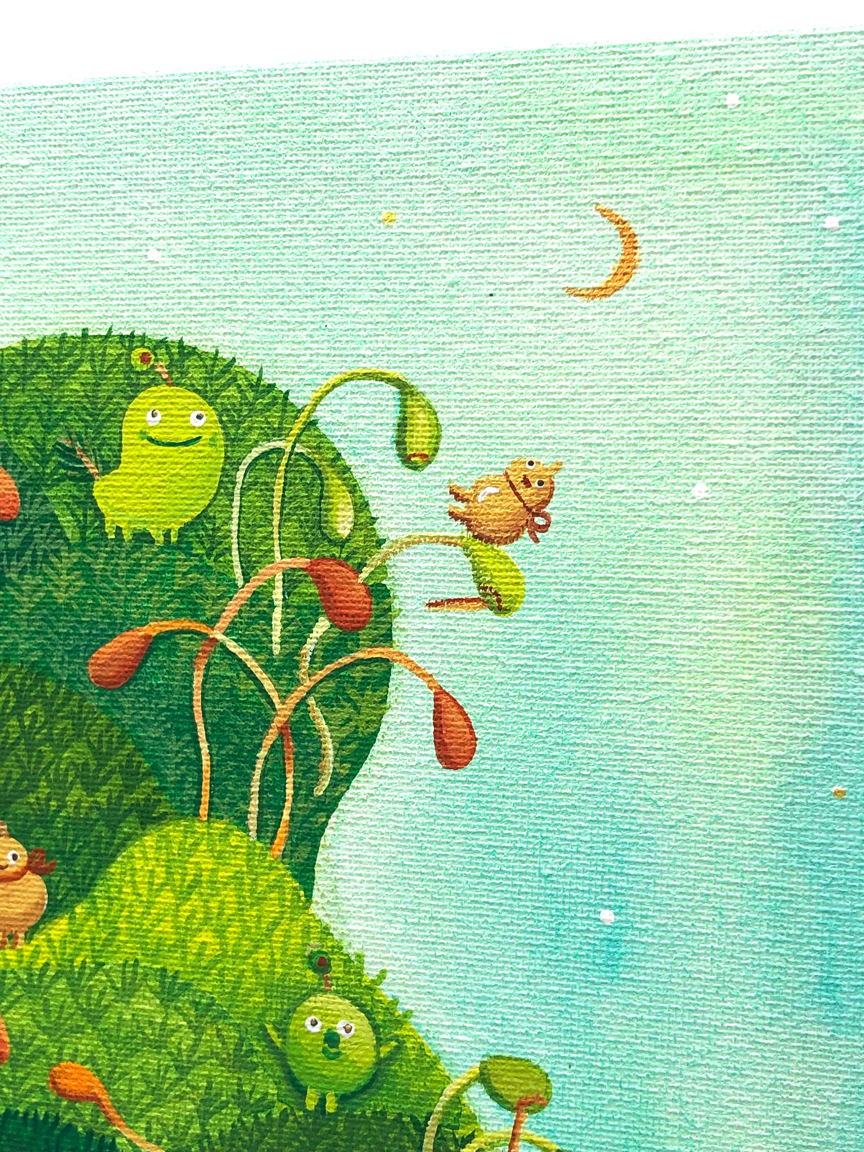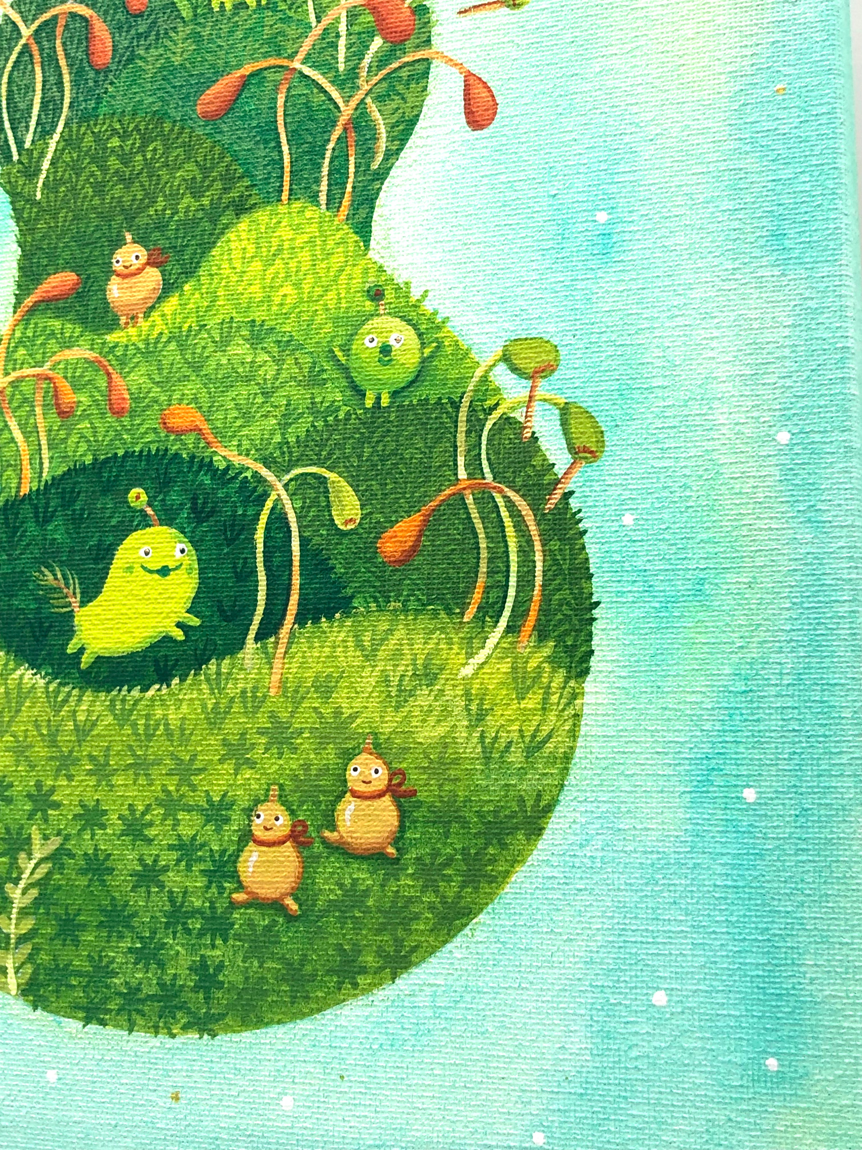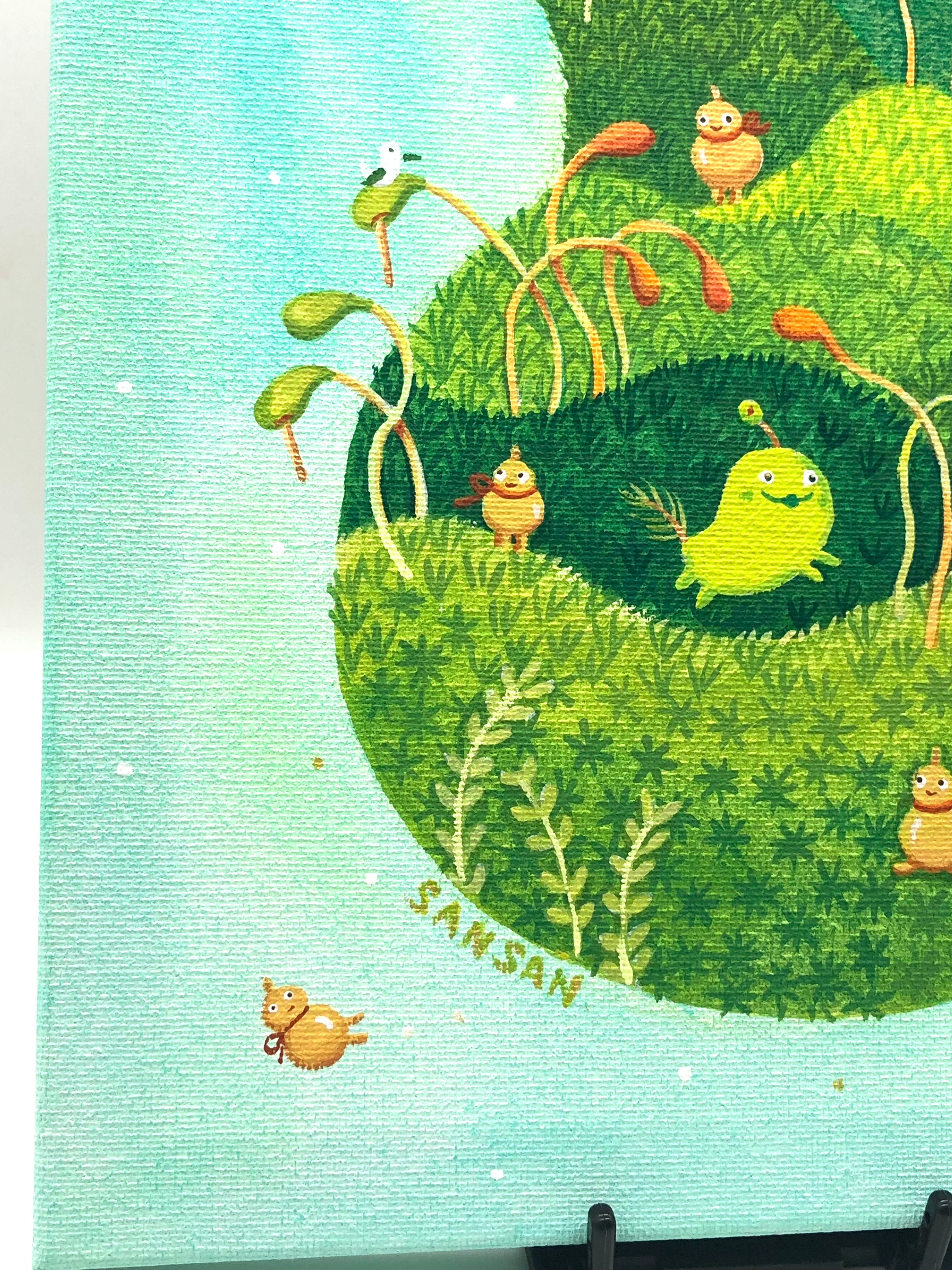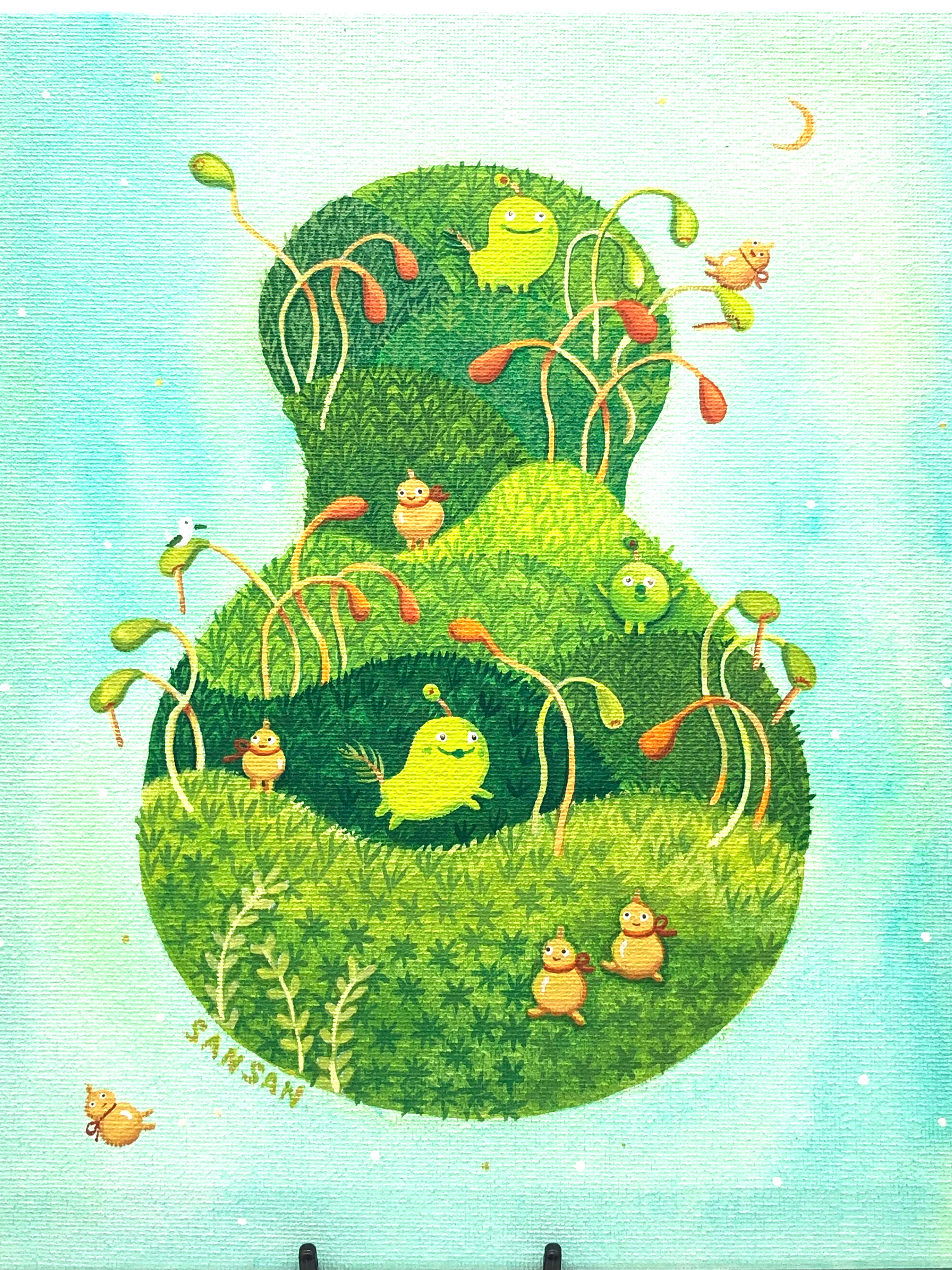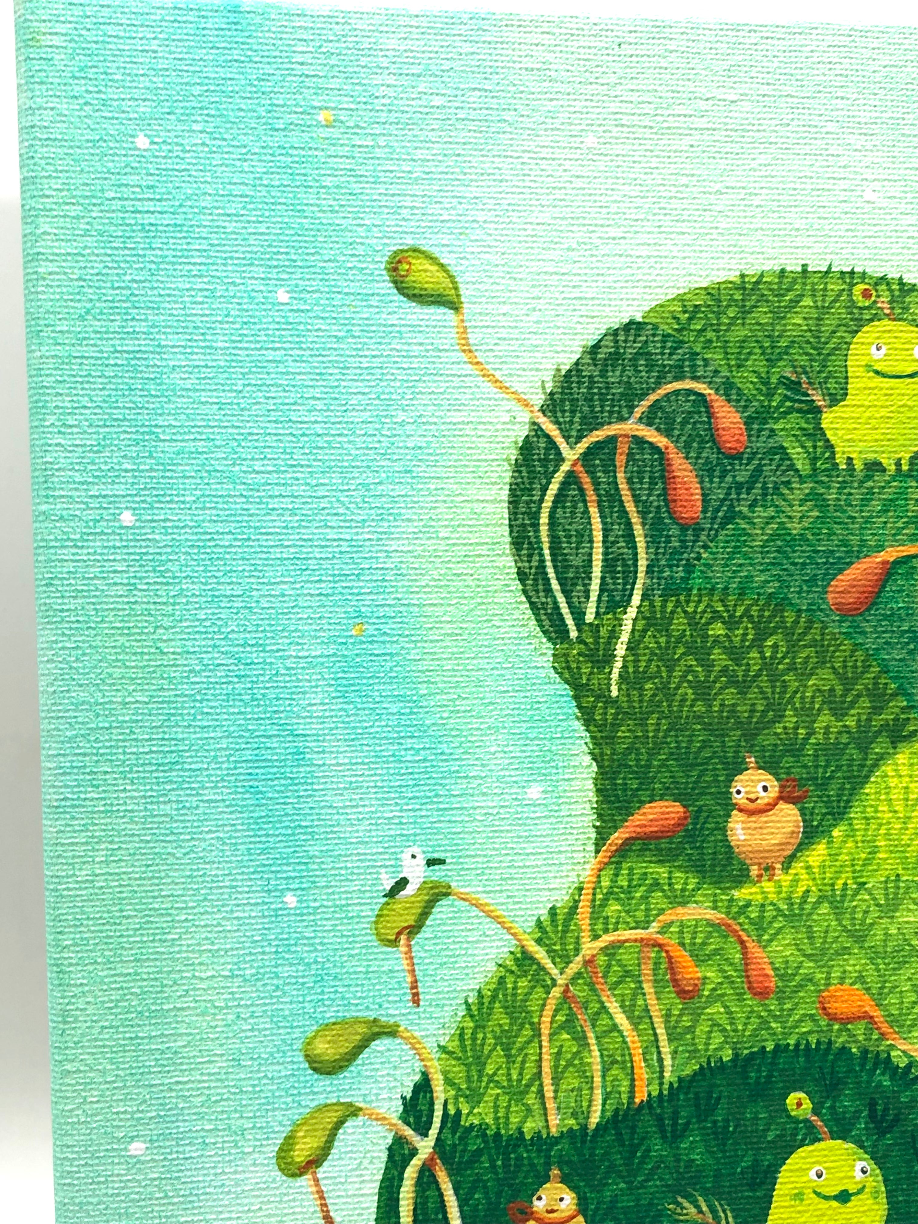 この作品「ヒョウタンゴケ島」は、自然の美しさとキャラクターたちの躍動感が融合した幻想的な世界を描いたものです。作品の中心にあるひょうたん型の島は、一面に広がる柔らかい緑の苔で覆われています。その中に、愛らしいキャラクターたちが生息しています。サイズ:273㎜×220㎜アクリルキャンバス