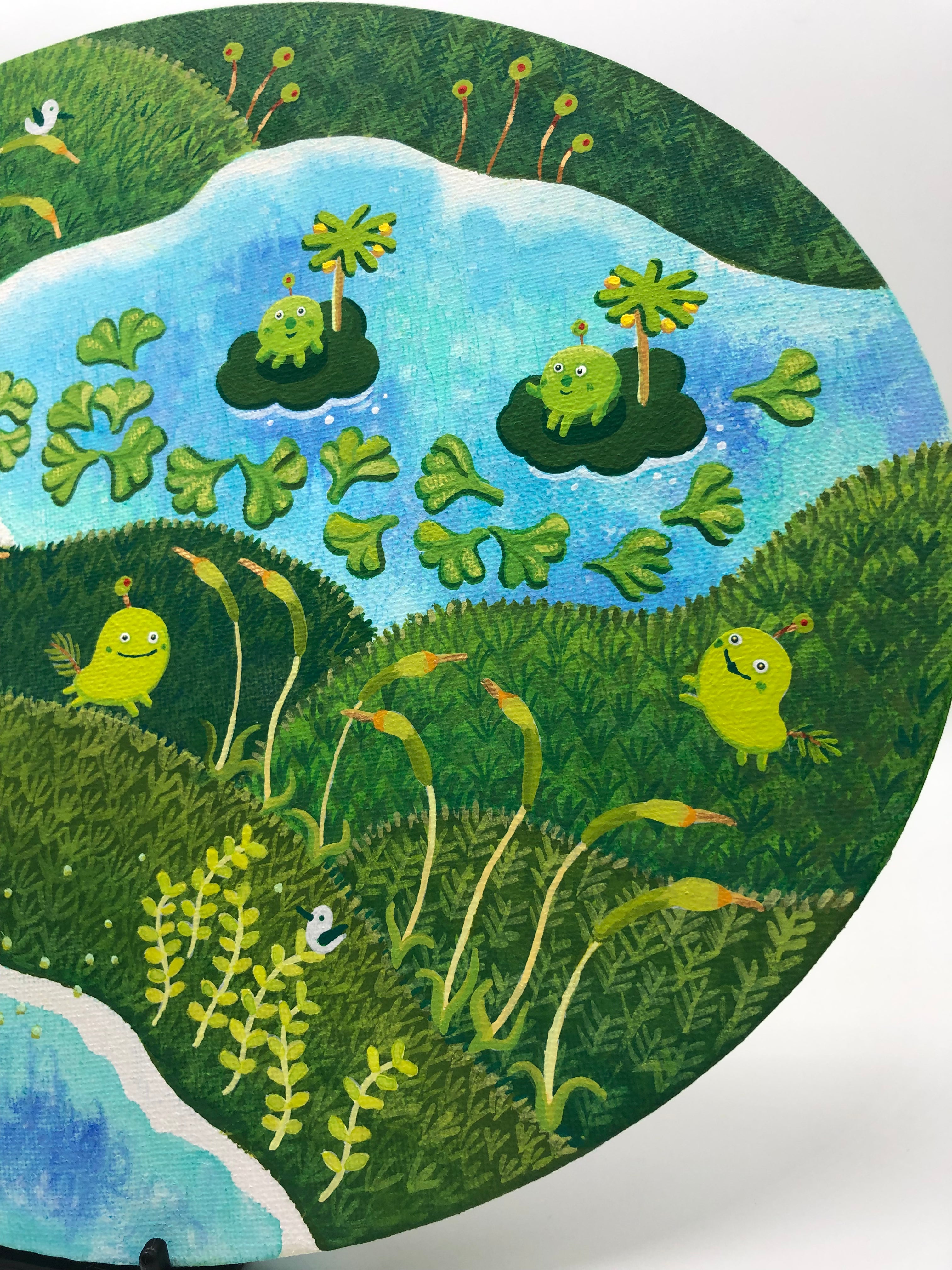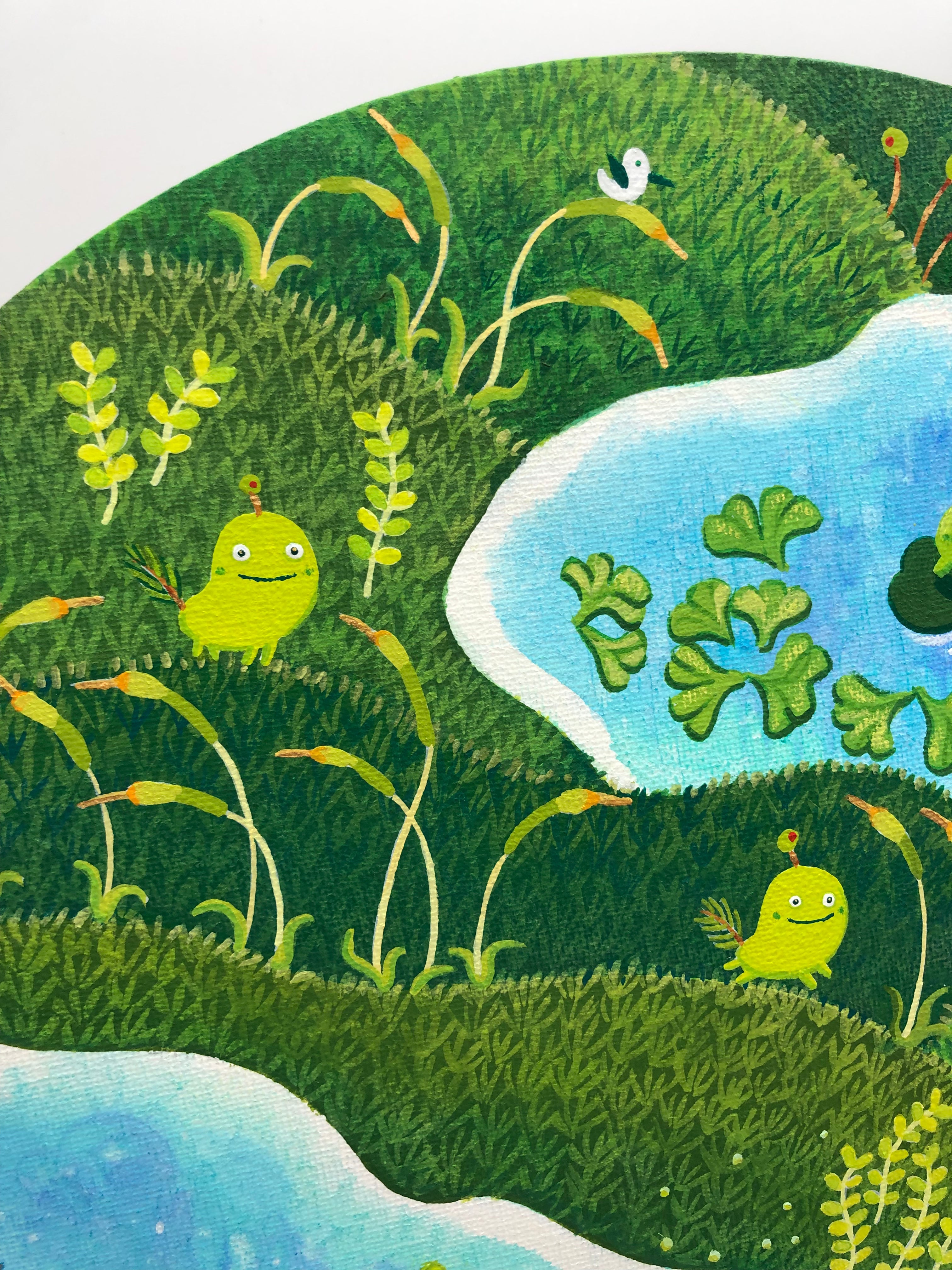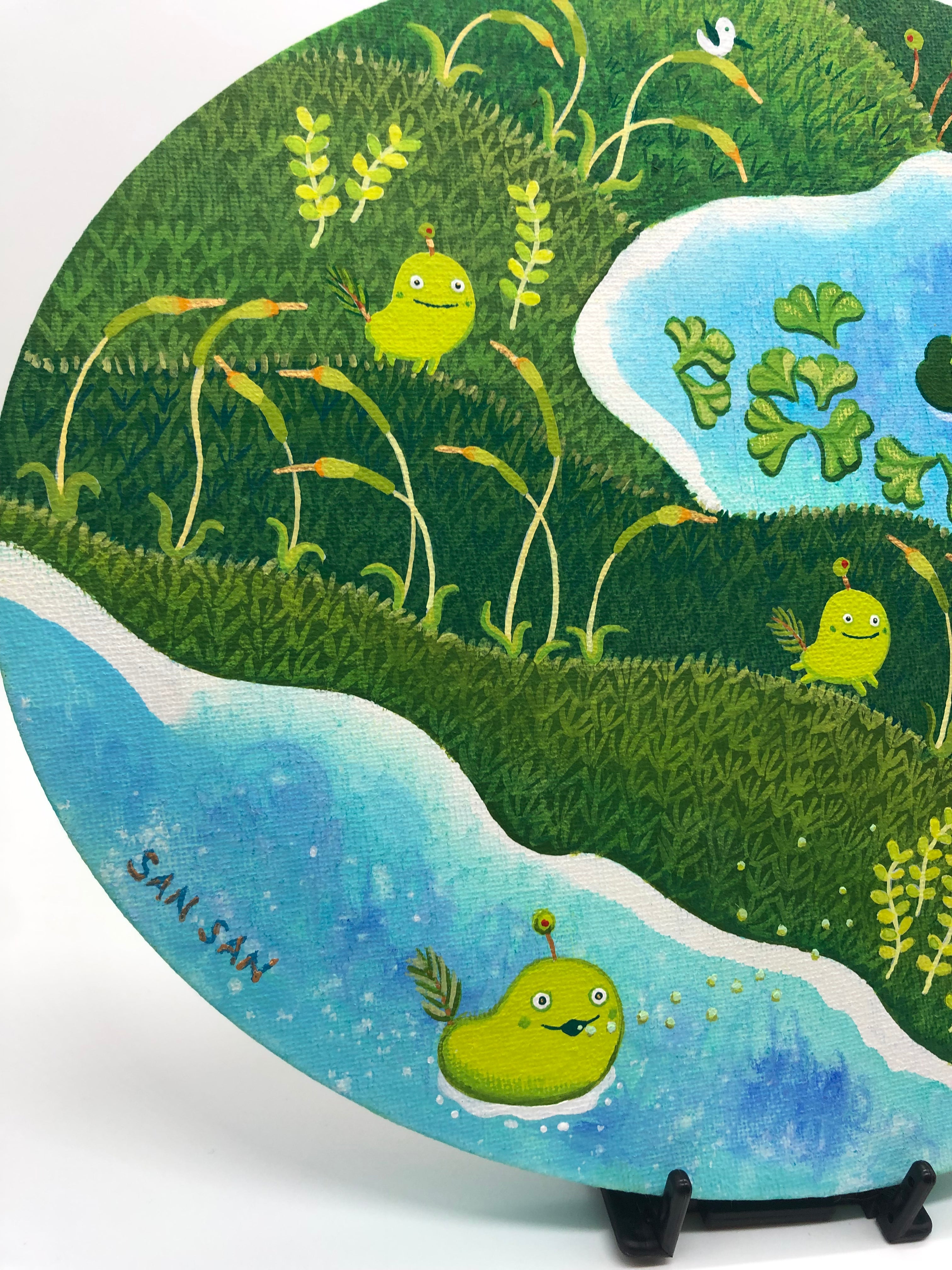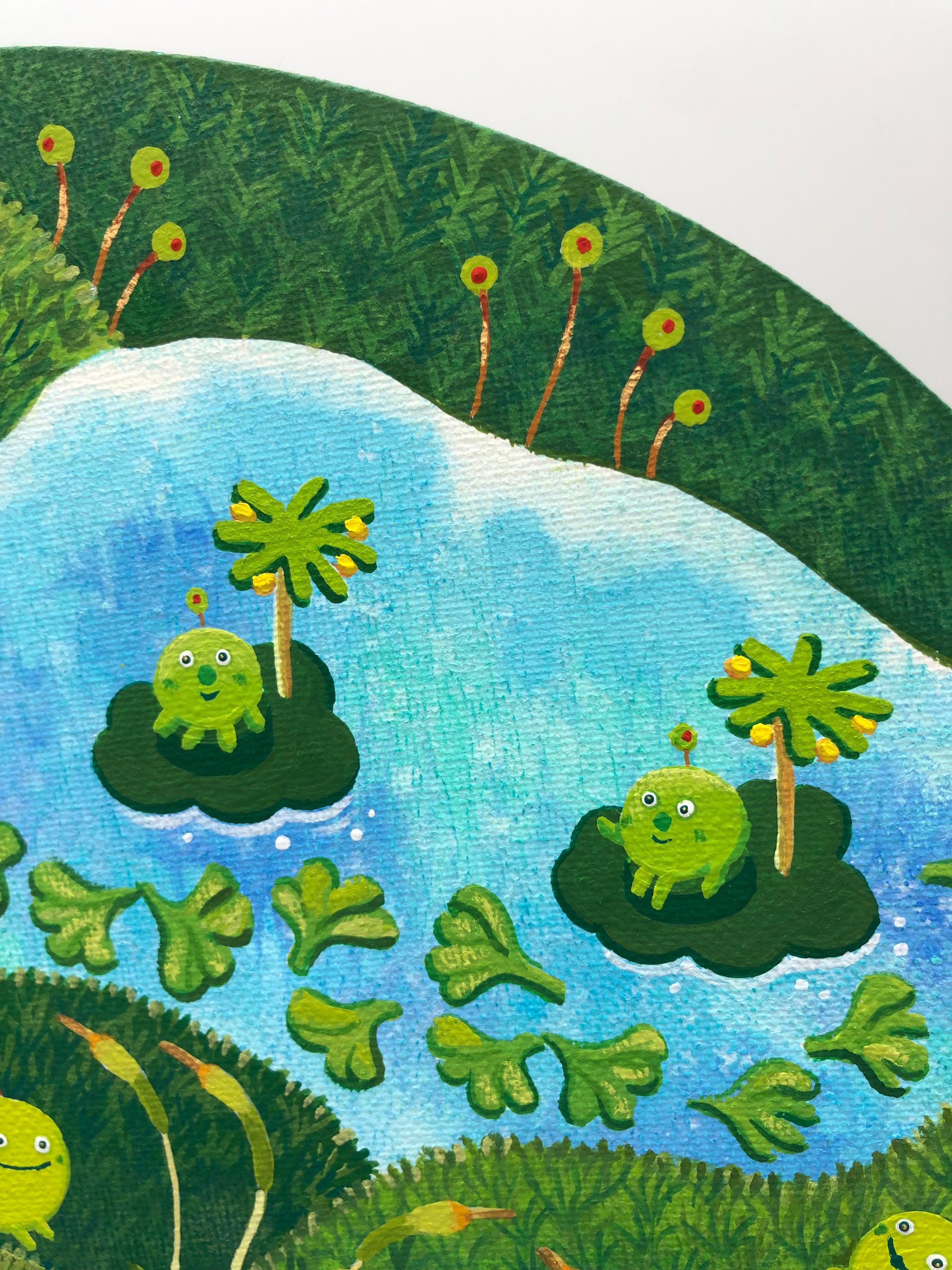島の中央にある湖は、「ユミダイ(弓型)」という名前の通り、弓のように美しい曲線を描いています。湖面には苔族たちが浮かぶ蓮の葉の上でリラックスしている姿が見られます。また、湖の周囲には鮮やかな緑が生い茂り、苔の中からは小さな植物たちが顔を覗かせています。サイズ:300㎜×240㎜アクリルキャンバス
