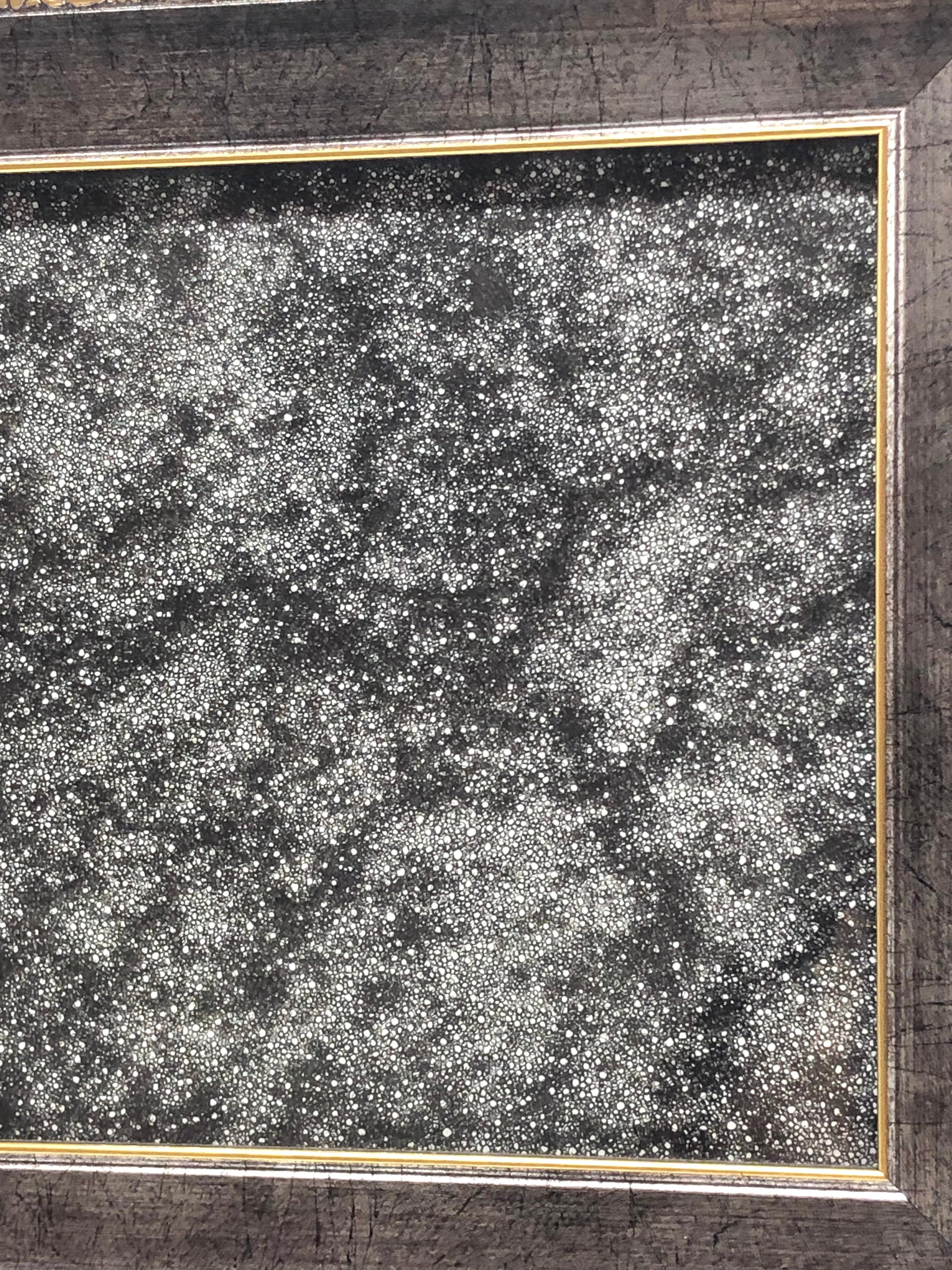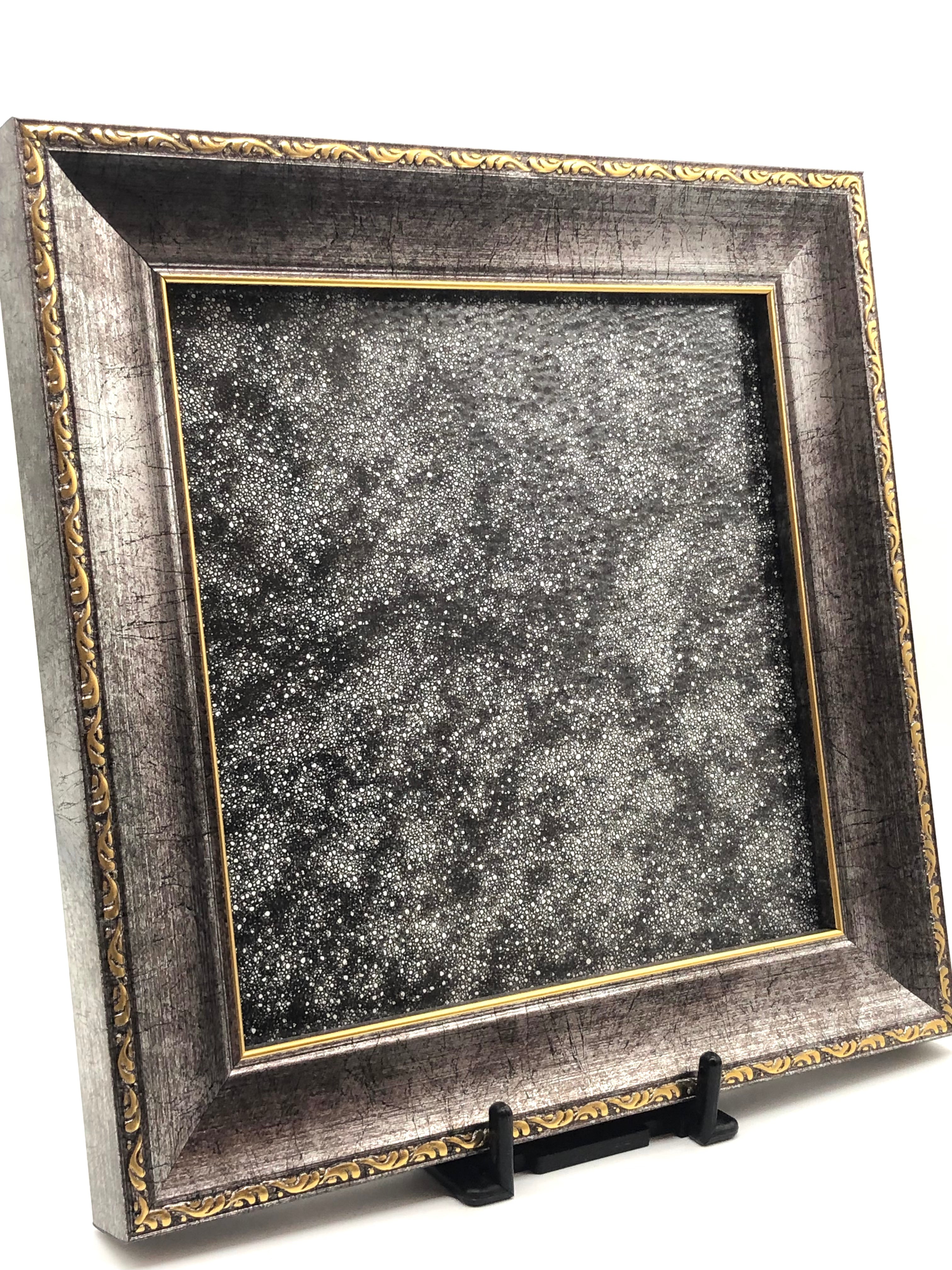 果てしなく広がる星空の一部。それは身体を包むように存在しながらも自身の内面に無限に広がっている。同じものは2つとなく、一瞬一瞬で変化する様をかきとめた、ひとかけら。サイズ:193㎜×193㎜