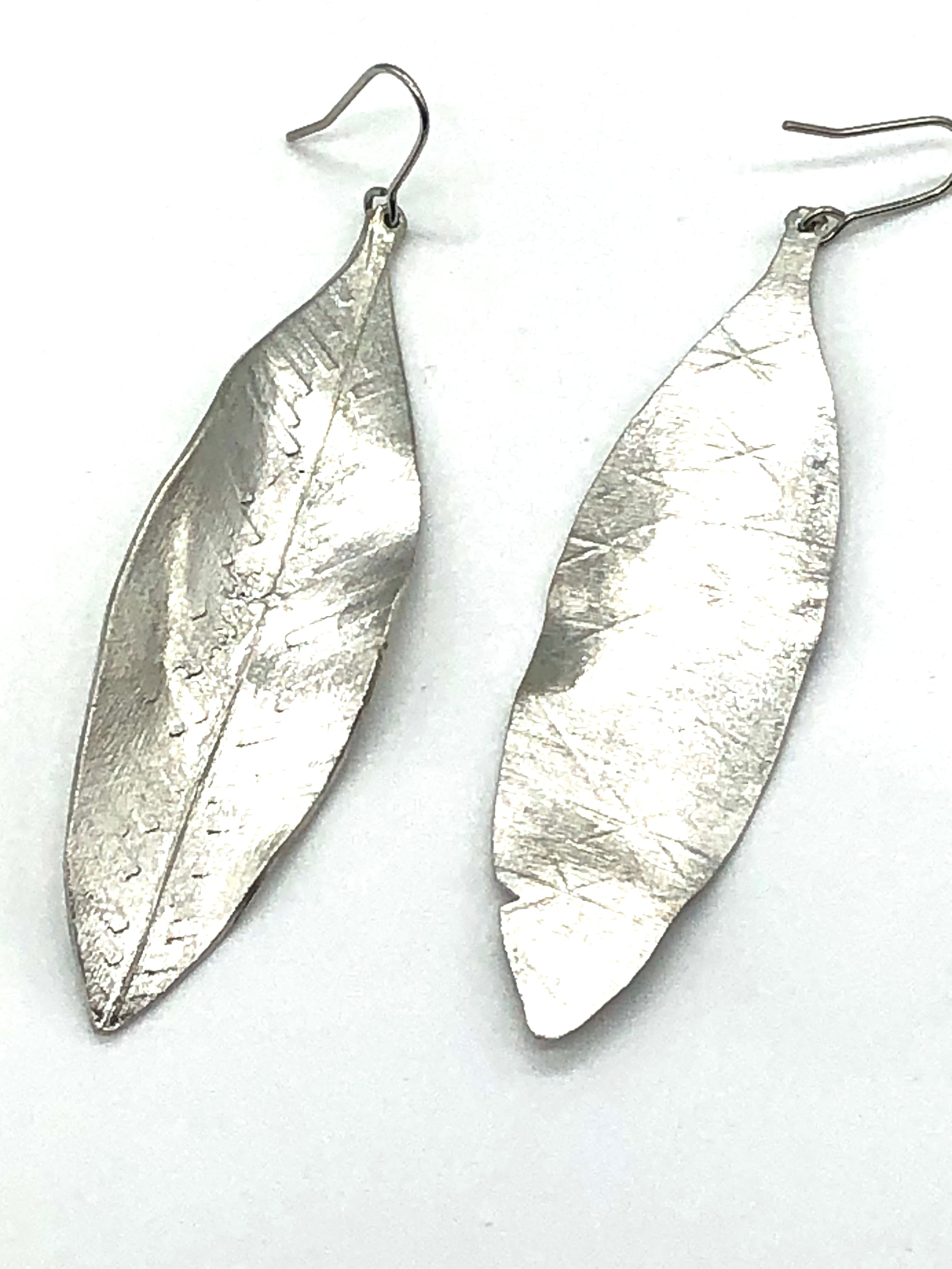 錫の柔軟性を楽しめる、葉をモチーフにした耳飾り。 曲げてシェイプをつけた自分だけの葉を軽やかに身に着ける。