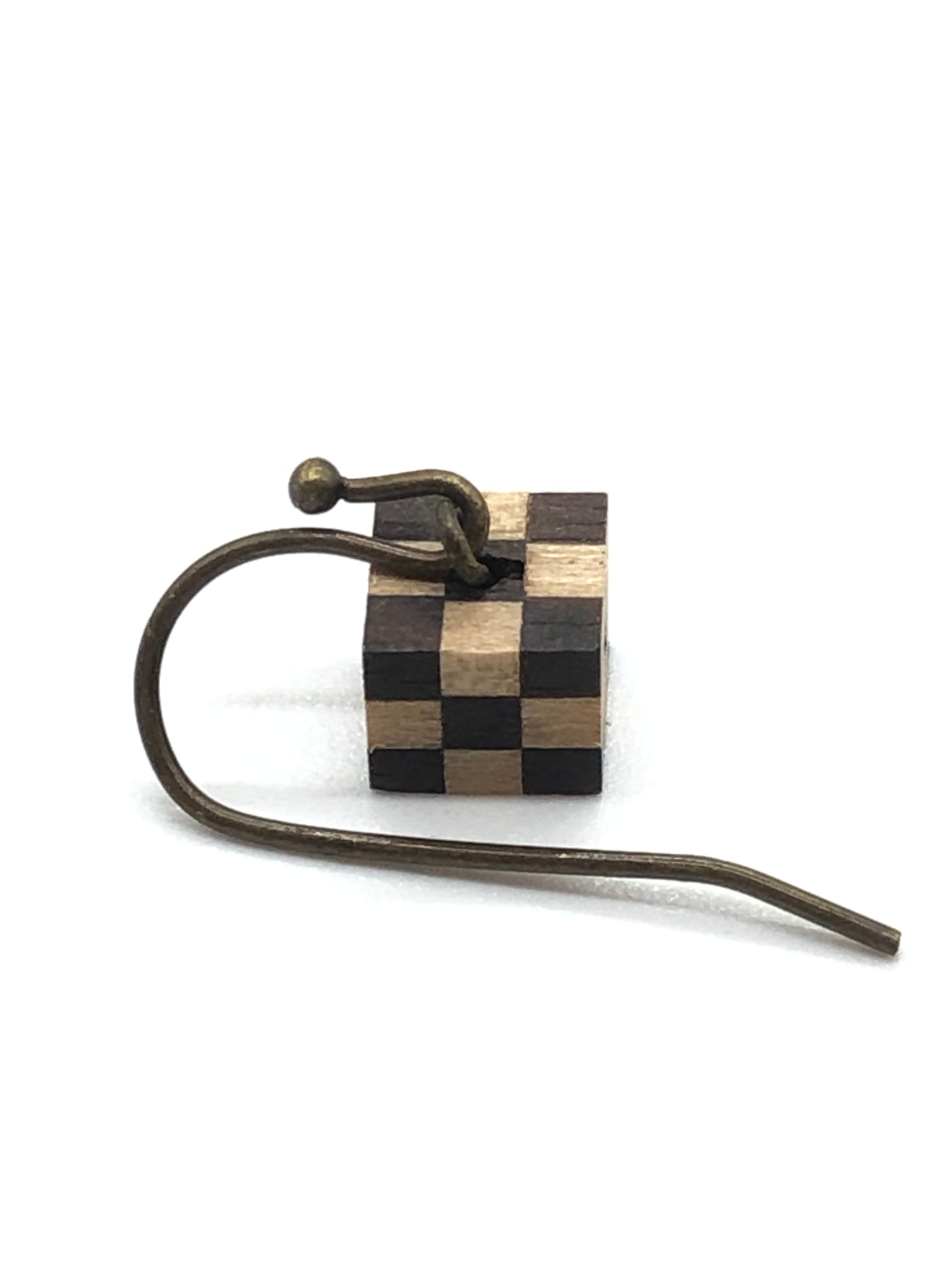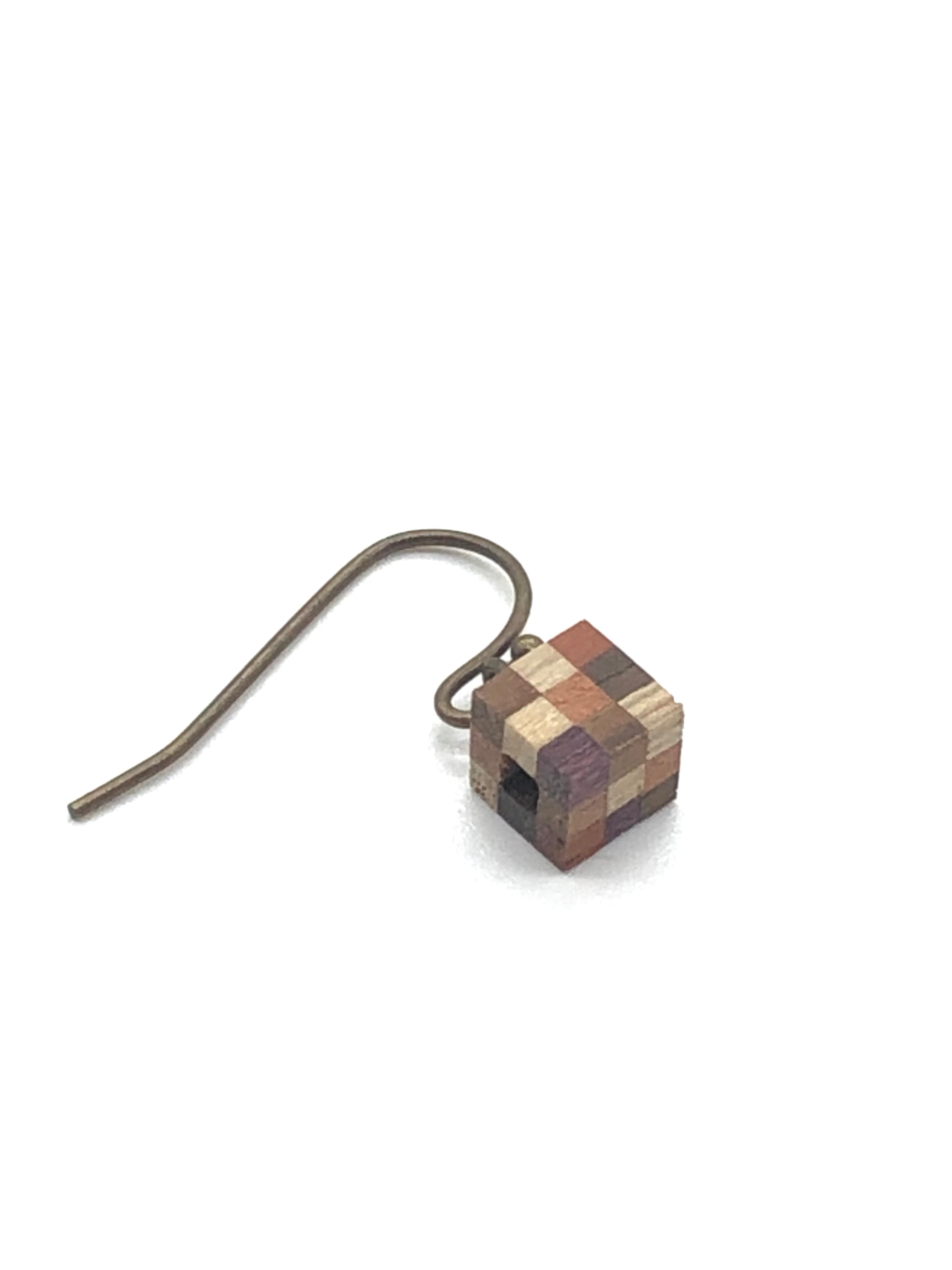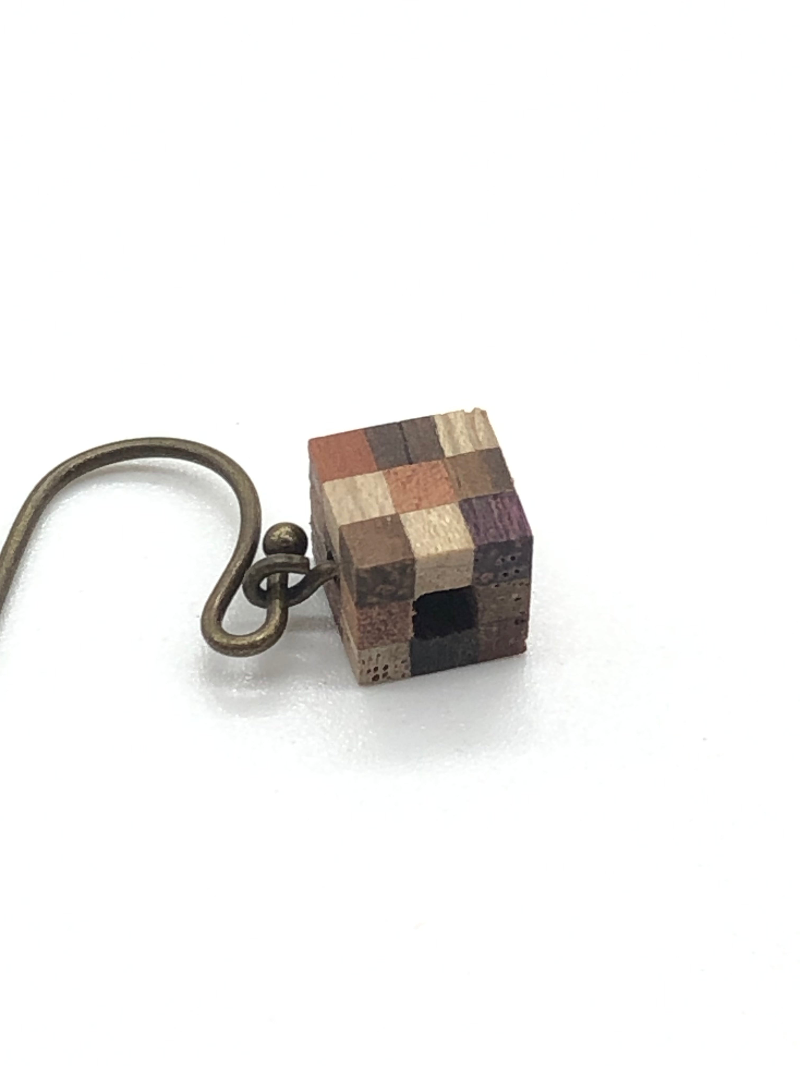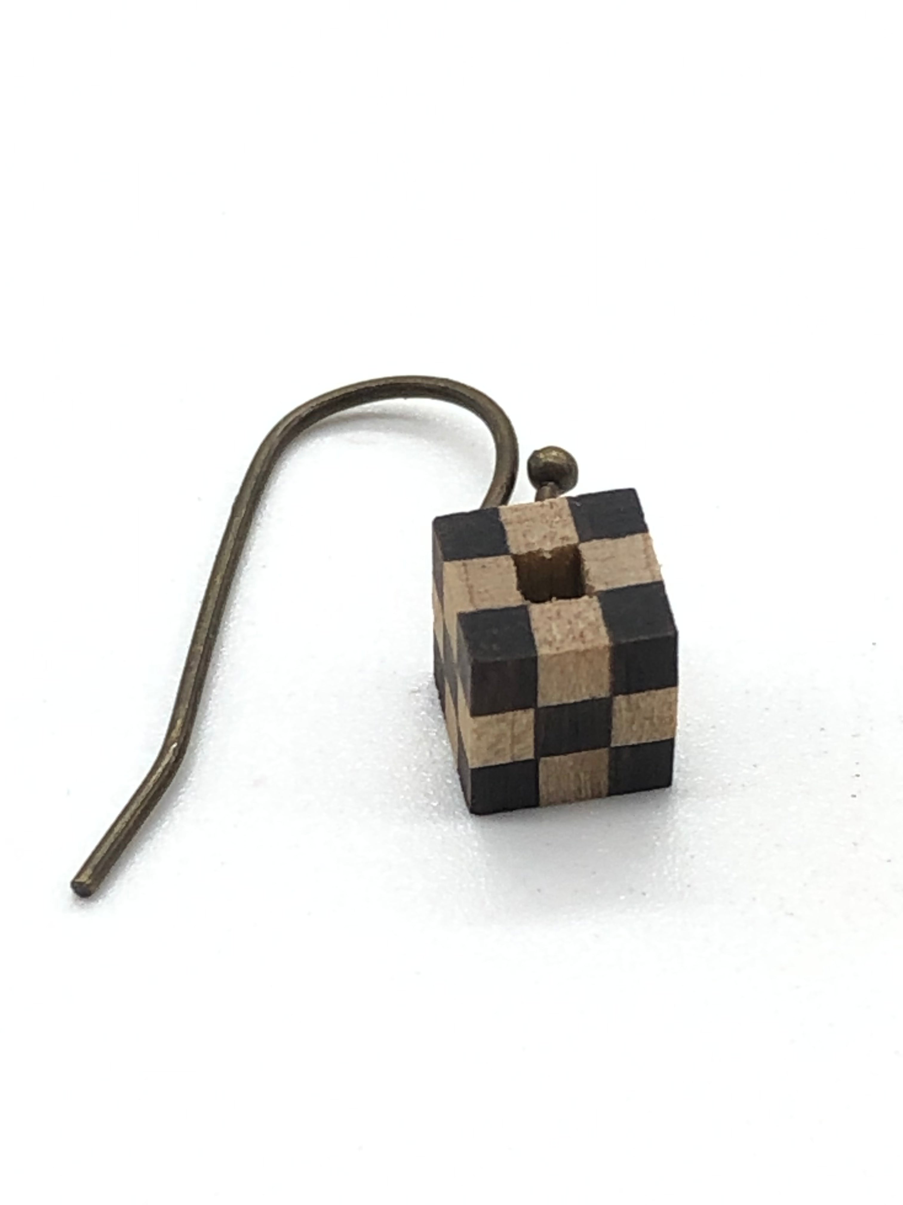 無垢材を寄木細工のように仕上げたキューブピアスです。