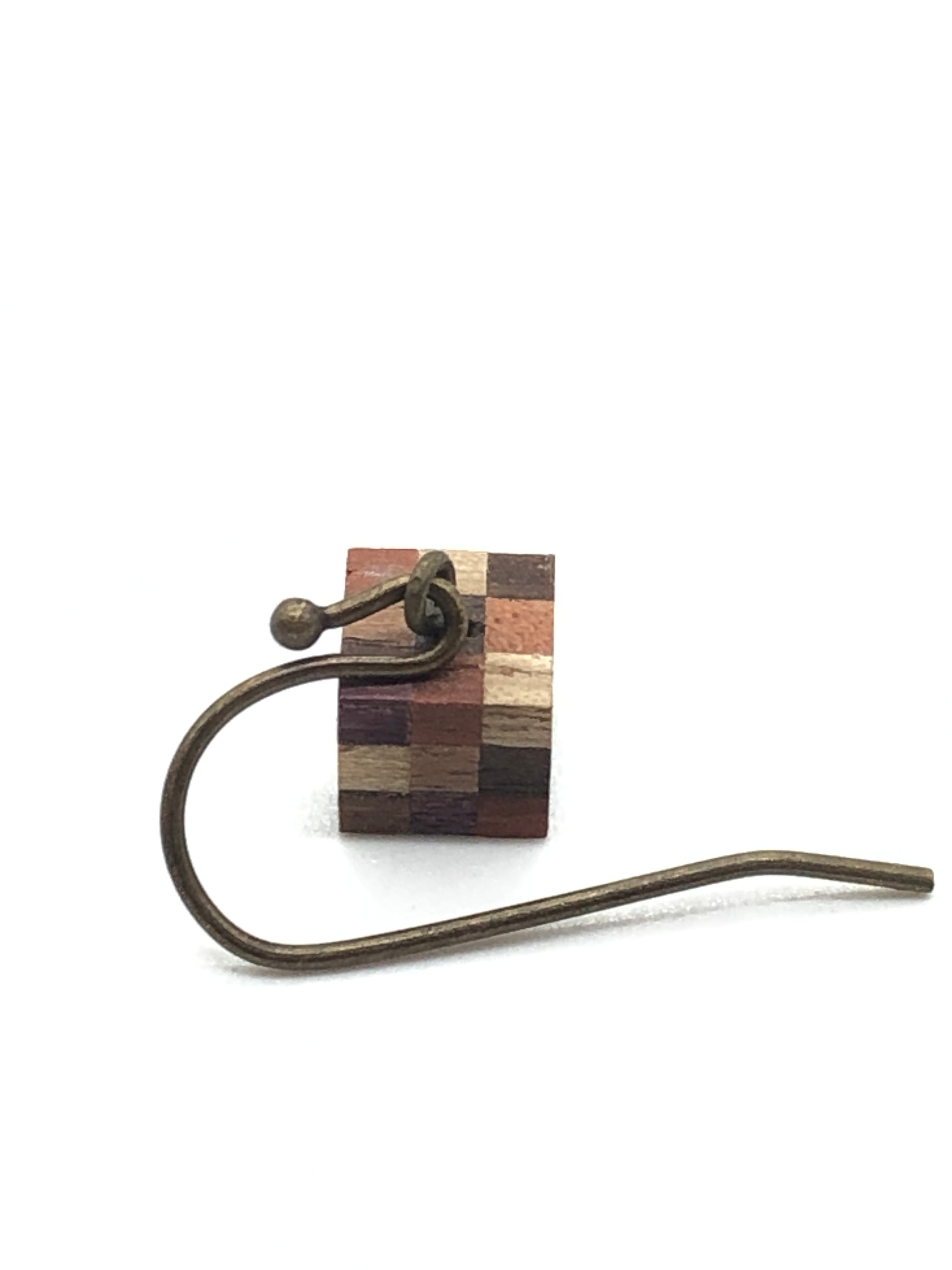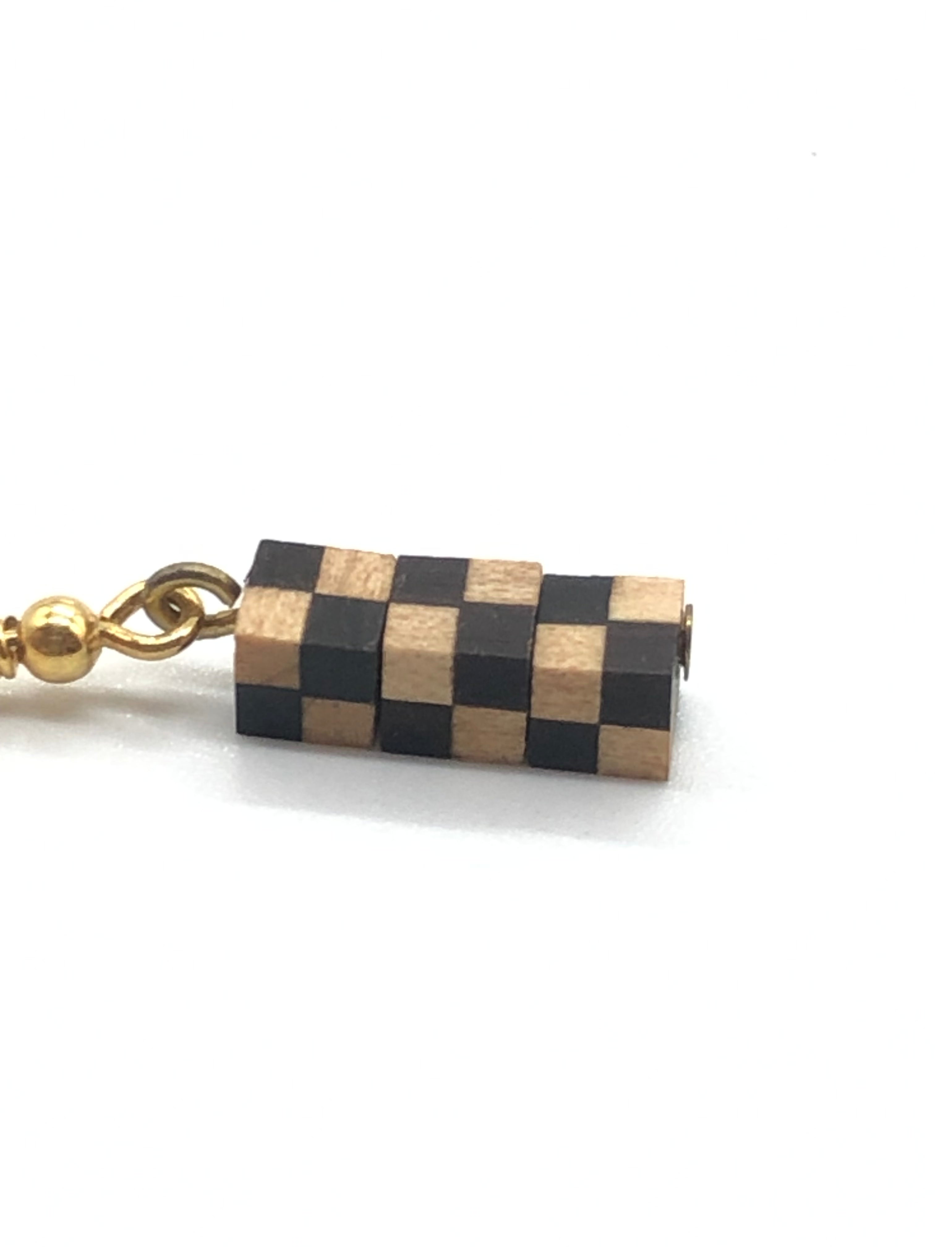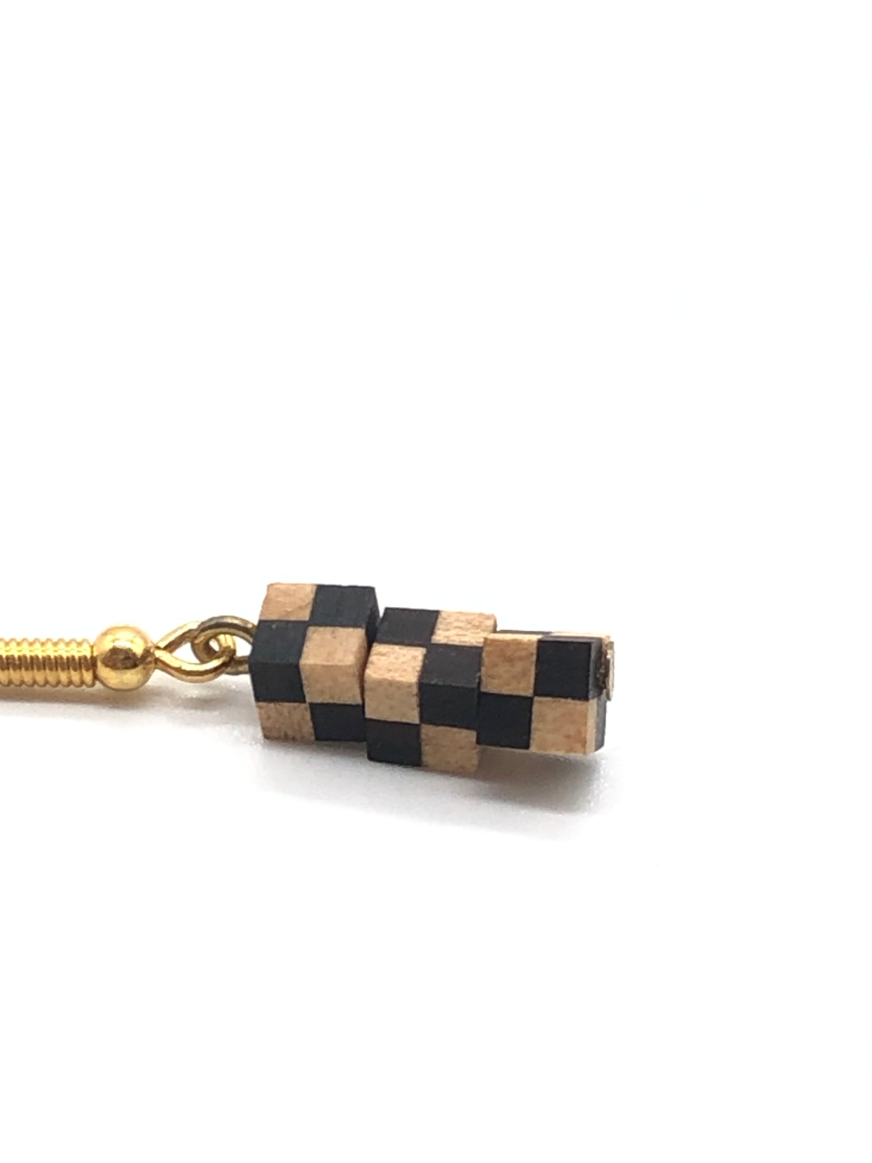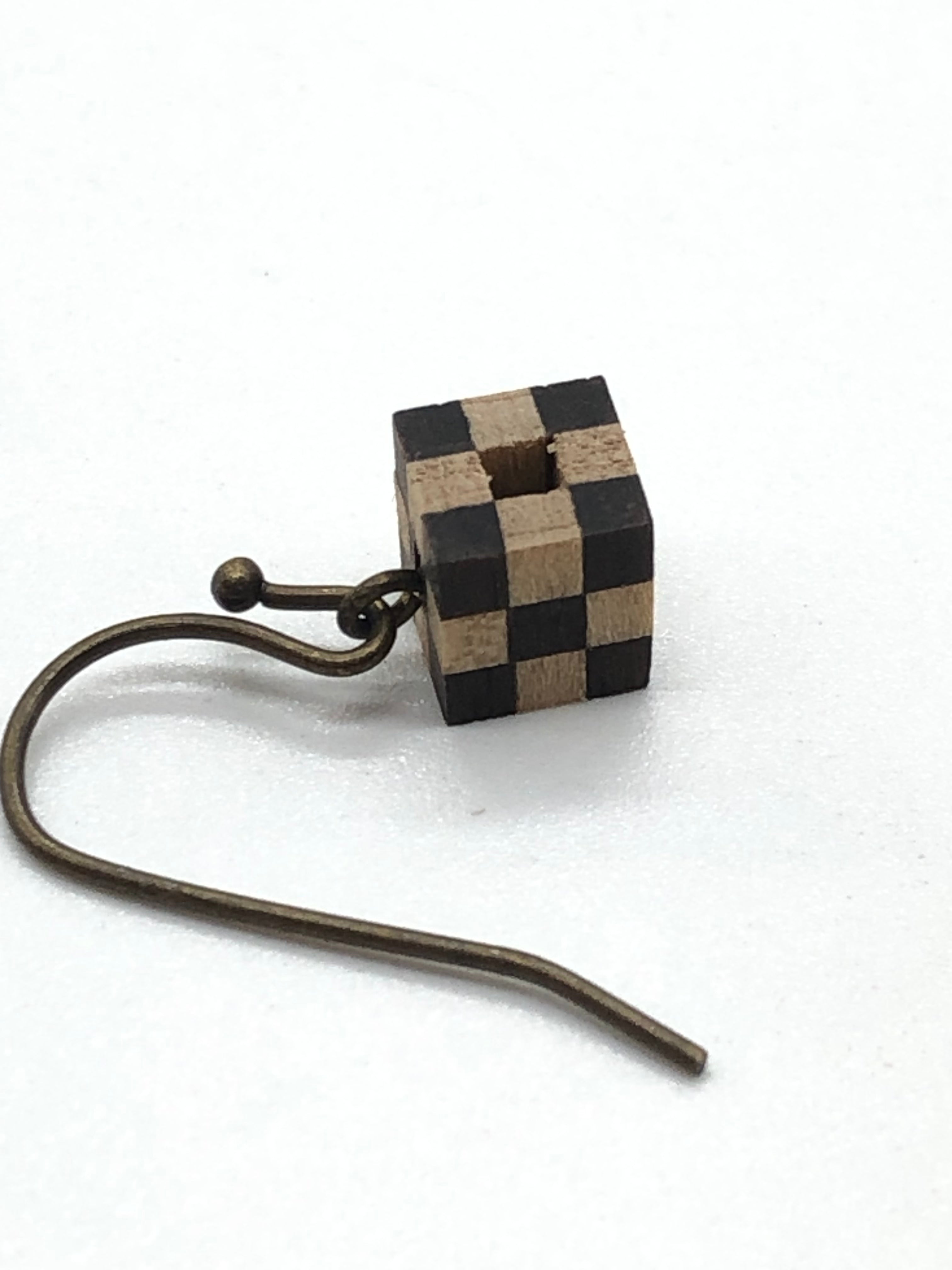 無垢材を寄木細工のように仕上げたキューブピアスです。