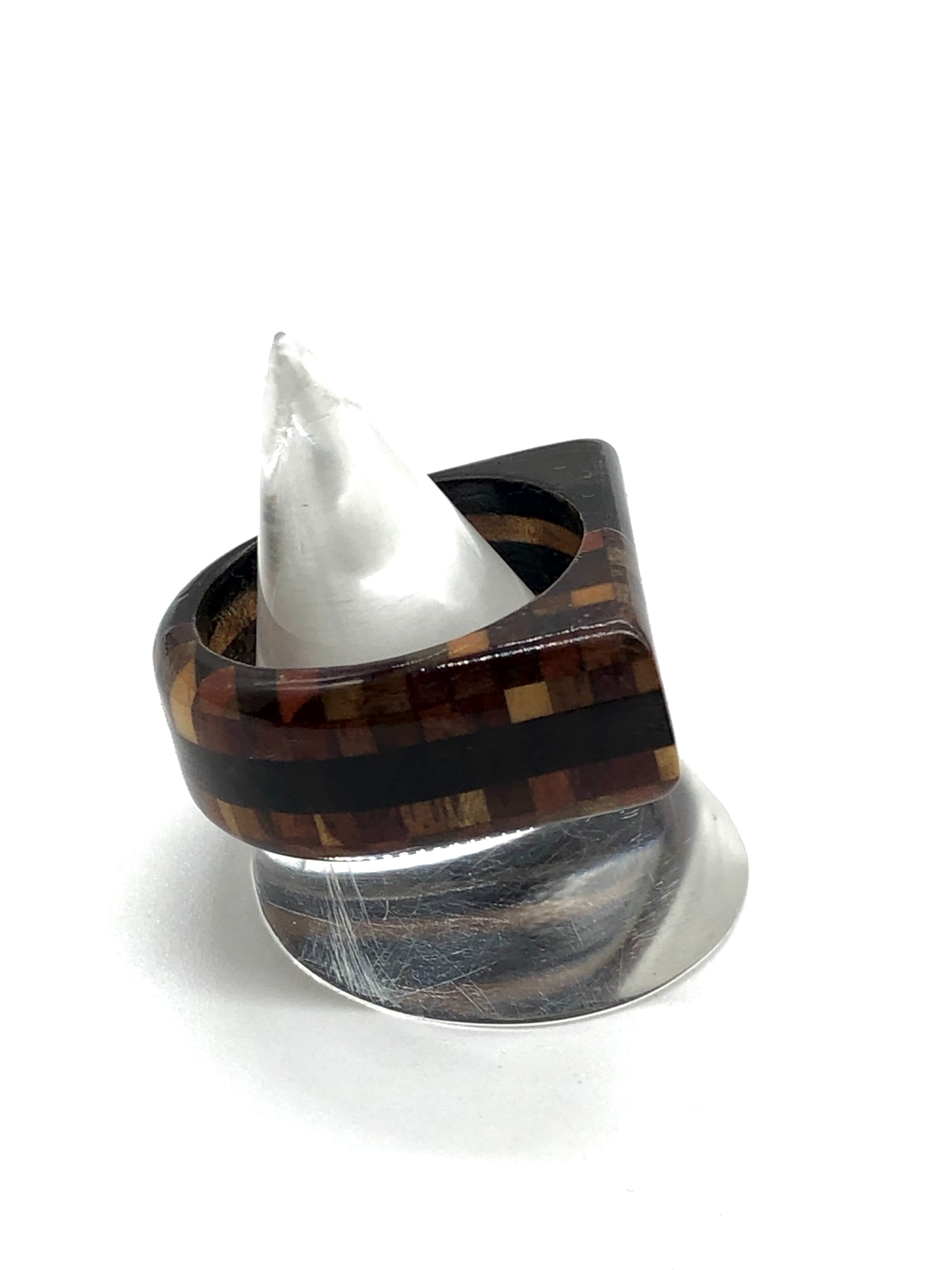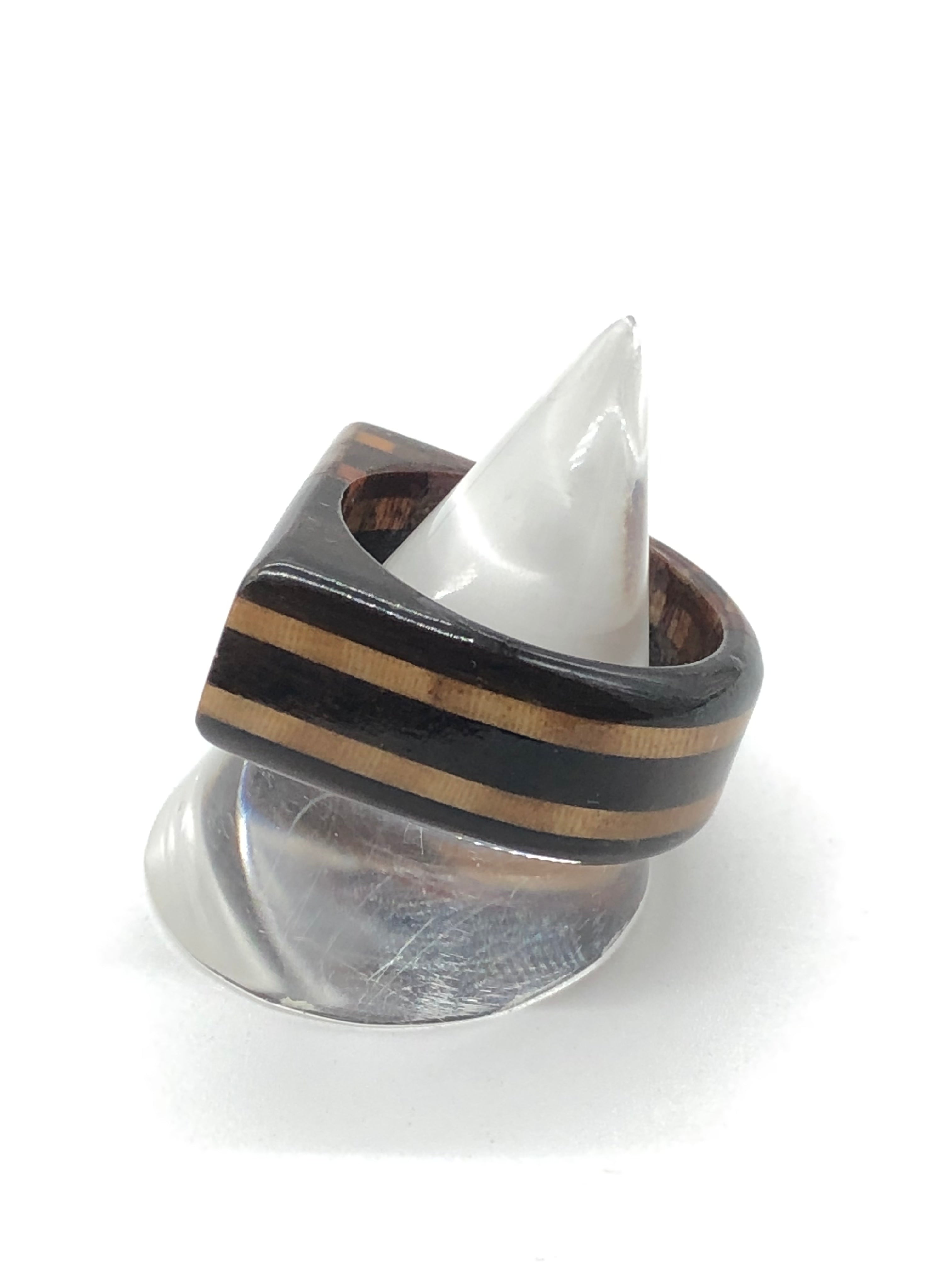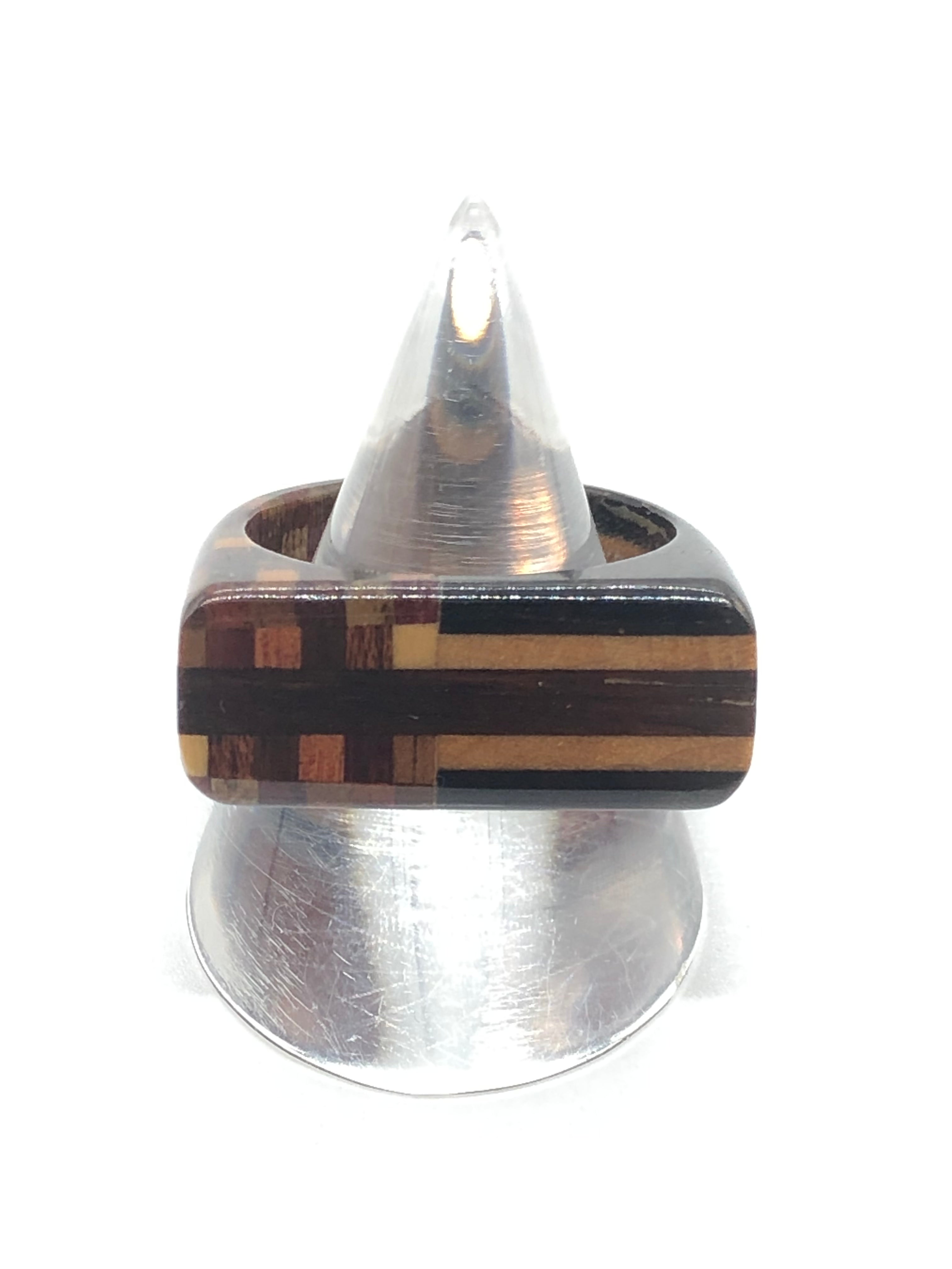 寄木細工のリングです。全て天然木を使用しています。使用木材は黒檀、 メイプル、パープルハート、ローズウッド、ピンクアイボリー、ウォルナット、 ハワイアンコア、パドゥーク、神代タモです。 見せる面を変えて、カジュアルにもフォーマルにも着用いただけます。 21号、13号のラインナップです。
