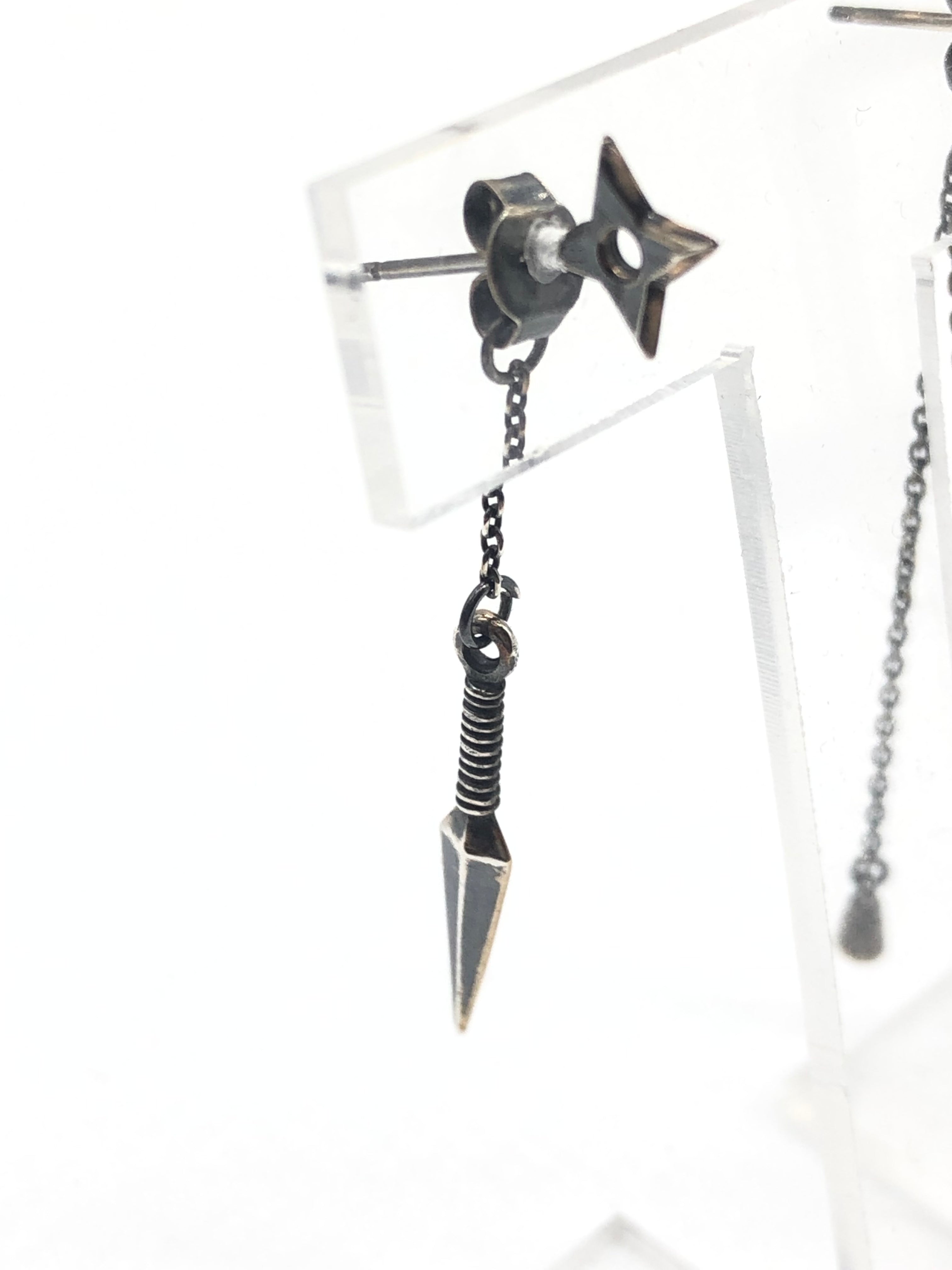 耳に刺さった(ように見える)手裏剣とキャッチからぶら下がる苦無(クナイ)のチェーンピアス。 さりげなく、良く見れば、の遊び心。個性的に、和装に、お楽しみください。
