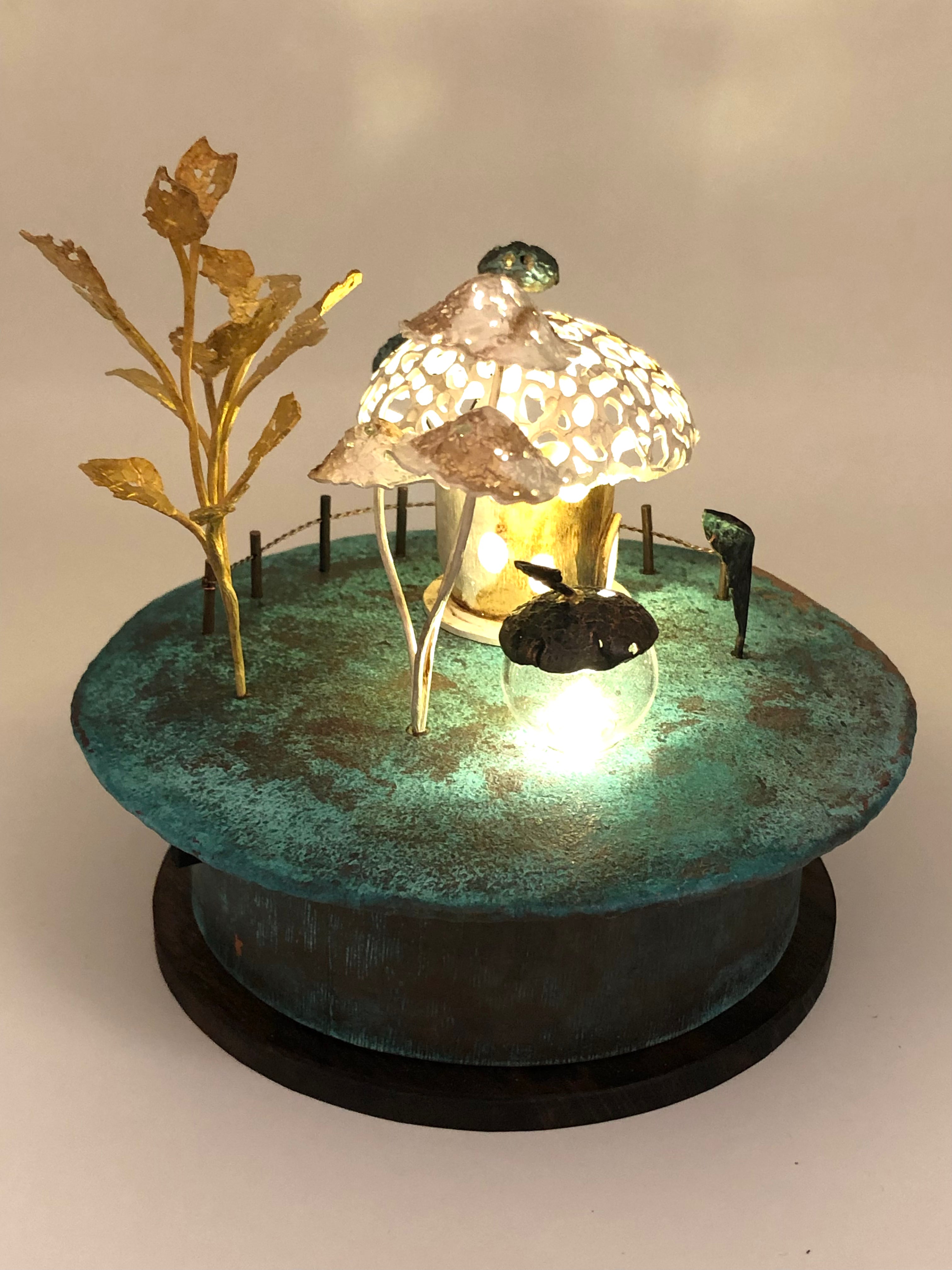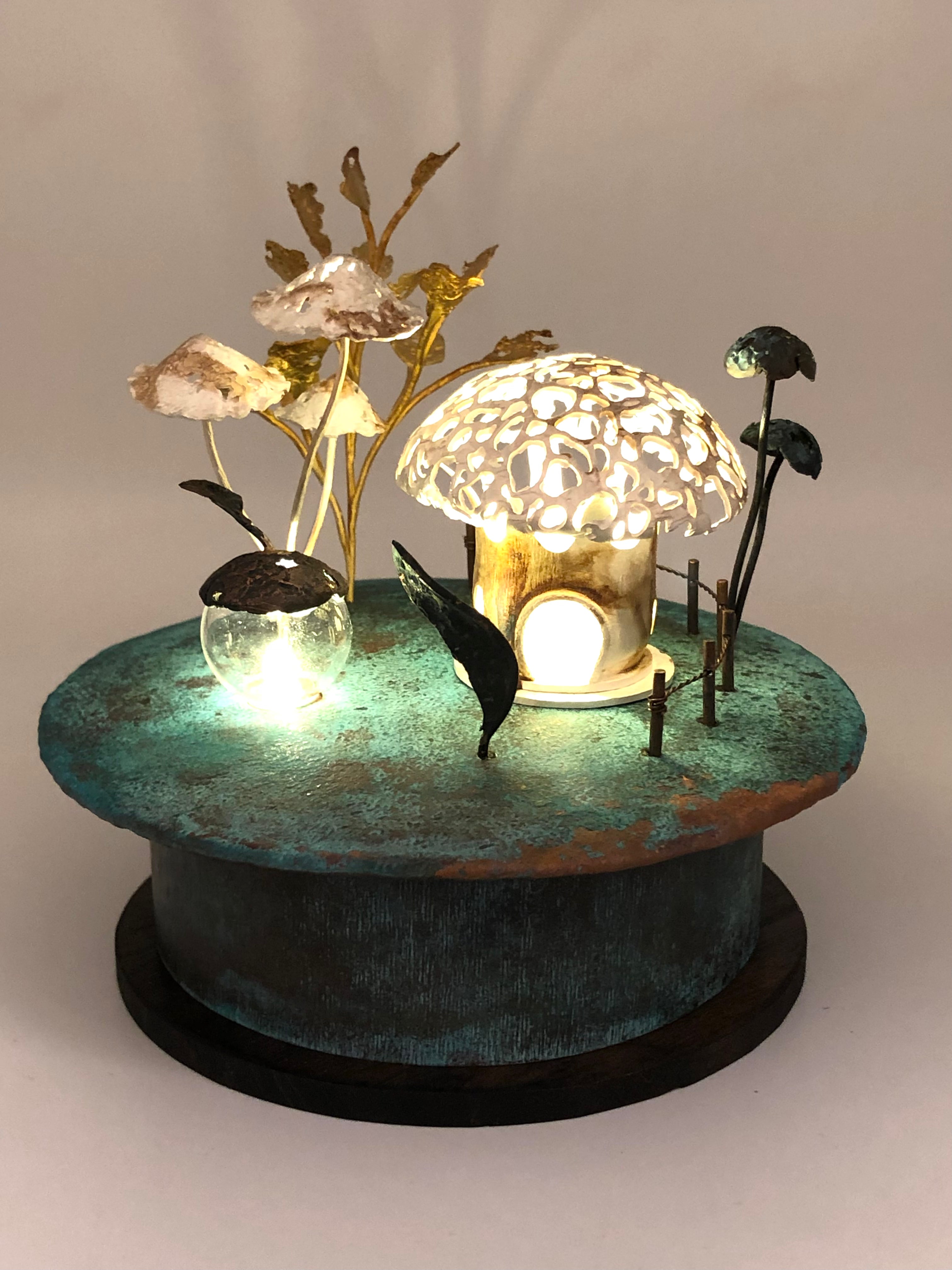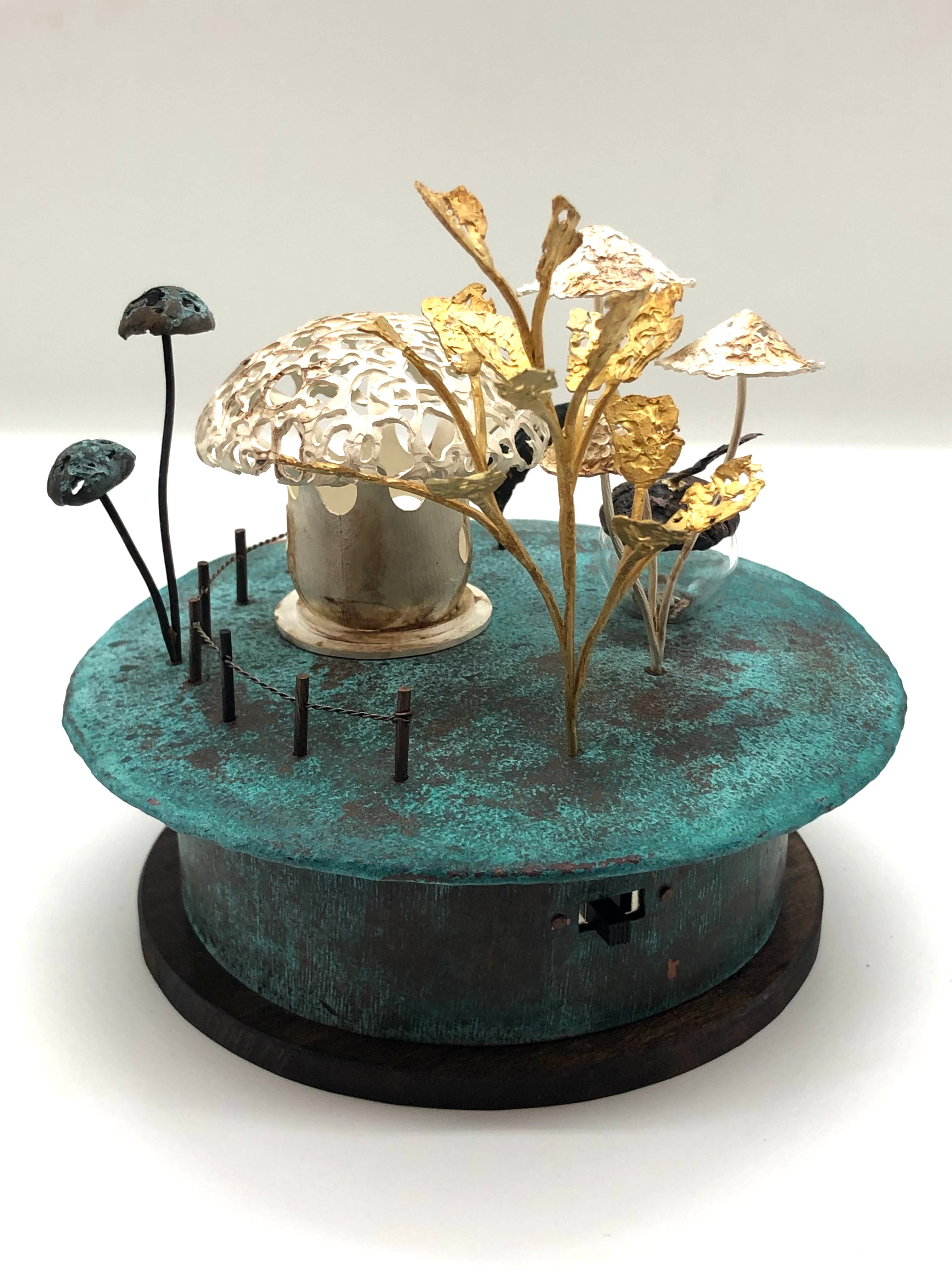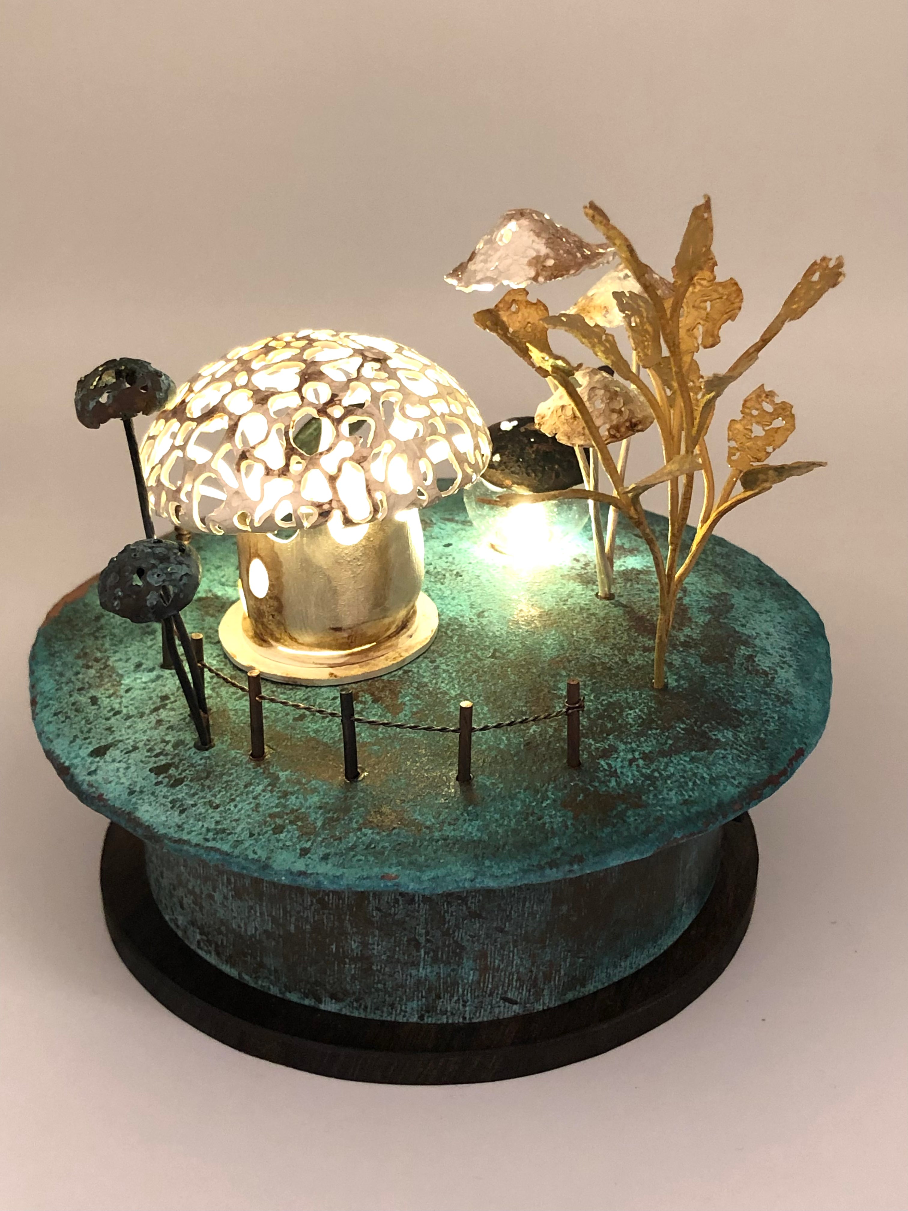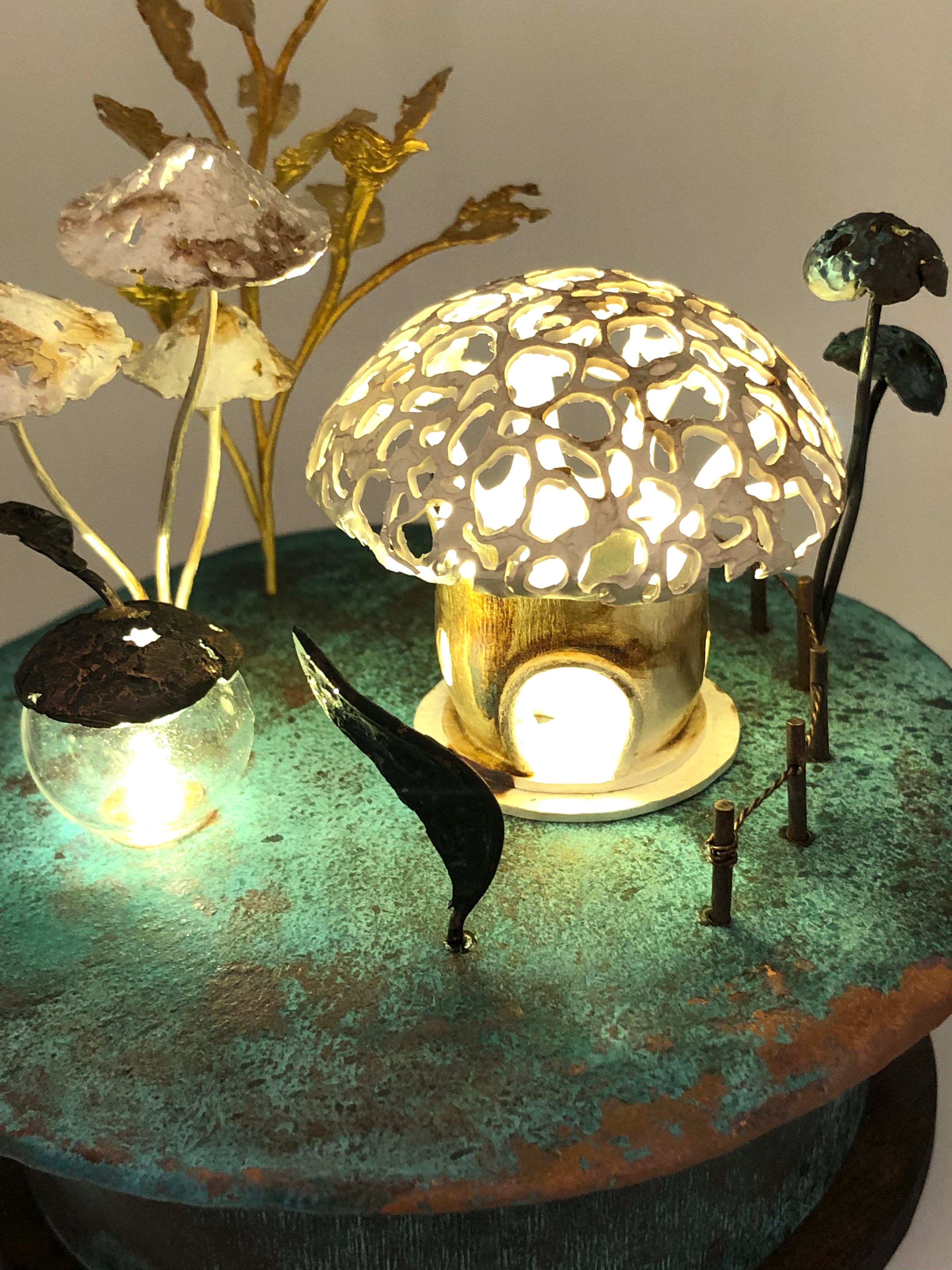 燻された銀色のキノコ型のお家からポワッと灯りが洩れ、エッチング技法によって表現された陰影が幻想的な森に小人でも住んでいるかのような雰囲気です。