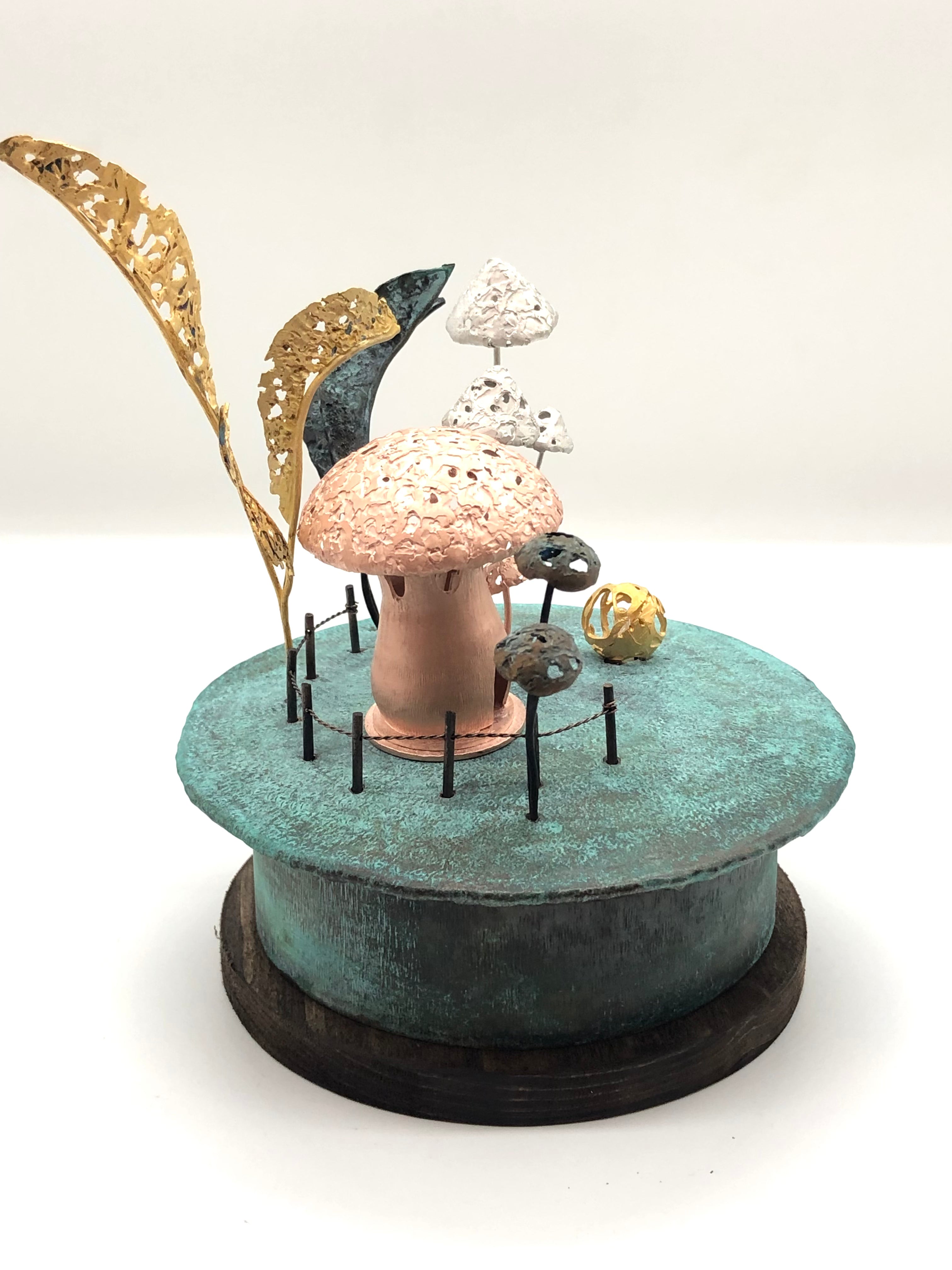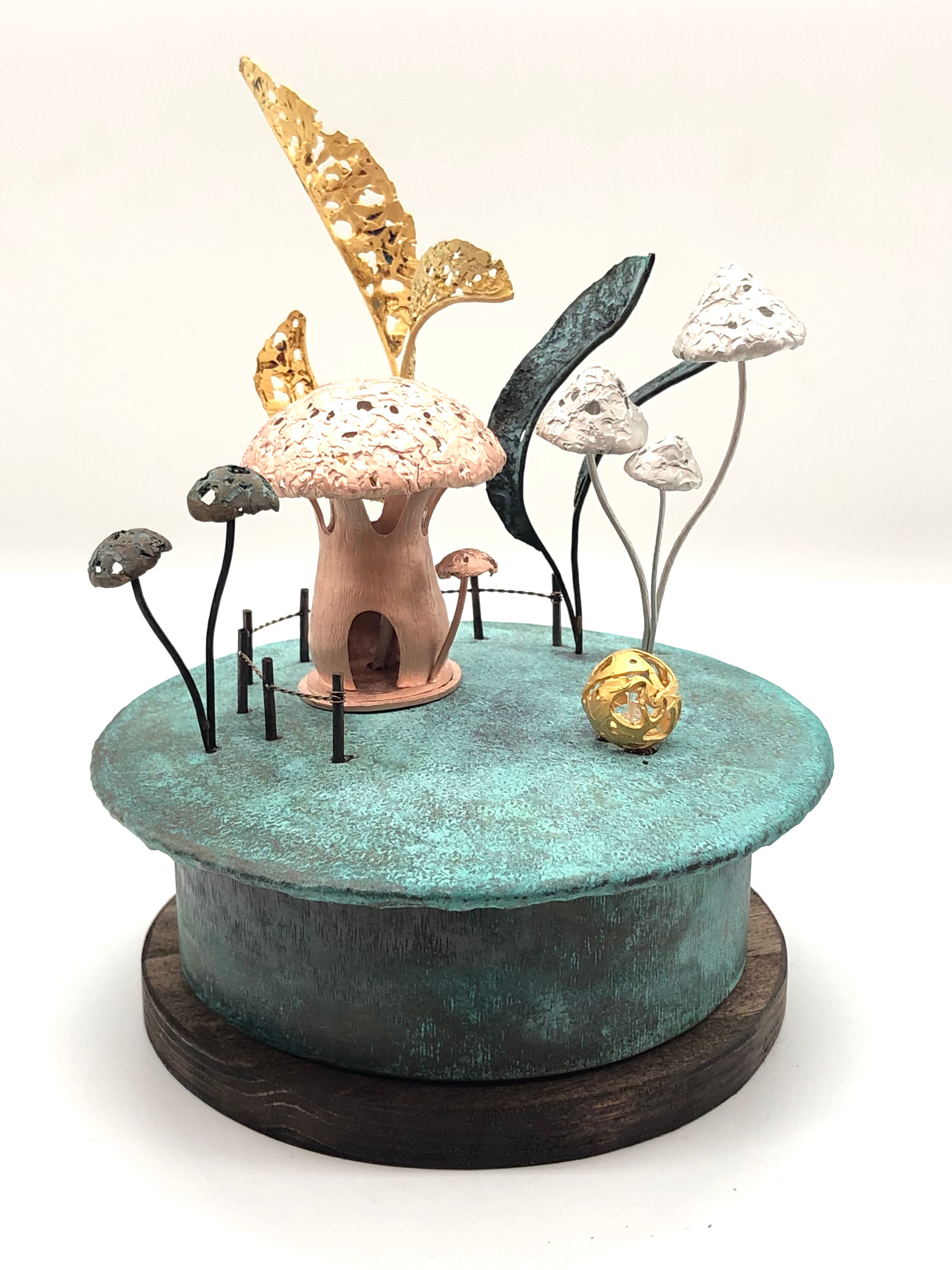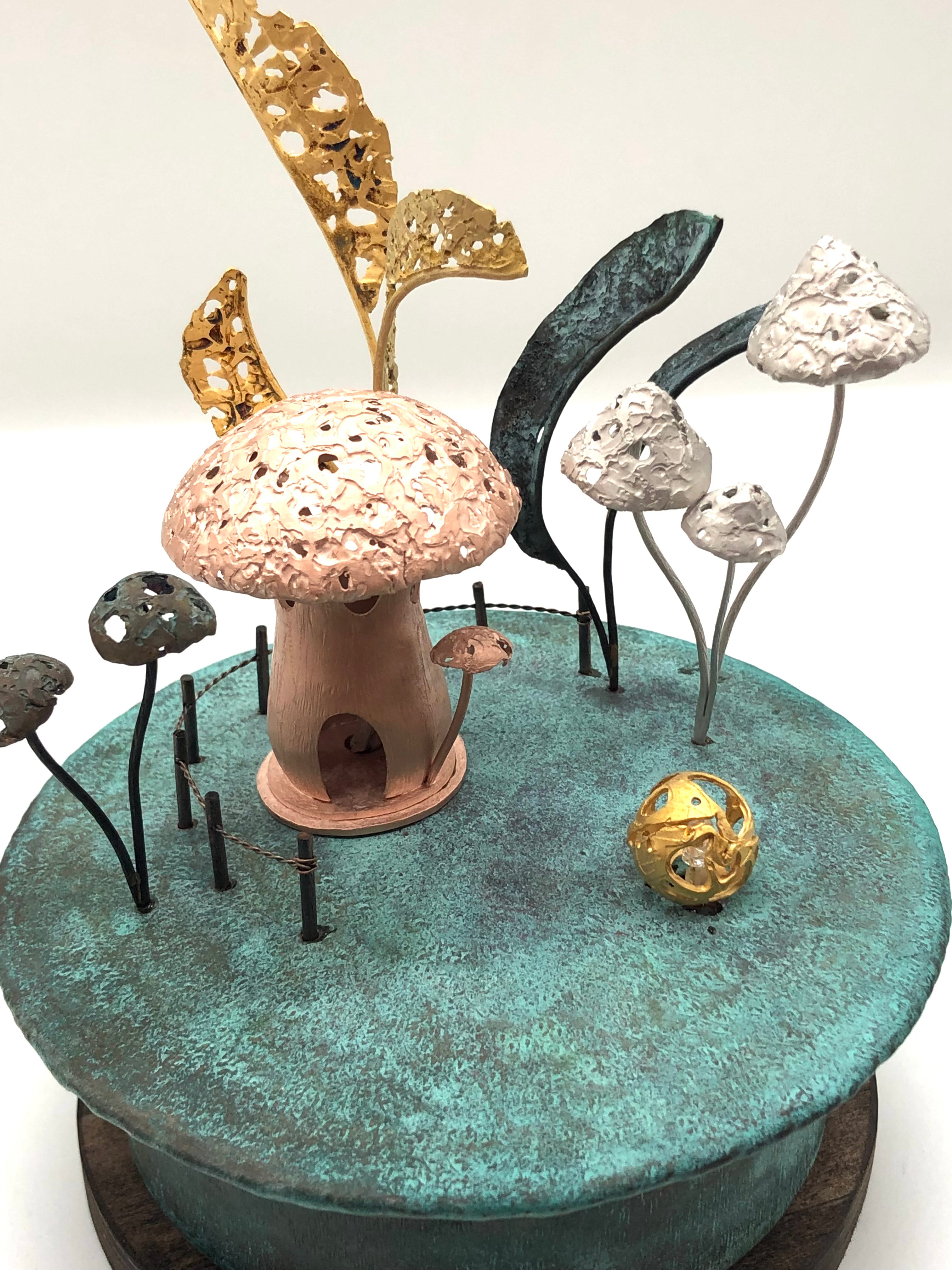 燻された銀色のキノコ型のお家からポワッと灯りが洩れ、エッチング技法によって表現された陰影が幻想的な森に小人でも住んでいるかのような雰囲気です。