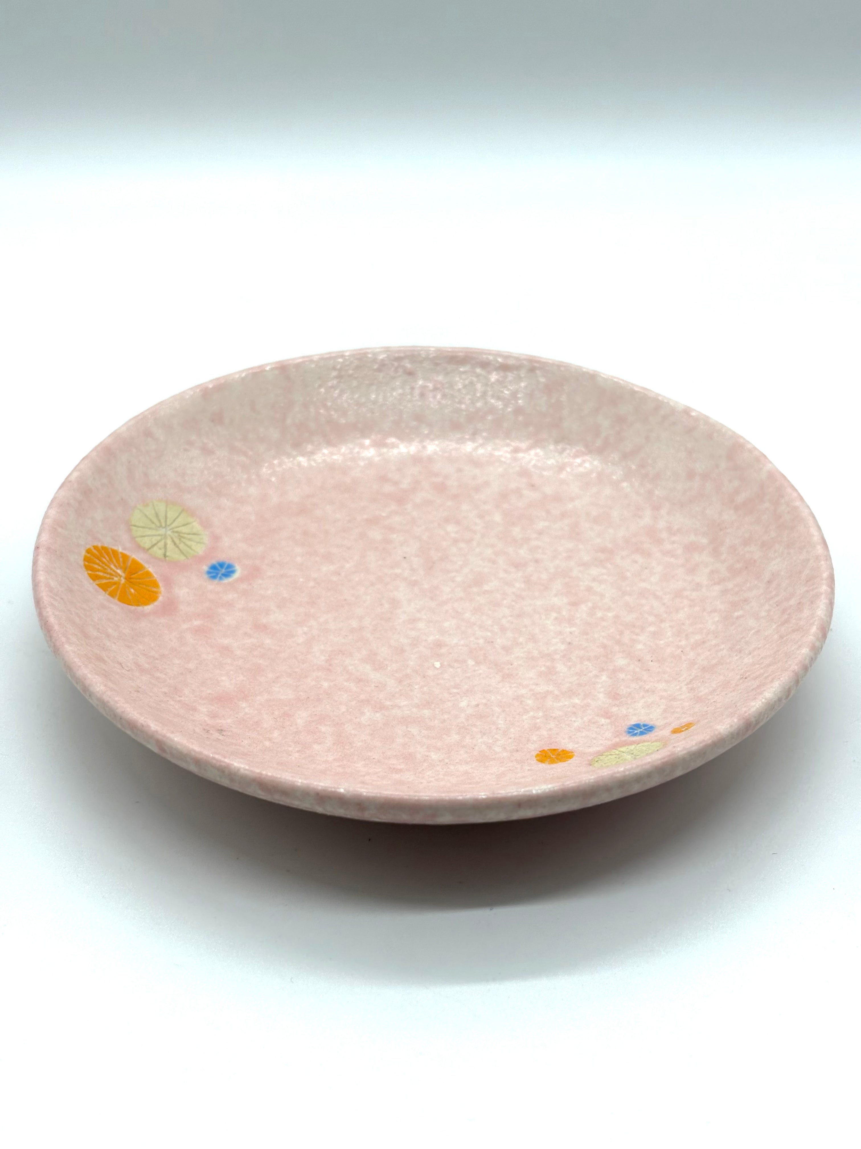 淡いピンク色の釉薬と、オレンジやブルー、グリーンの色彩が織りなす模様が、食卓にさりげない華やかさをプラスします。