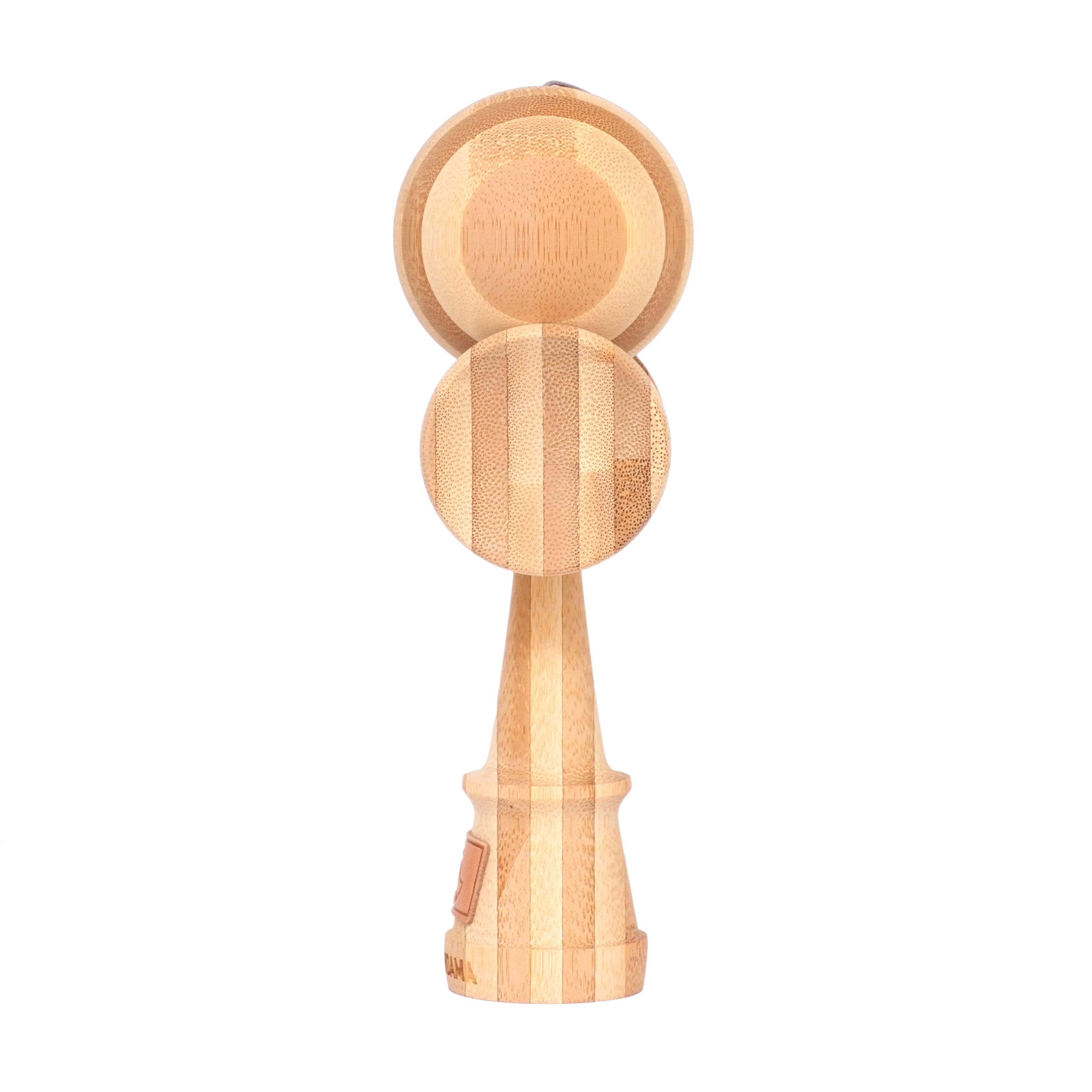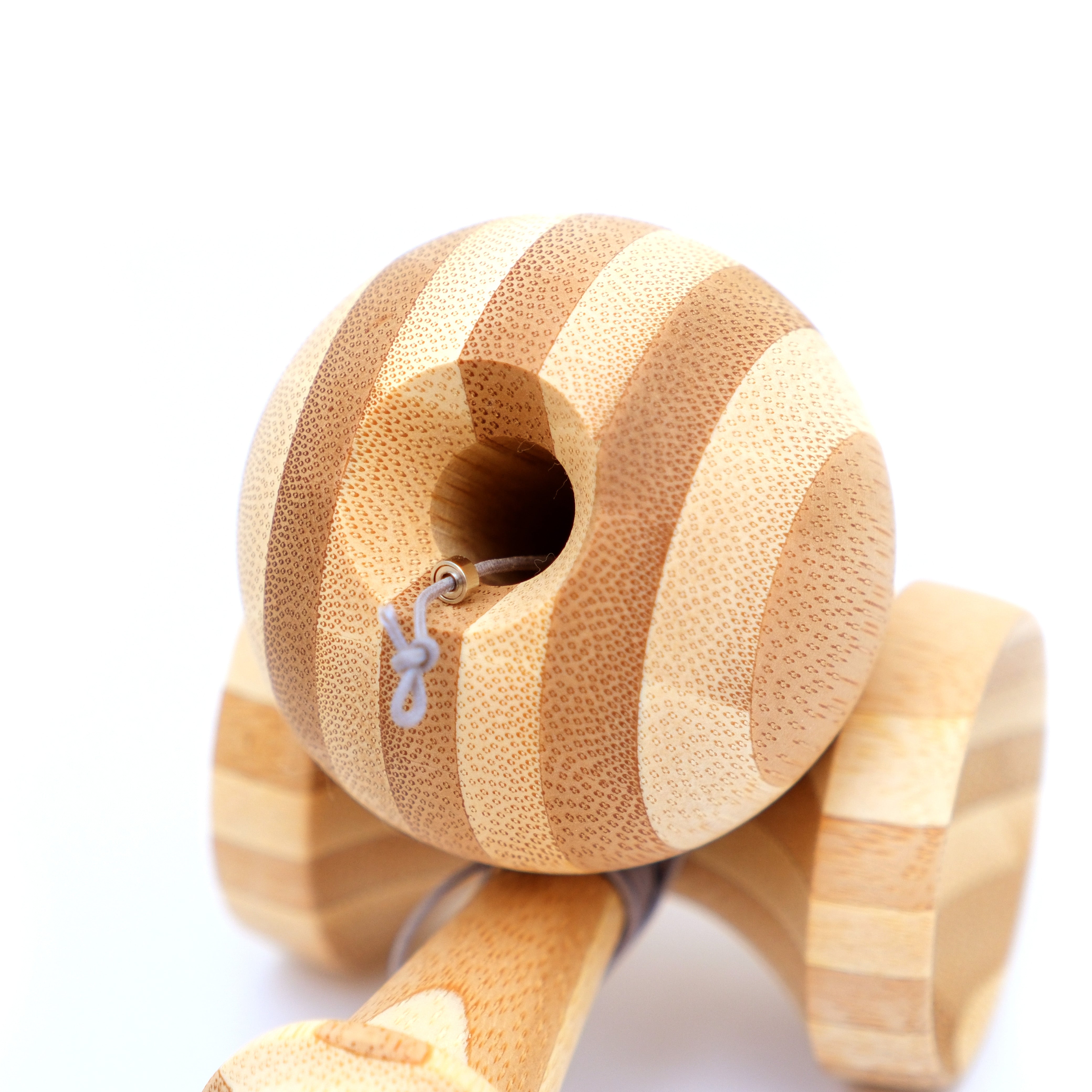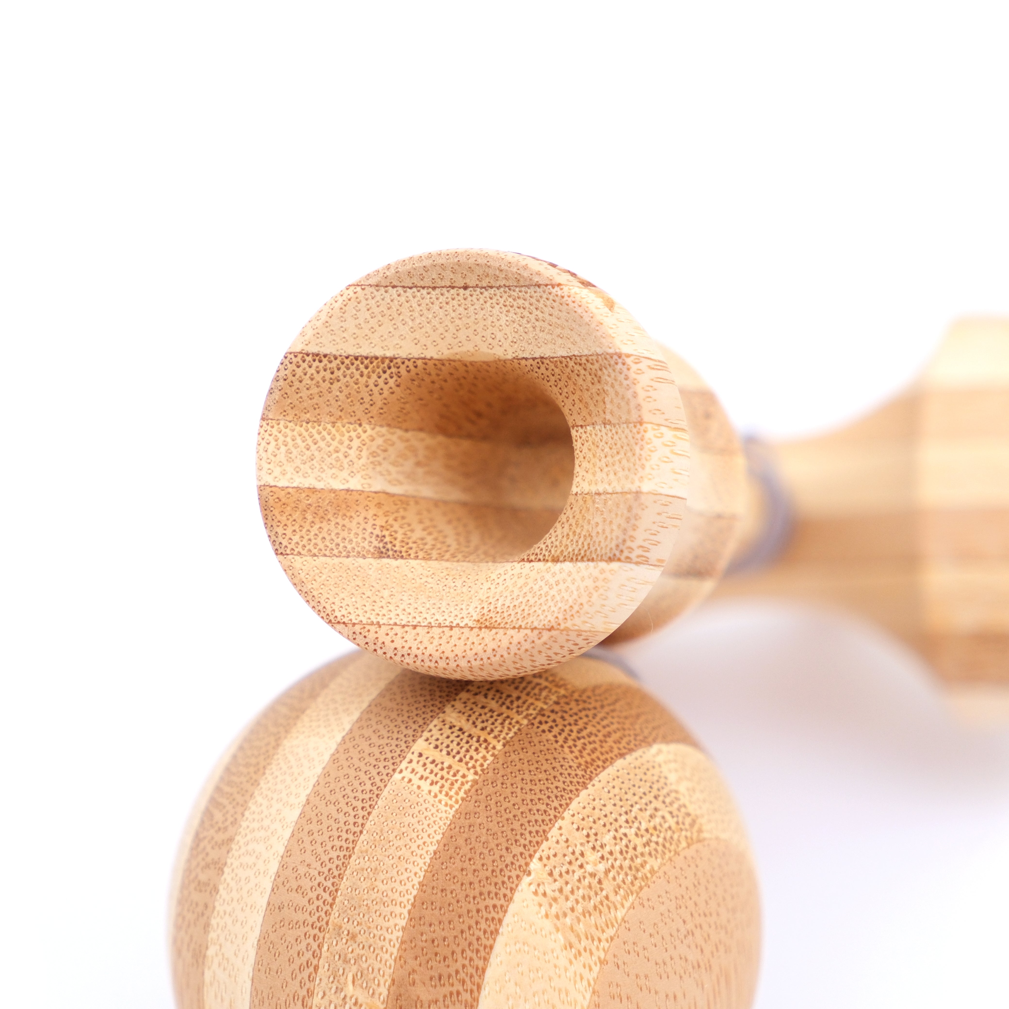 バンブーは、日本名で竹です。バンブーは、3年ほどで収穫ができる成長の早い植物で水をあまり必要としないことから、サステナブルな素材として幅広い製品に使われ始めています。植物としての性質上、厚みが取れないため、色の異なる板材を圧着して作っています。他のけん玉では表現できない色のコントラストの美しいストライプ柄のけん玉になっています。木質としては、軽くて丈夫な木材でぶつかり合った際には、透き通った高い音を鳴らします。硬度も高く凹みにも強いため他の木材と比べると比較的長く使用いただける木材です。
