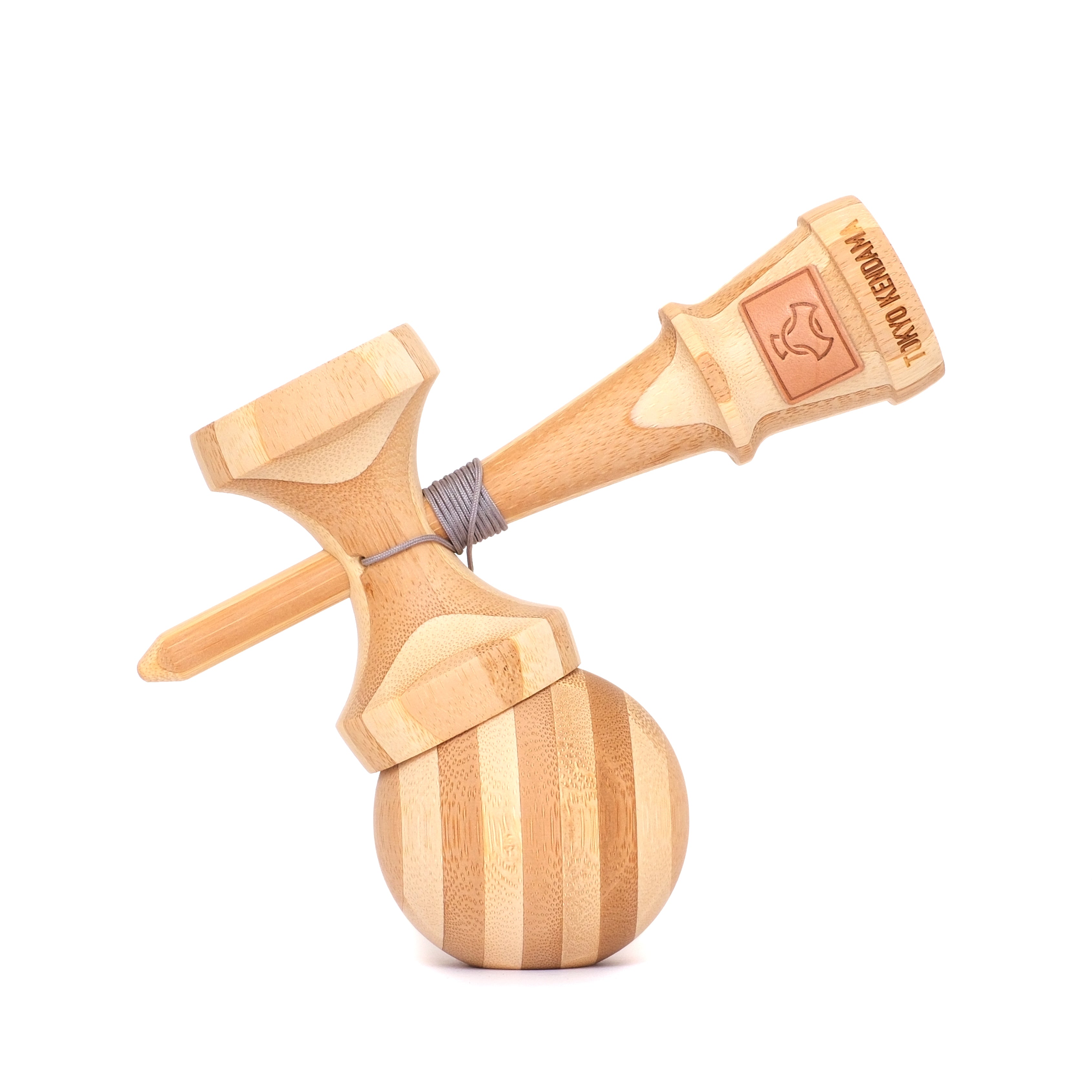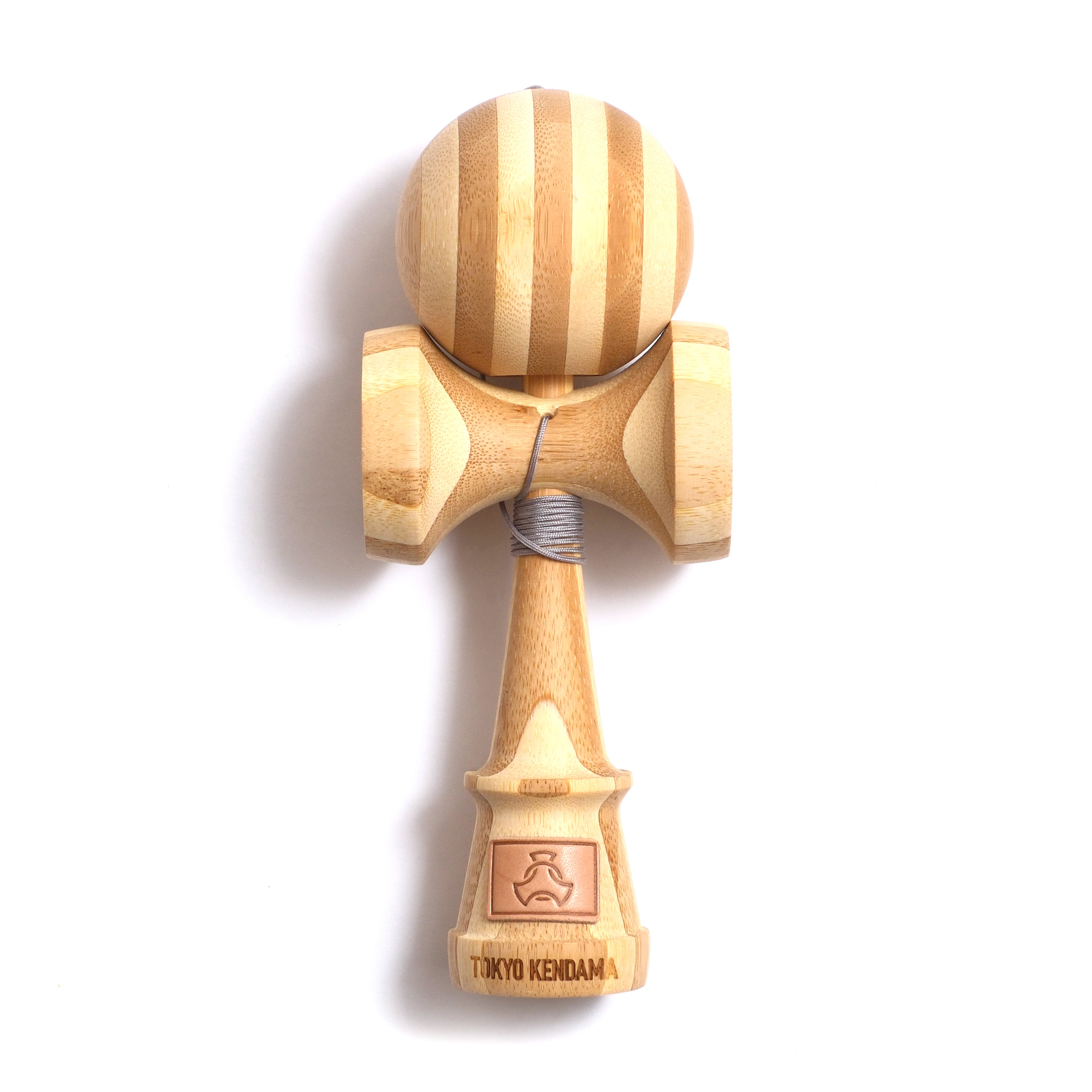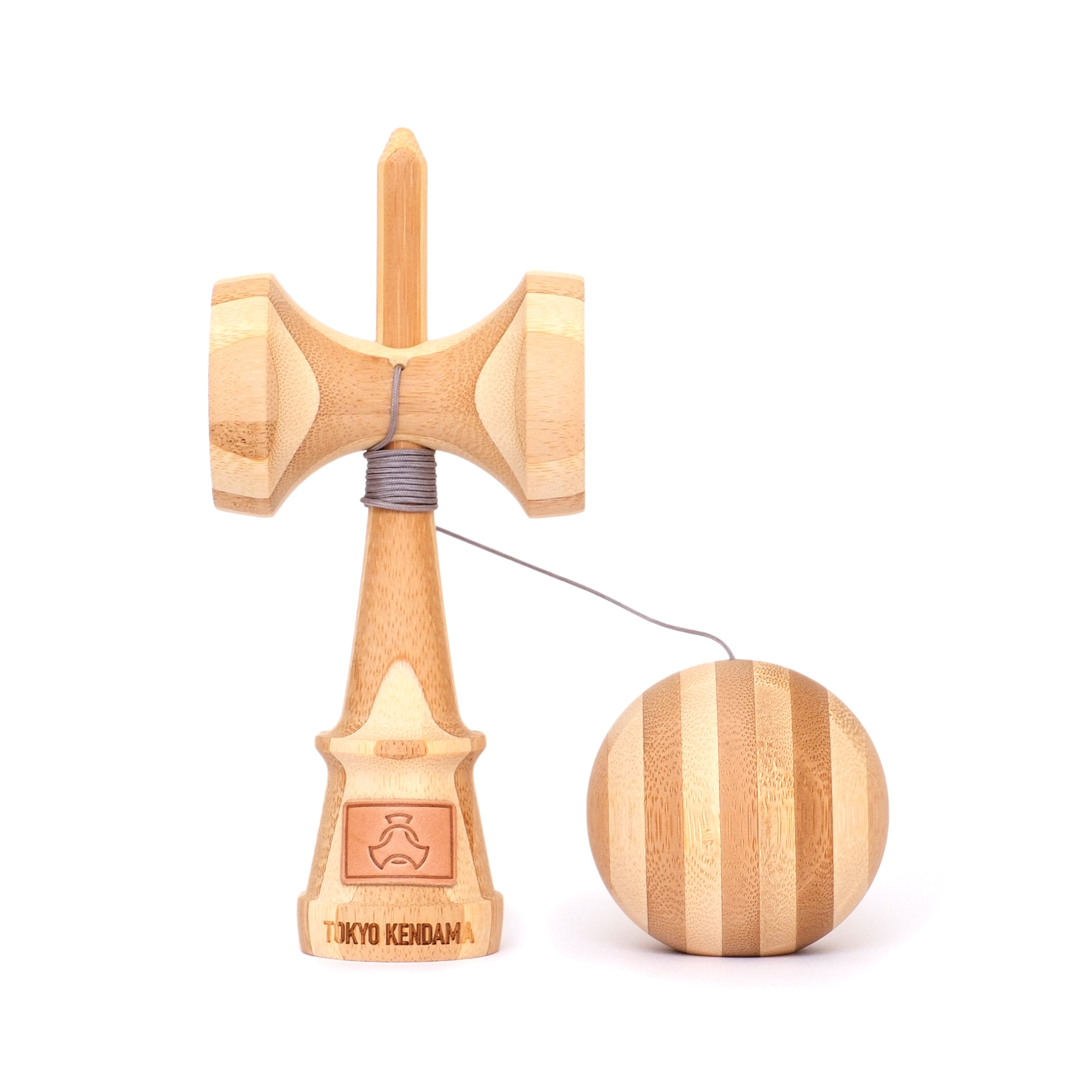バンブーは、日本名で竹です。バンブーは、3年ほどで収穫ができる成長の早い植物で水をあまり必要としないことから、サステナブルな素材として幅広い製品に使われ始めています。植物としての性質上、厚みが取れないため、色の異なる板材を圧着して作っています。他のけん玉では表現できない色のコントラストの美しいストライプ柄のけん玉になっています。木質としては、軽くて丈夫な木材でぶつかり合った際には、透き通った高い音を鳴らします。硬度も高く凹みにも強いため他の木材と比べると比較的長く使用いただける木材です。