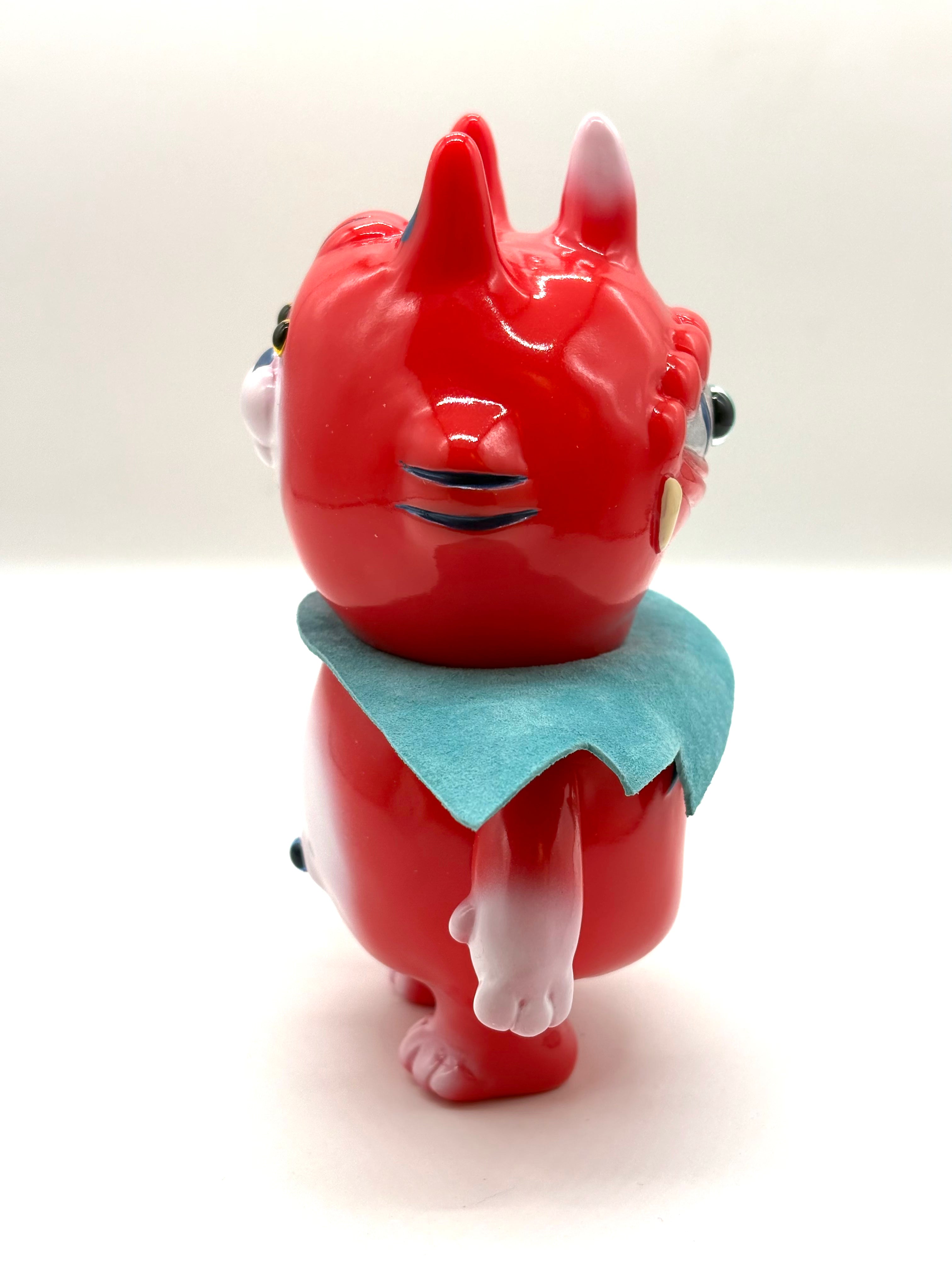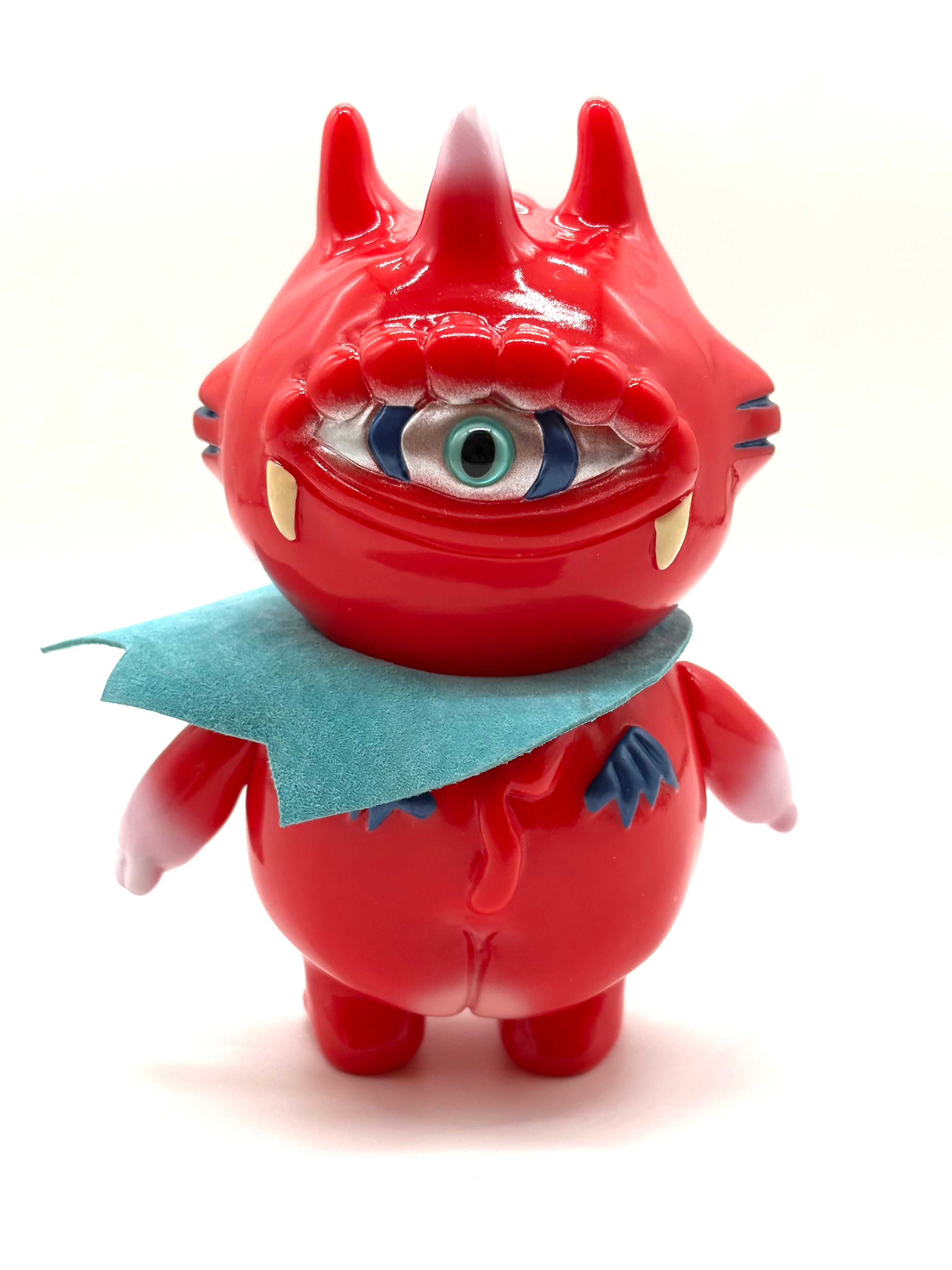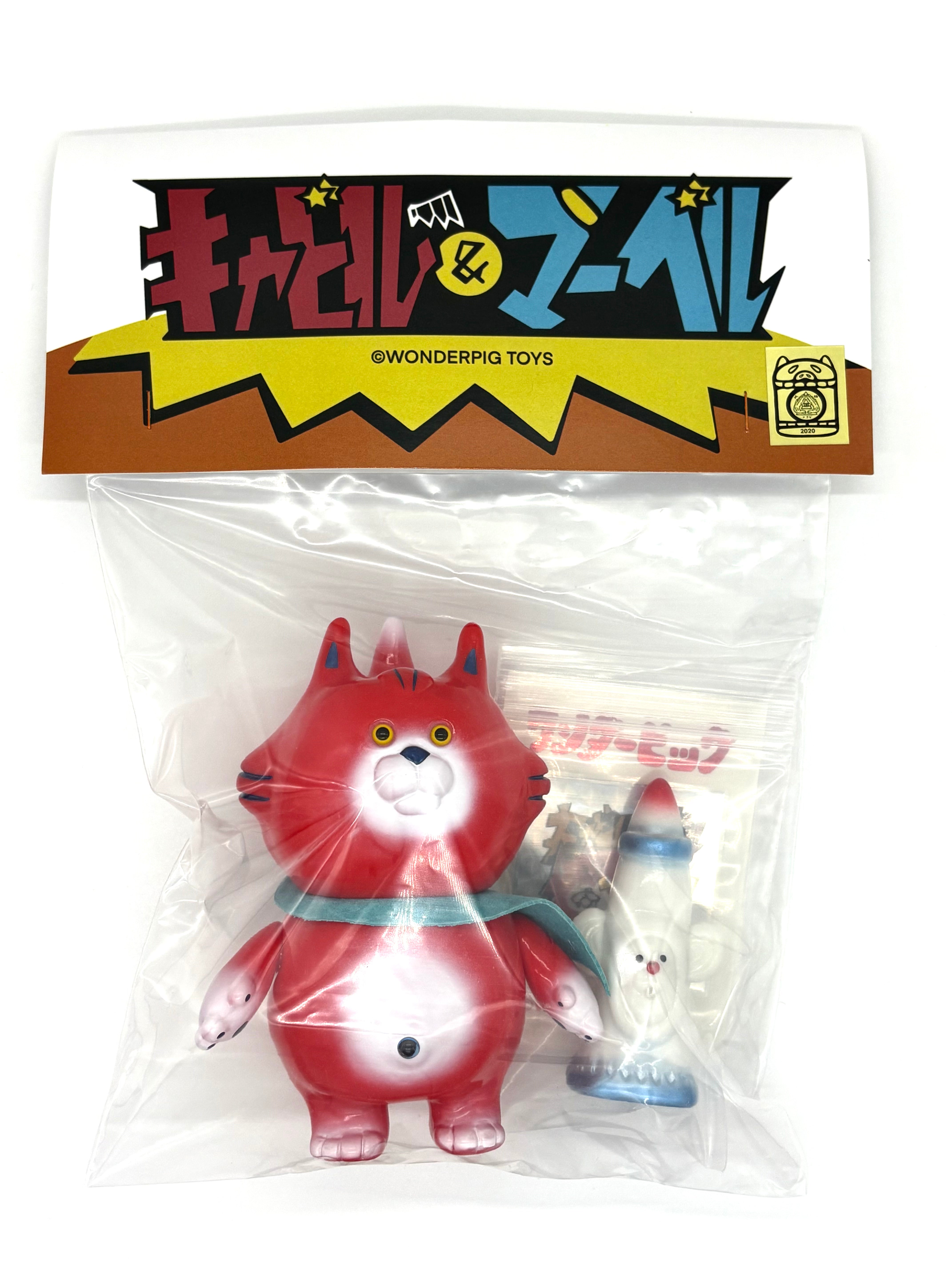丸みを帯びた愛らしい体型と赤いカラーが特徴のキャラクター。表情豊かな猫の顔と、背面にはサプライズ要素の一つ目モンスターの顔が隠されています。
