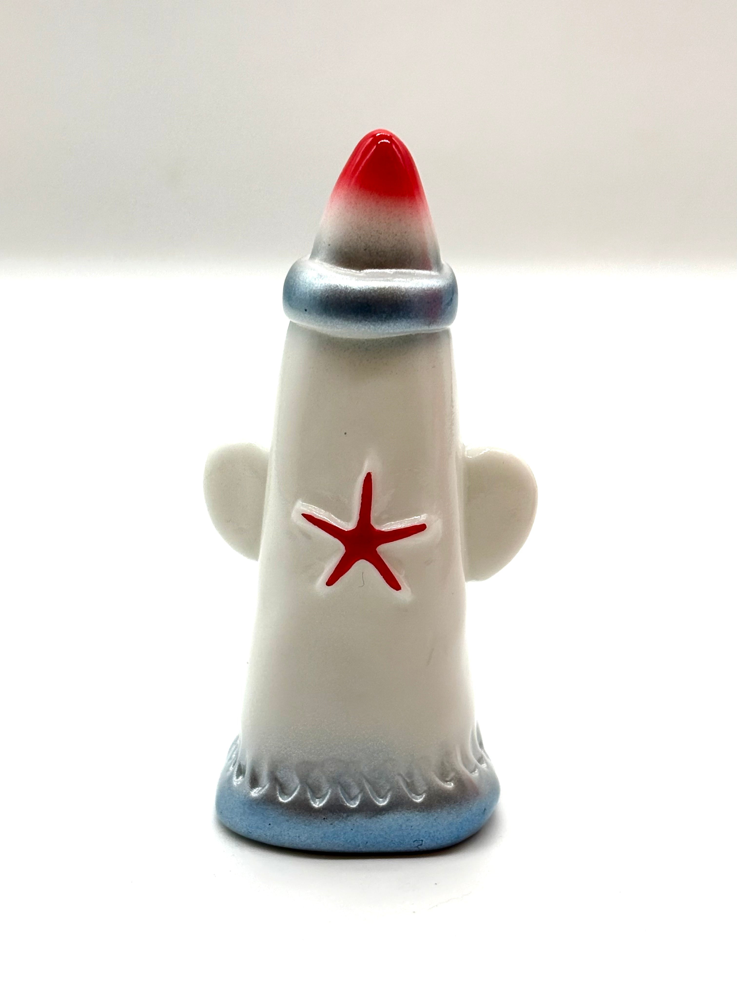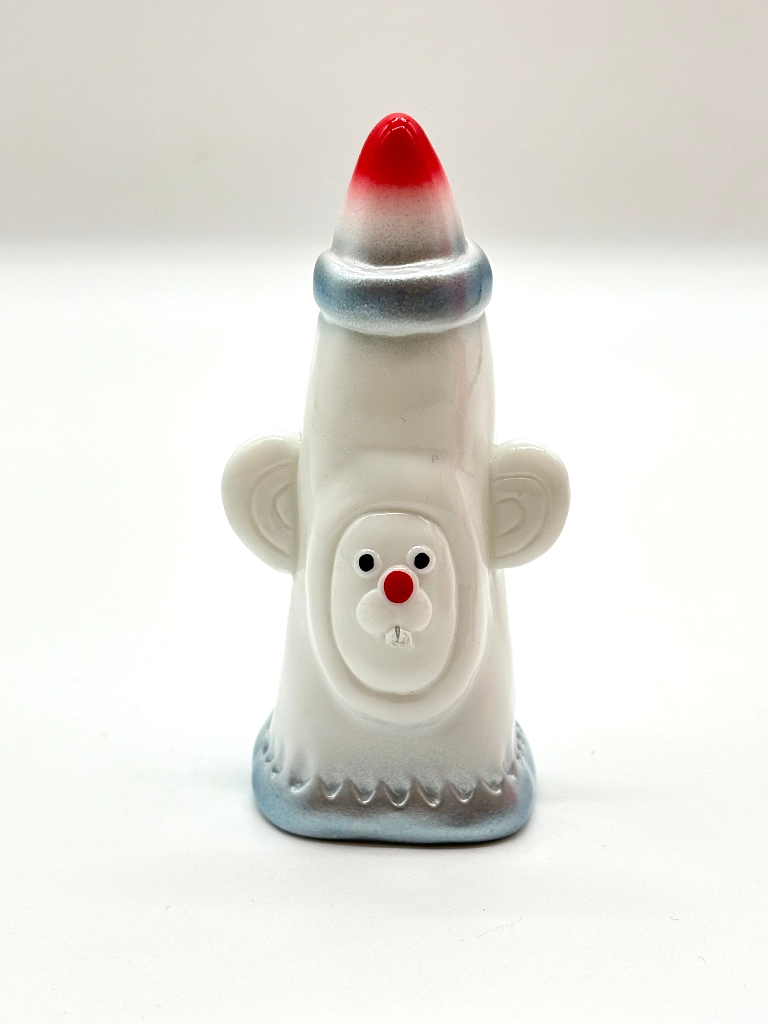 小型でユニークなデザインのキャラクター。ロケットのような形状に、愛嬌のあるクマの顔が配置されています。