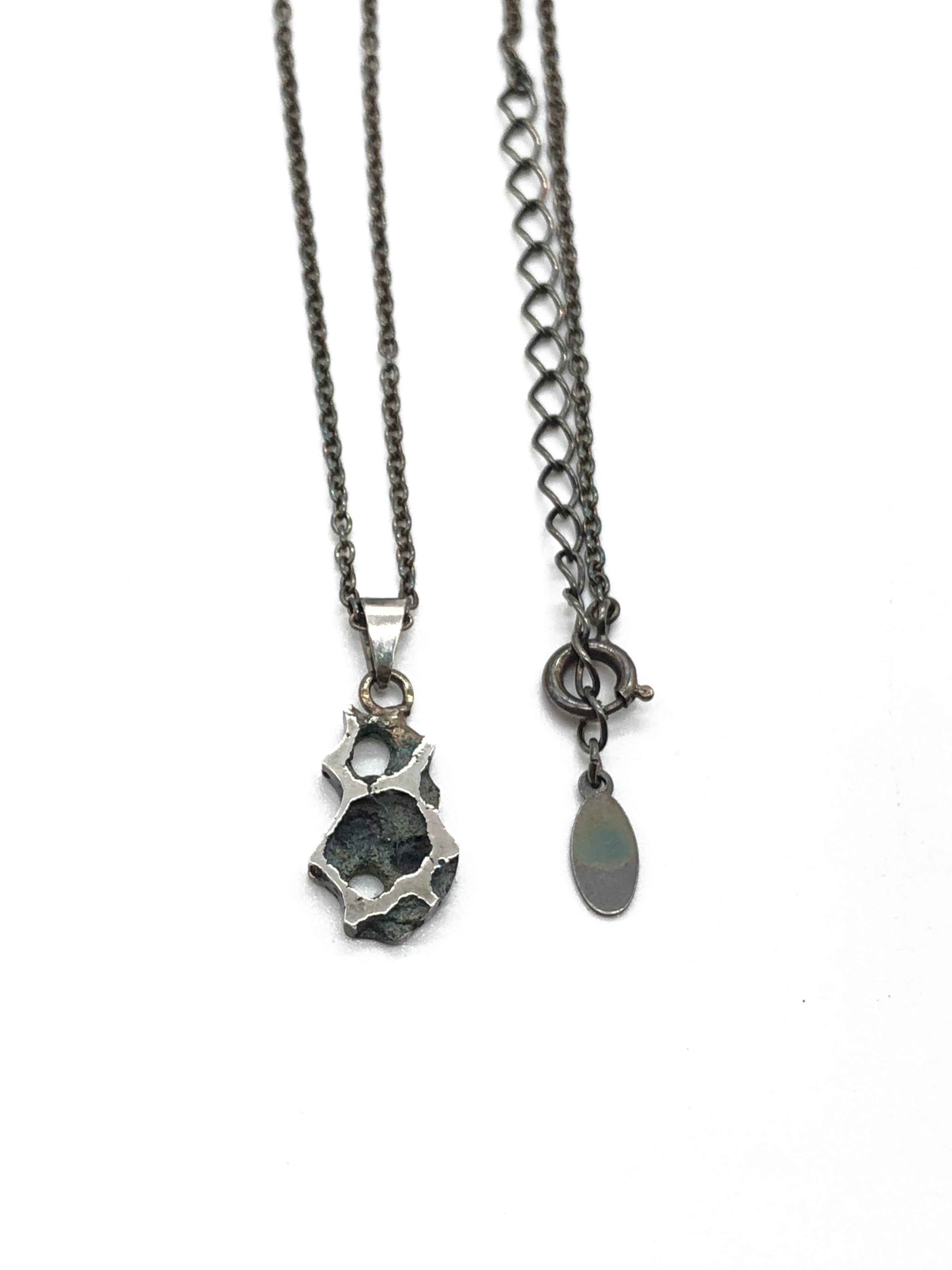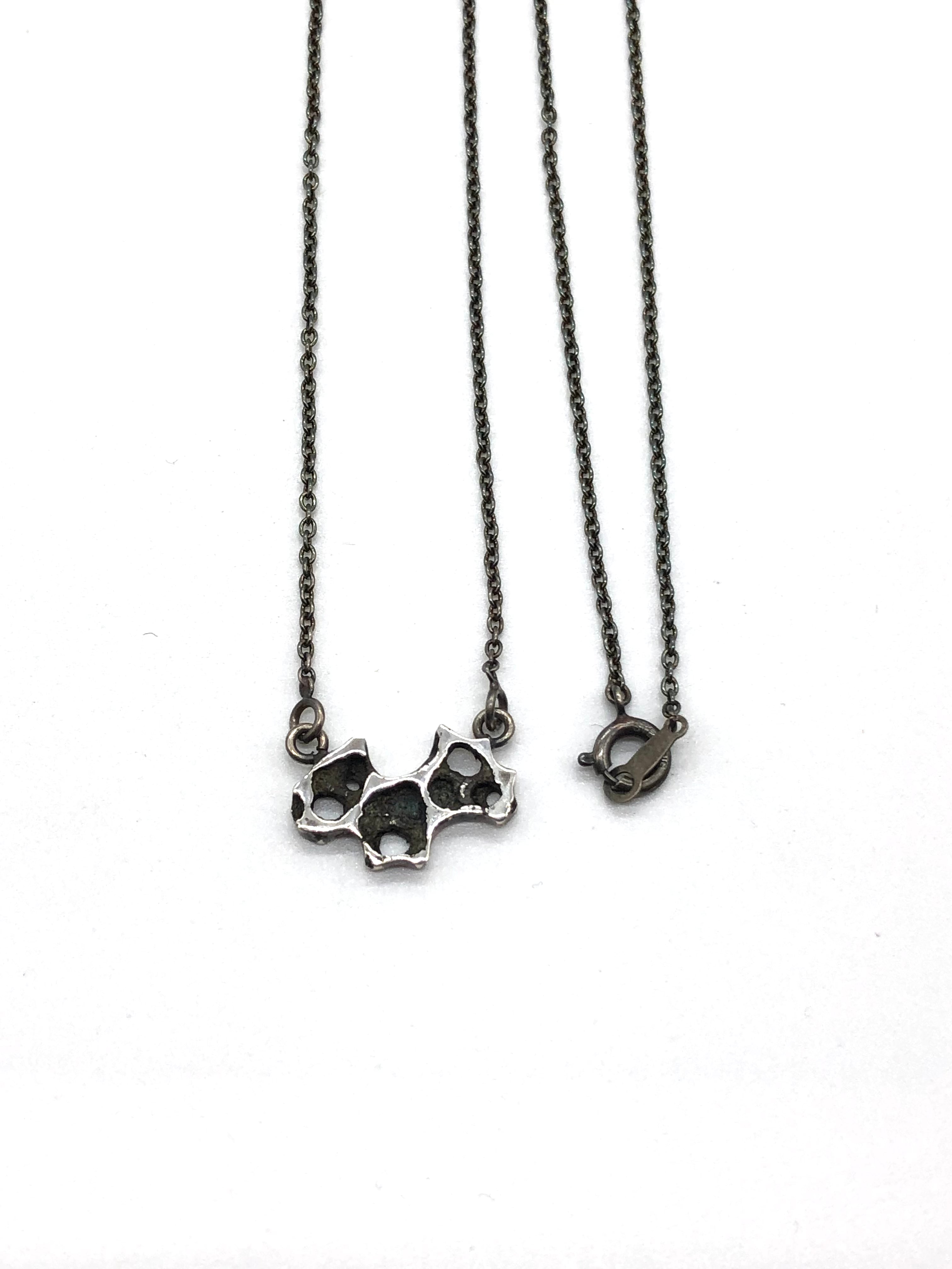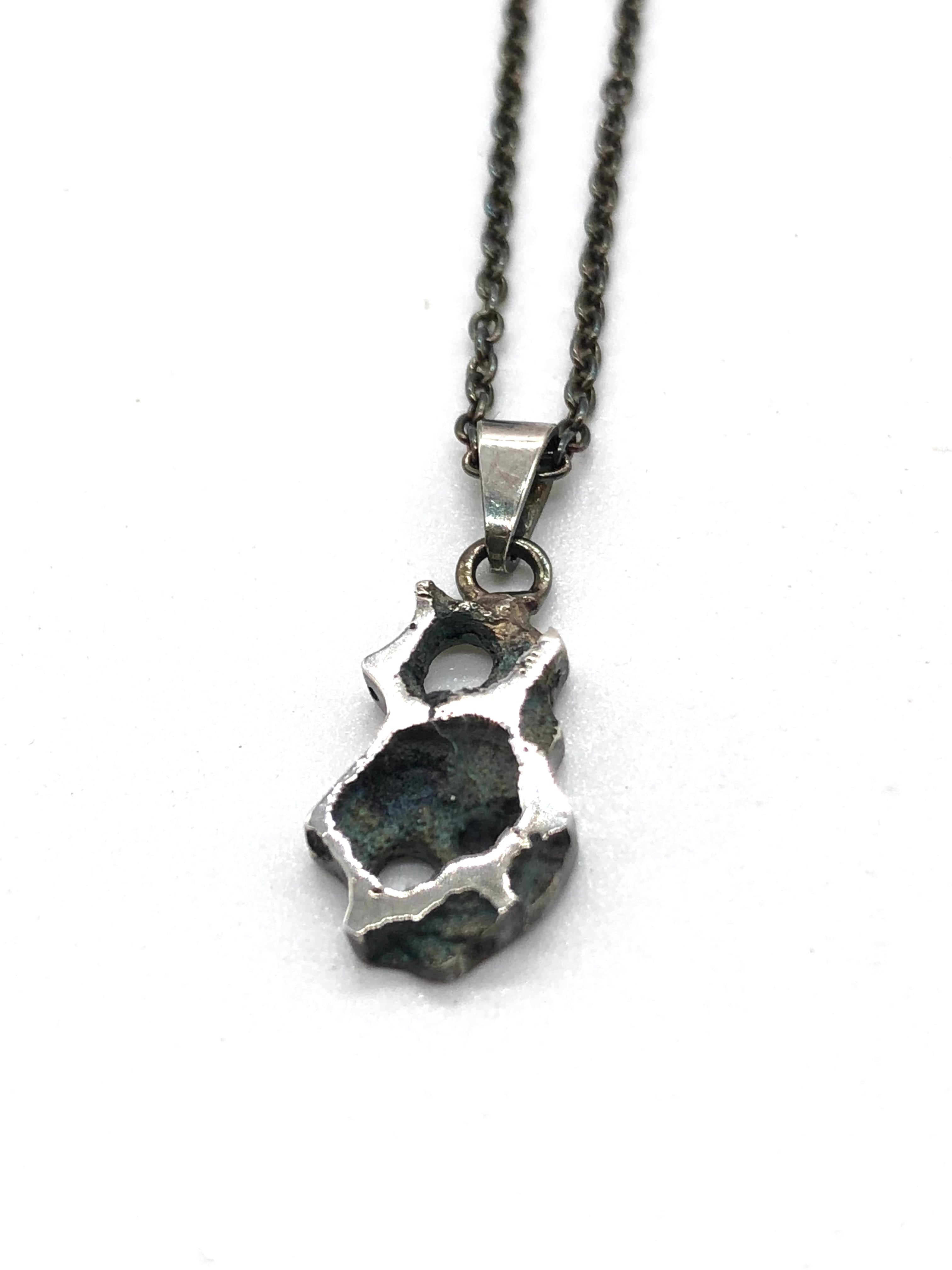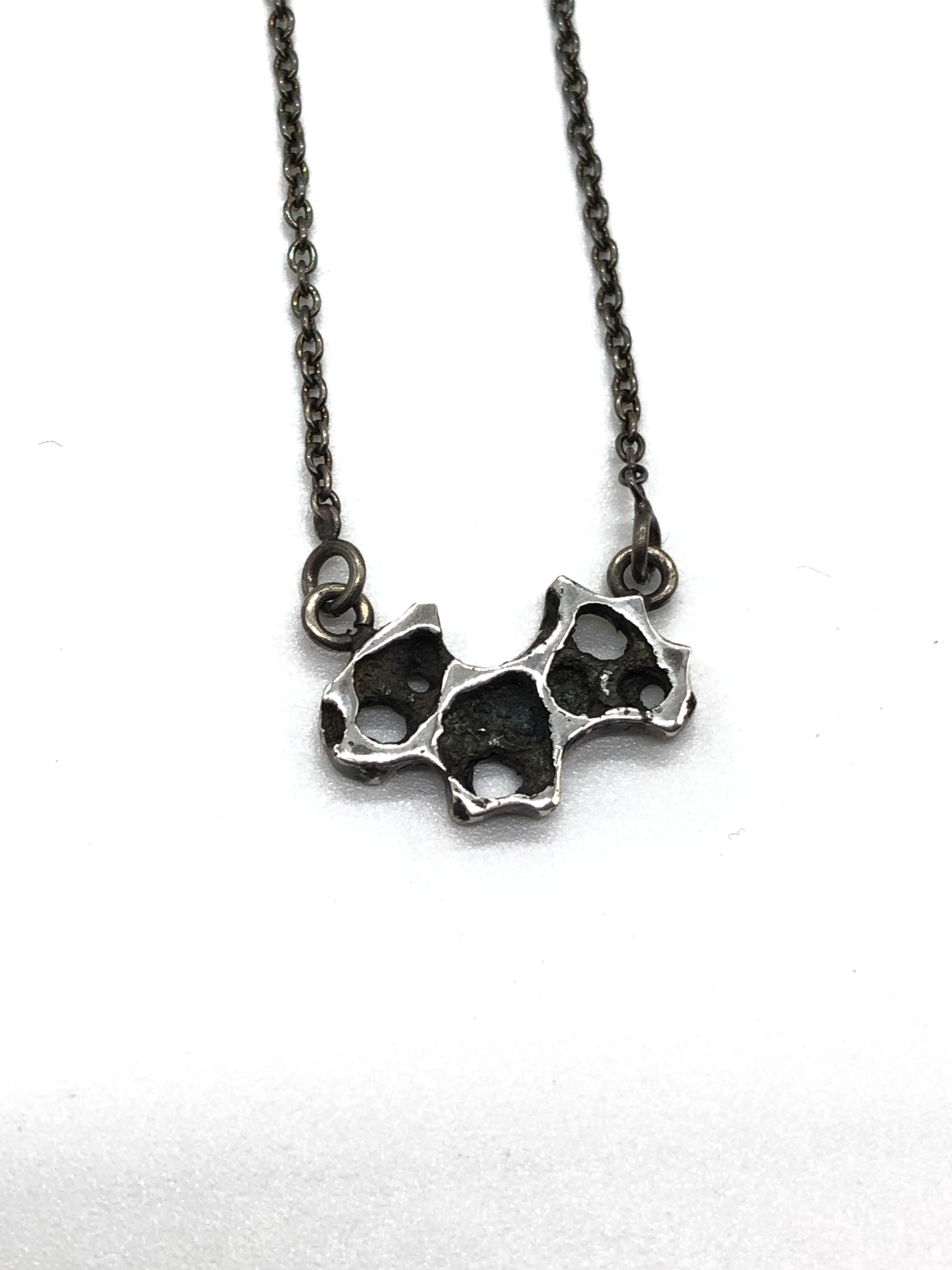 踏みしめた跡にまた踏みしめられて段差になっていく地面の模様をモチーフにデザインしたペンダント。一つの痕跡の塊から切り離してそれぞれのジュエリーになっています。