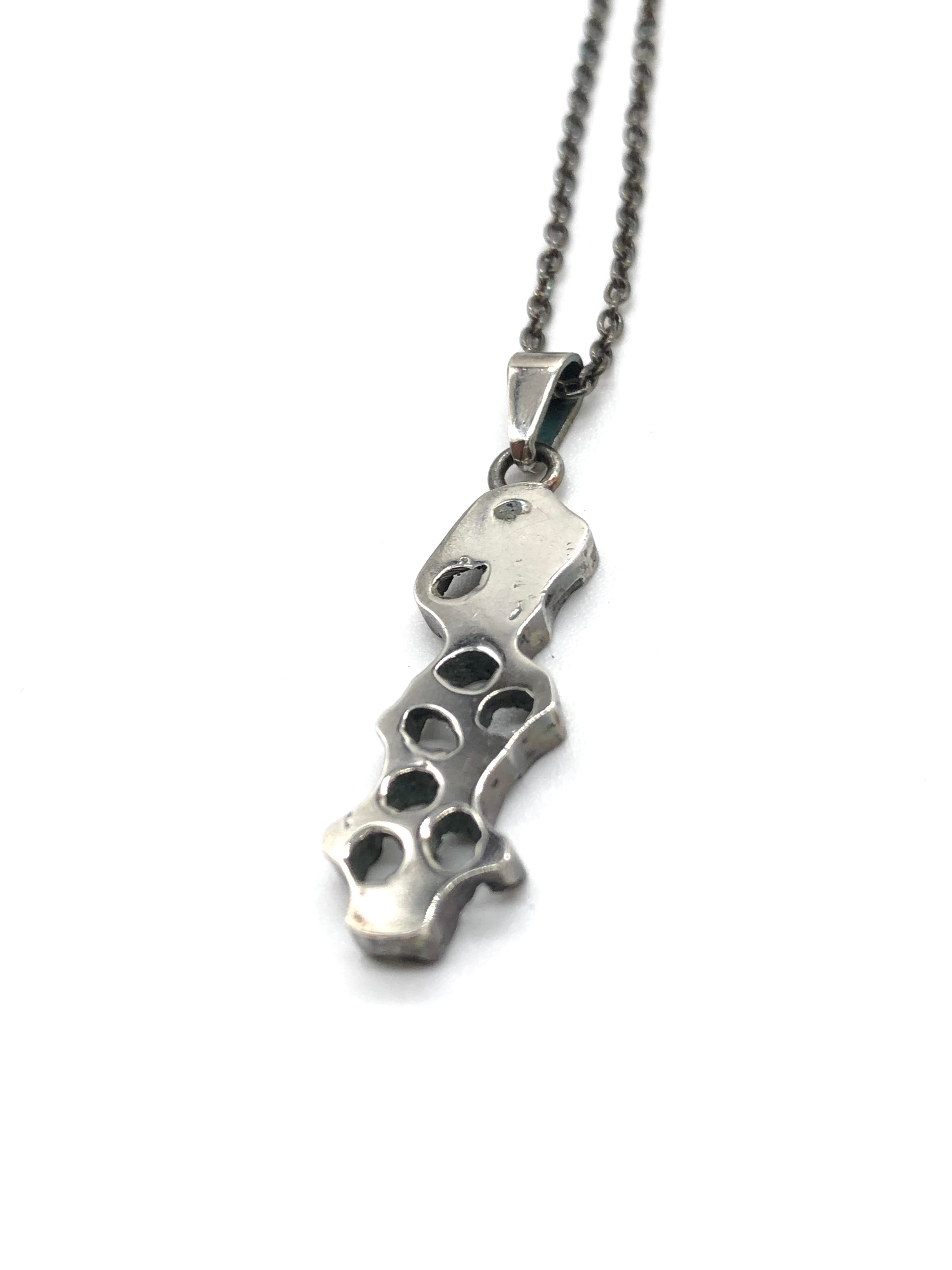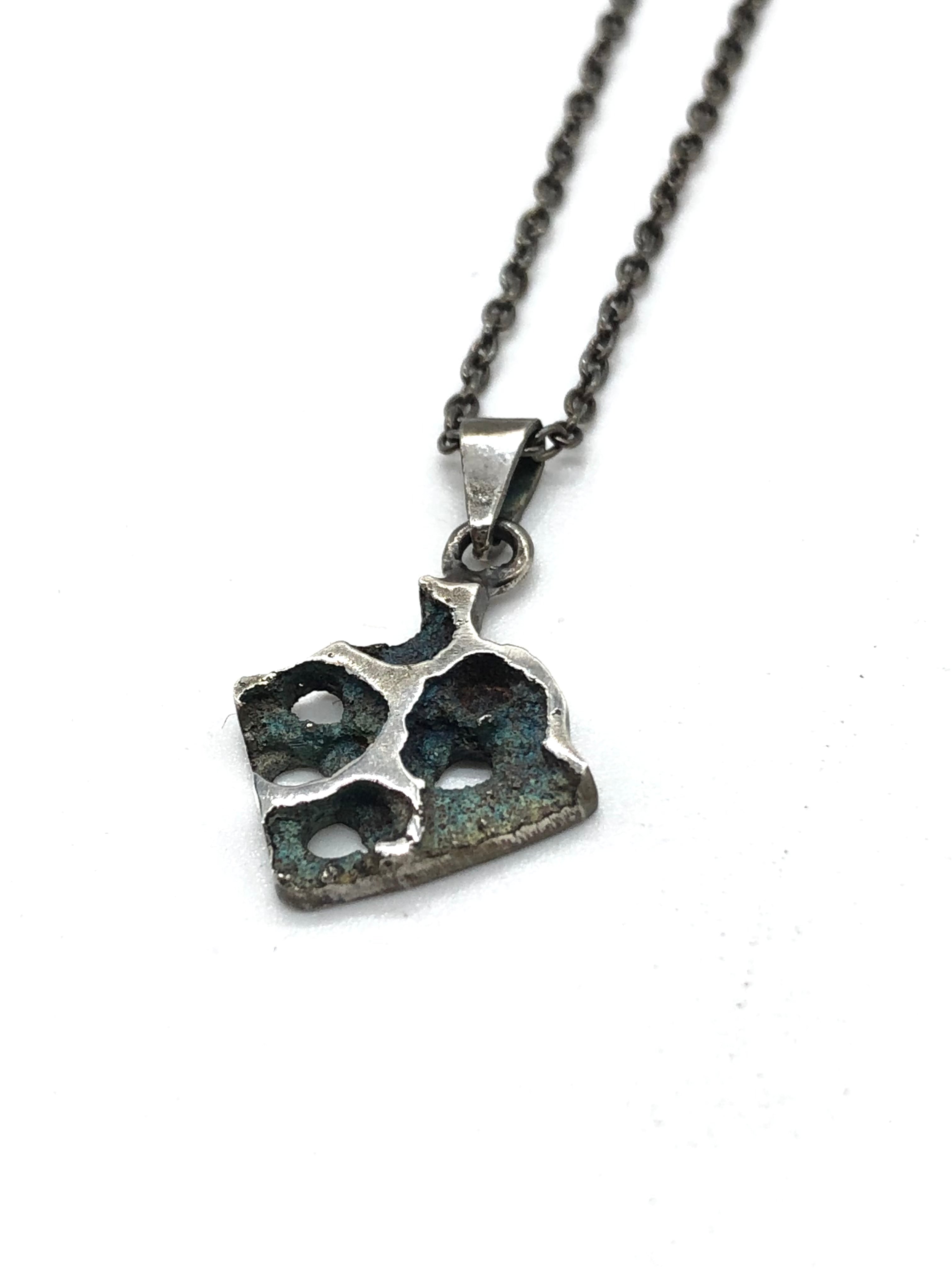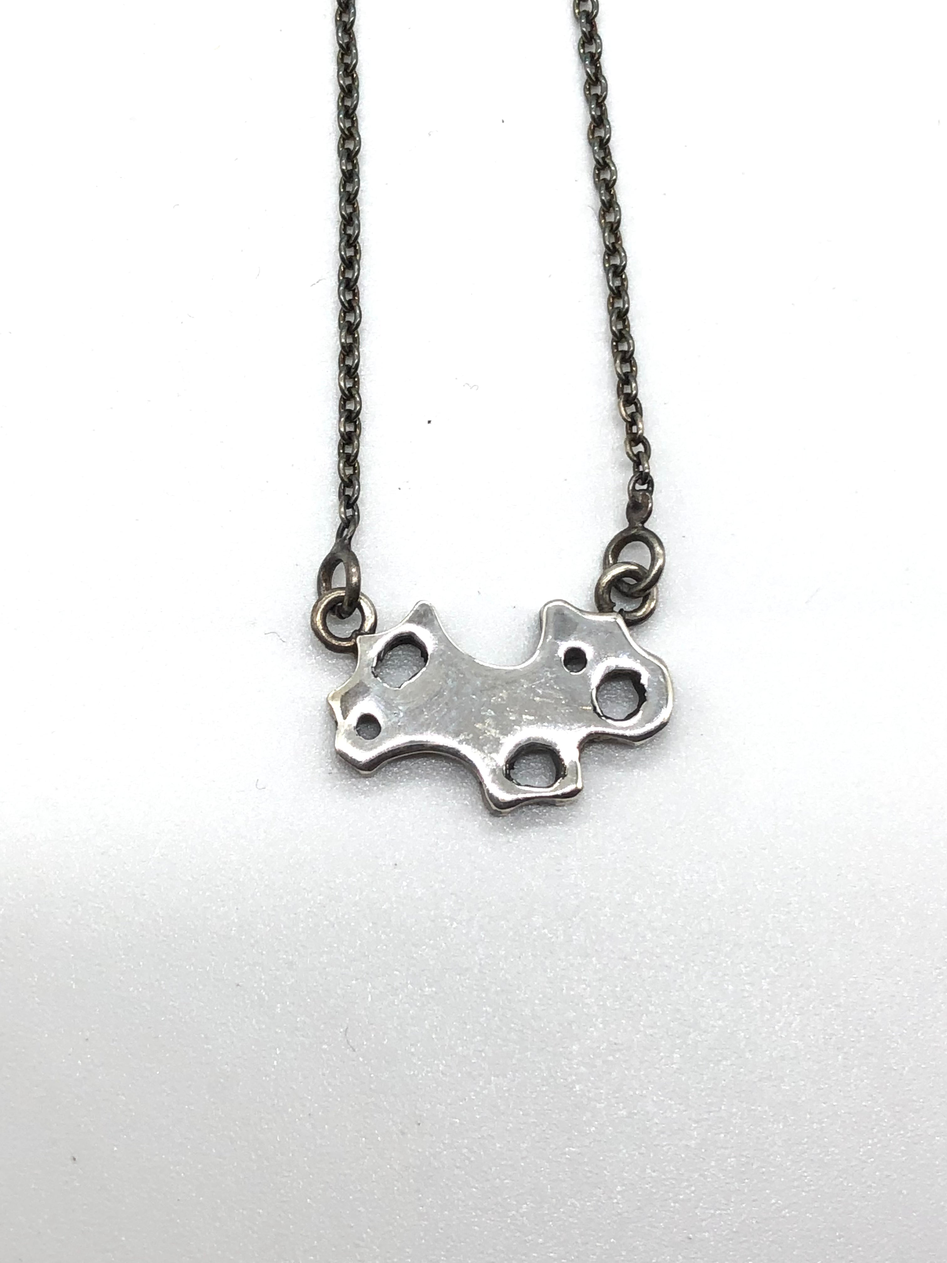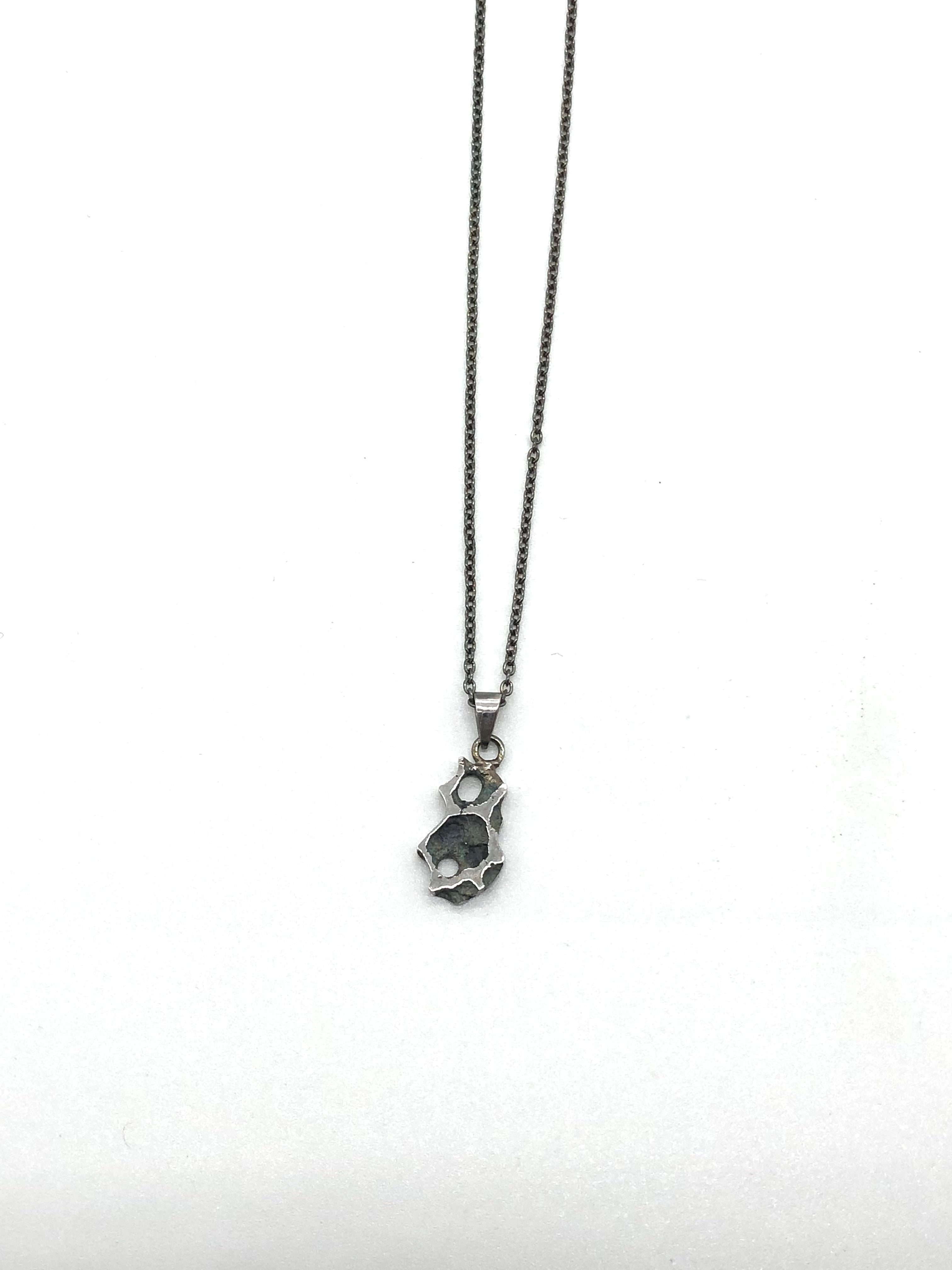 踏みしめた跡にまた踏みしめられて段差になっていく地面の模様をモチーフにデザインしたペンダント。一つの痕跡の塊から切り離してそれぞれのジュエリーになっています。