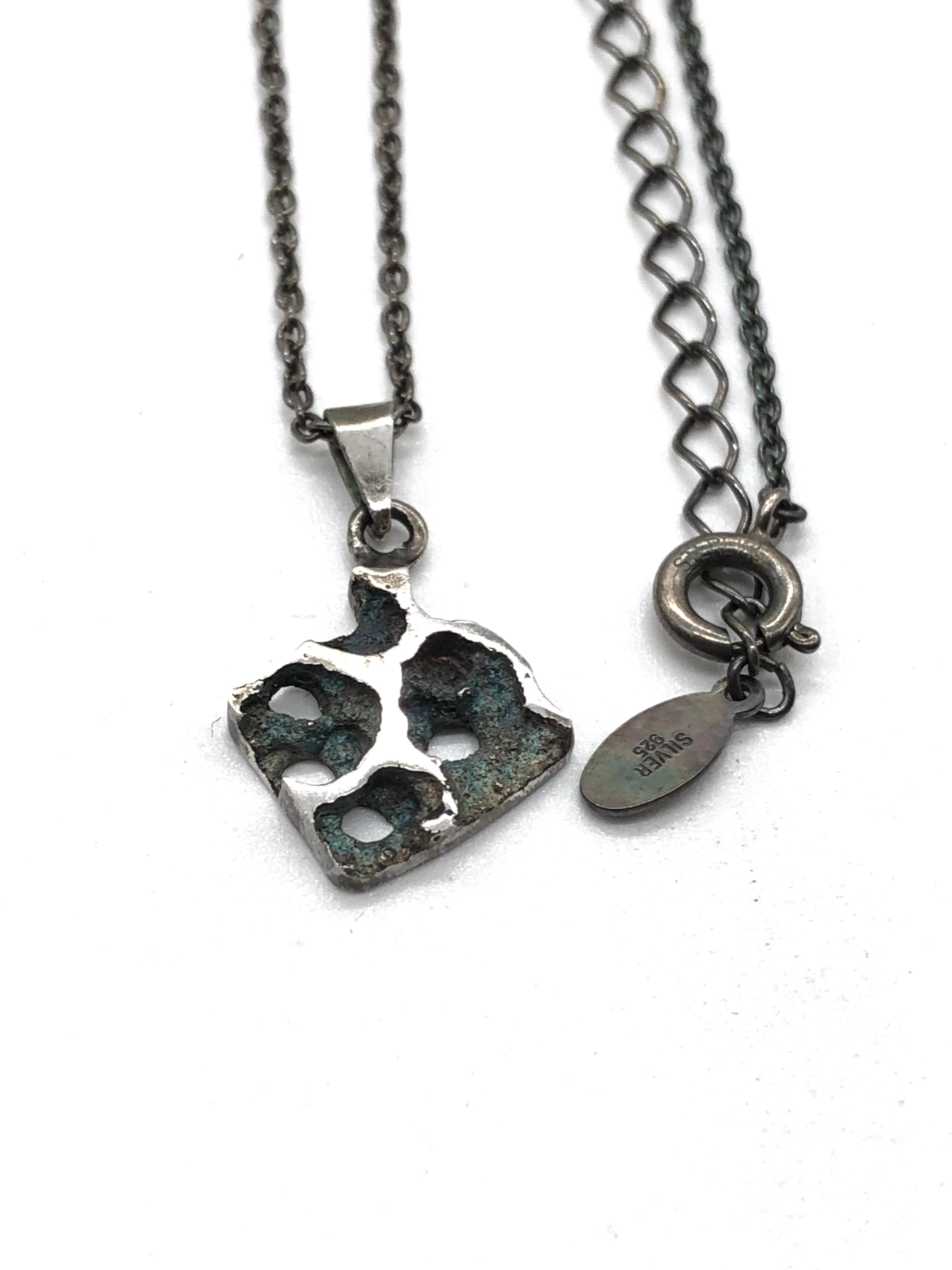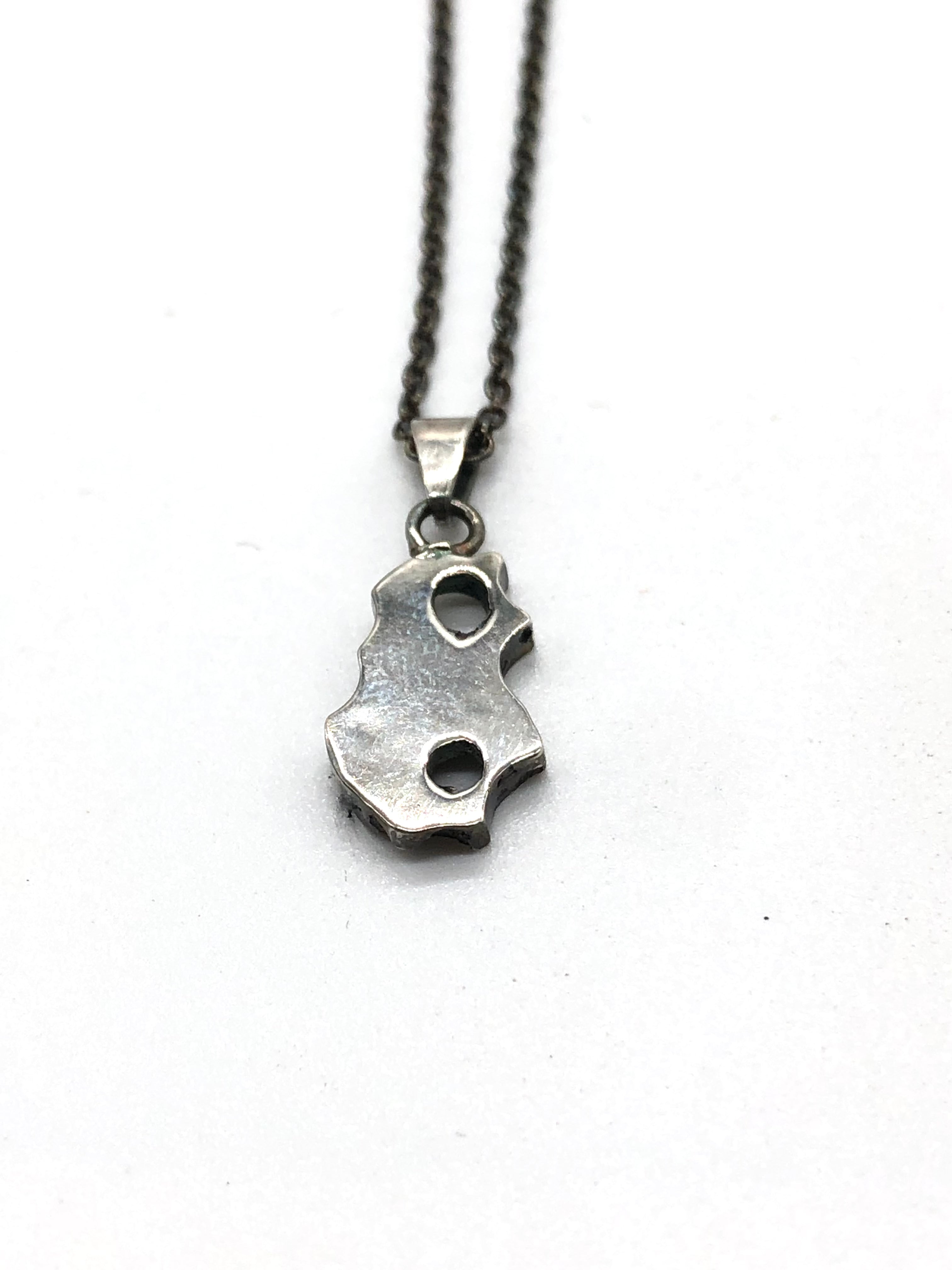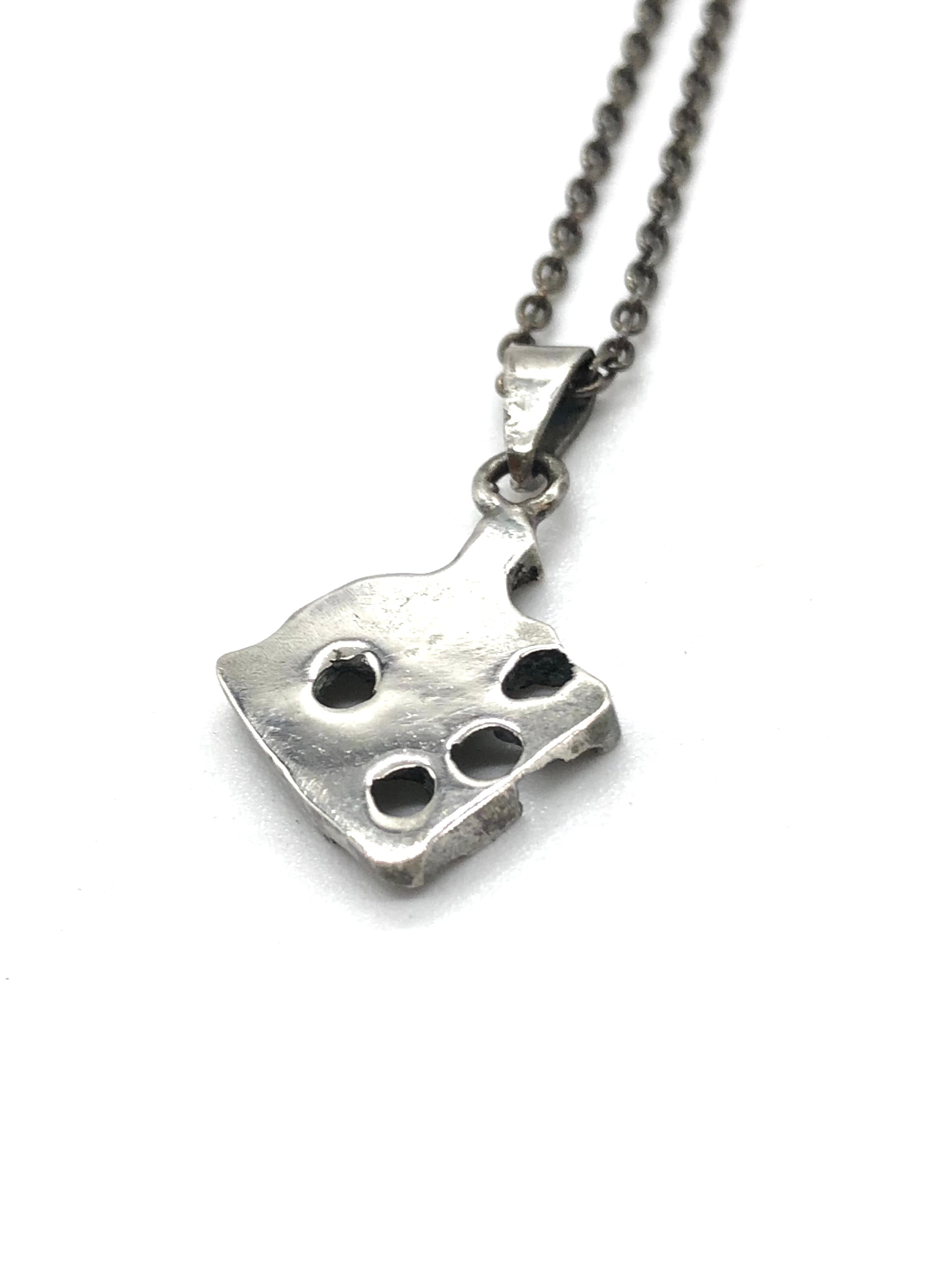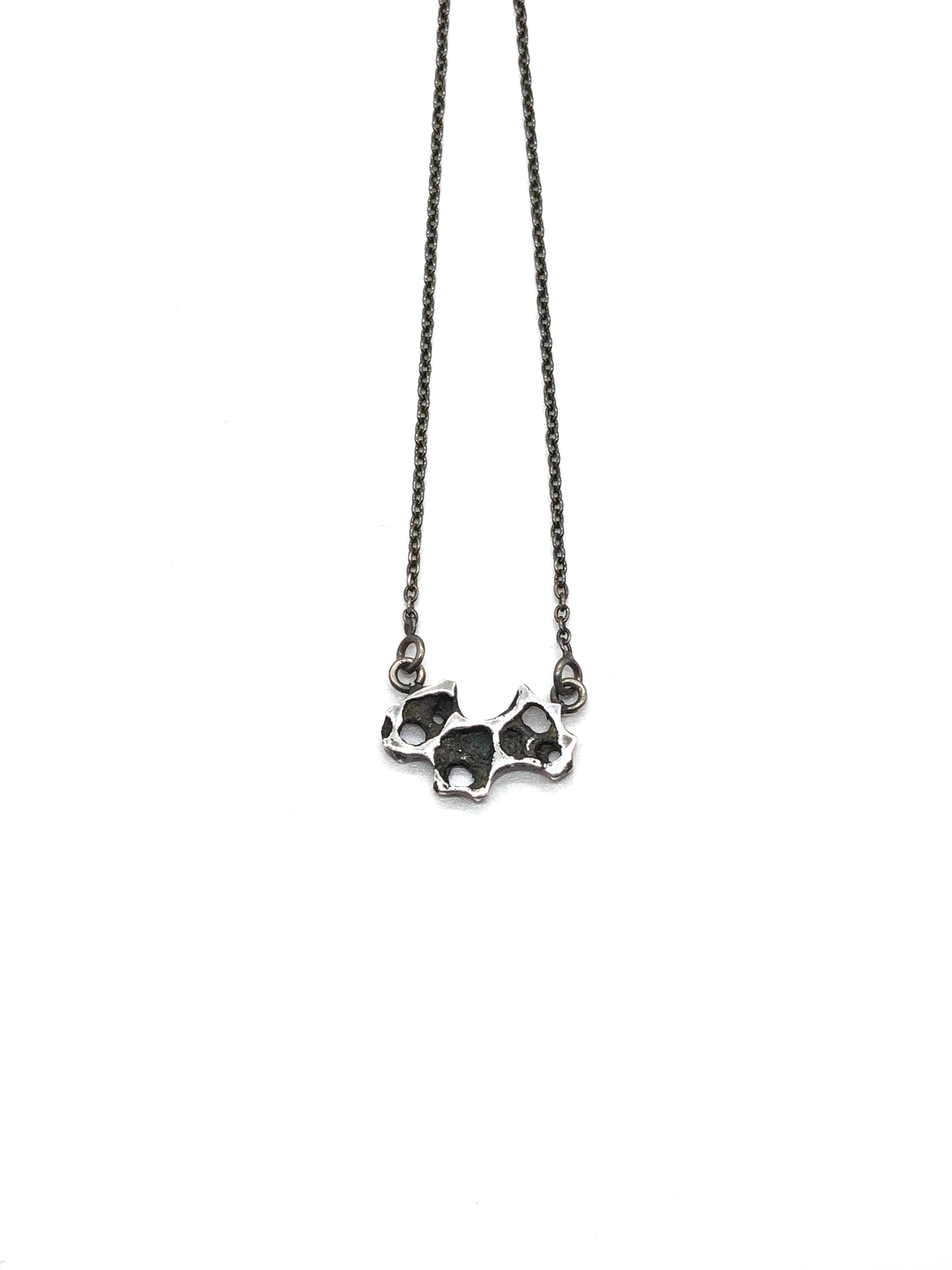踏みしめた跡にまた踏みしめられて段差になっていく地面の模様をモチーフにデザインしたペンダント。一つの痕跡の塊から切り離してそれぞれのジュエリーになっています。