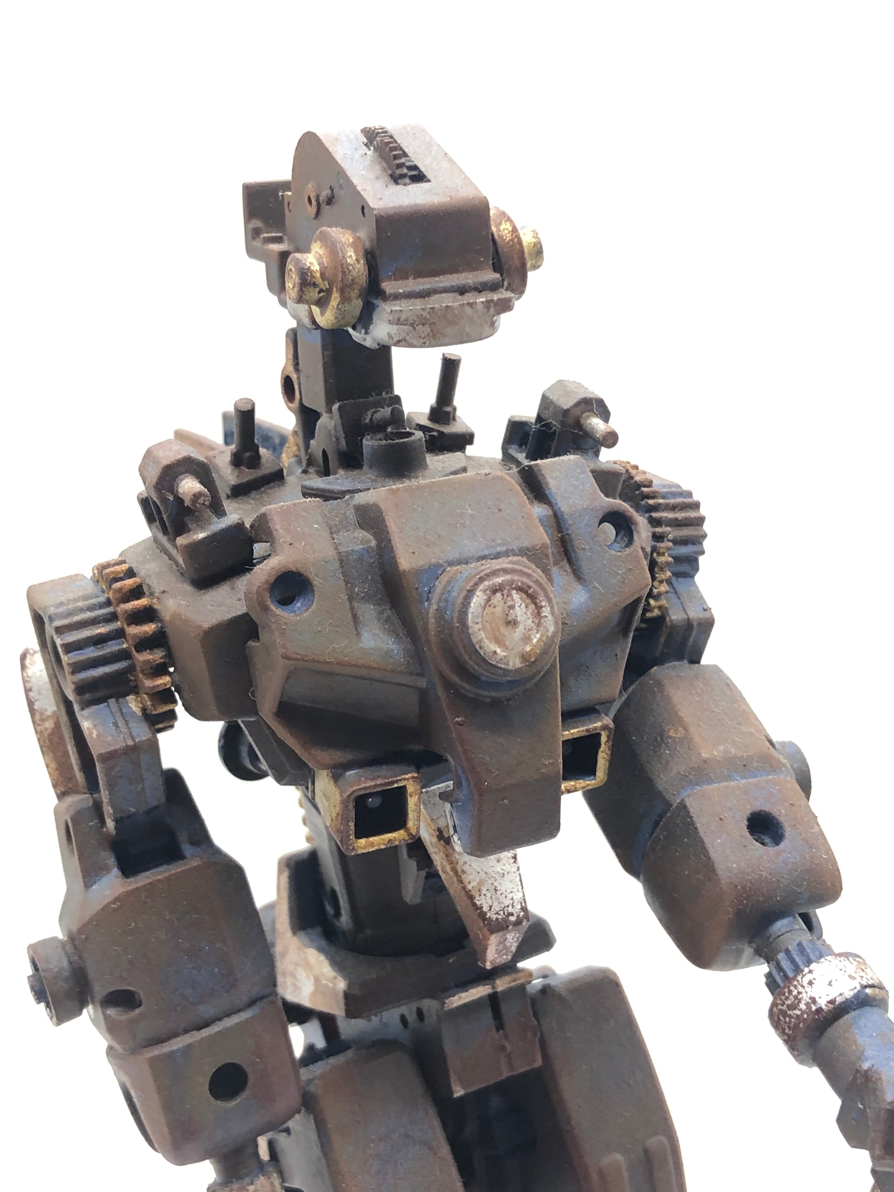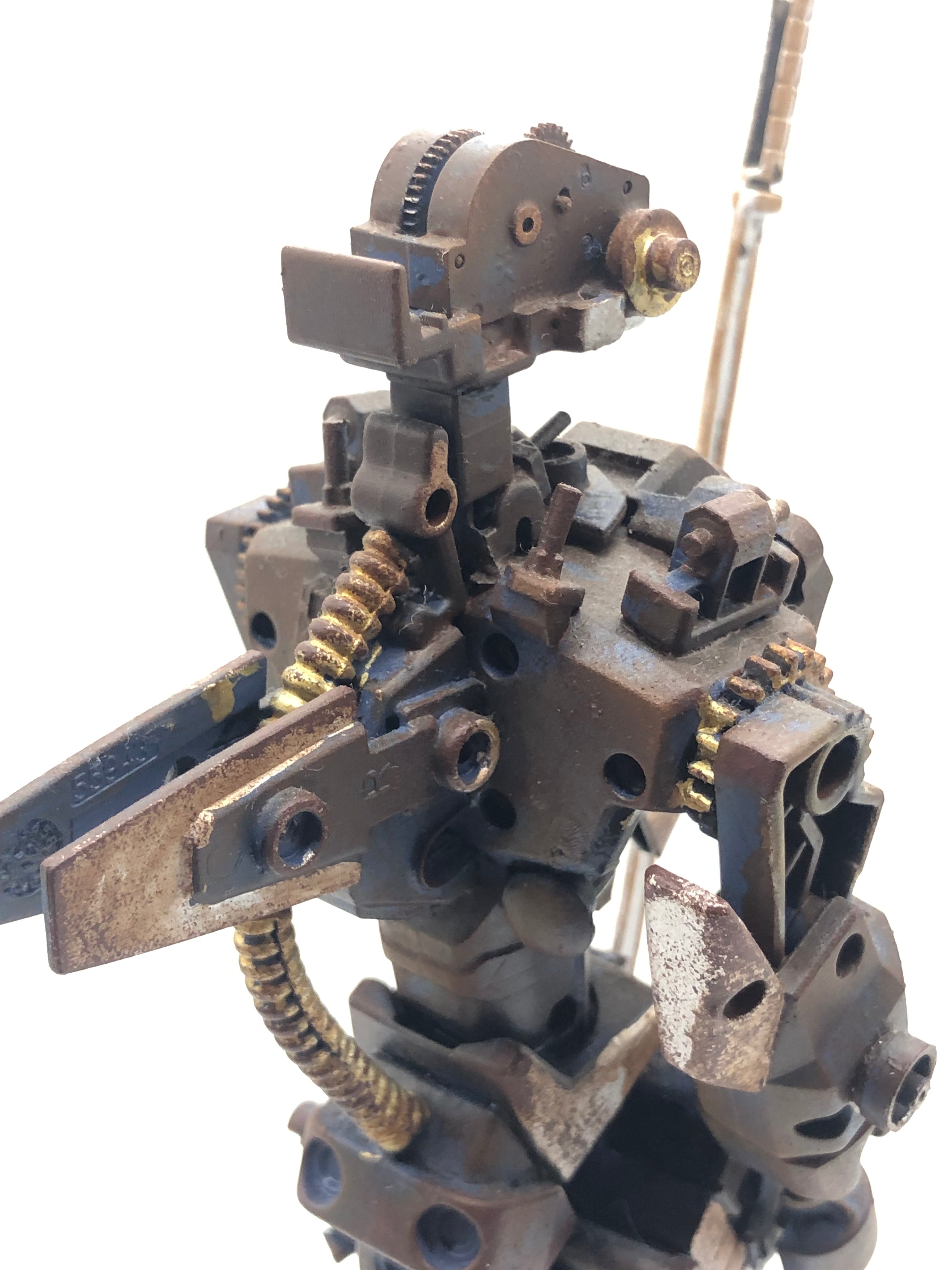 頭部のシンプルなデザインや胴体の精巧な歯車の配置は、技術と原始性の融合を表現しています。